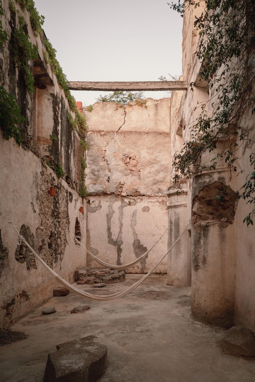 Amenities at Hacienda El Aguacate include two pools, a hot tub, a paddle court, a soccer field, a chapel, WiFi, a full kitchen, a fireplace, river access, and a courtyard pool and jacuzzi set within the ruins, complemented by indoor/outdoor lounges, a hammock terrace, and daily cleaning service.