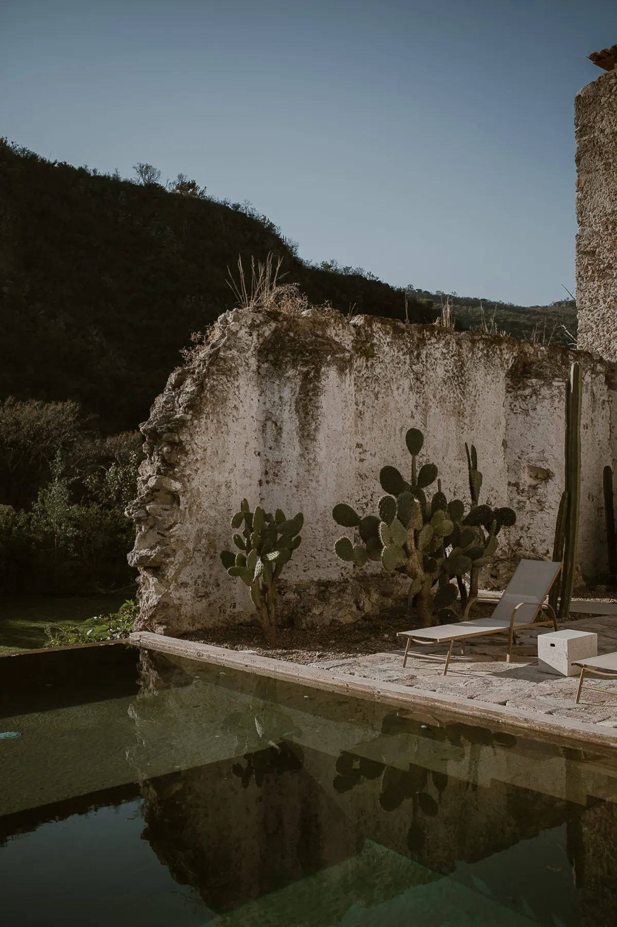 The estate offers two pools: an intimate courtyard pool and jacuzzi set within the original foundations, and a dramatic, 25-meter lap pool perched on an upper ridge, offering panoramic 360-degree views of the semi-desert landscape.
