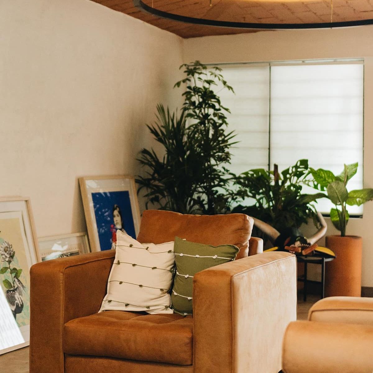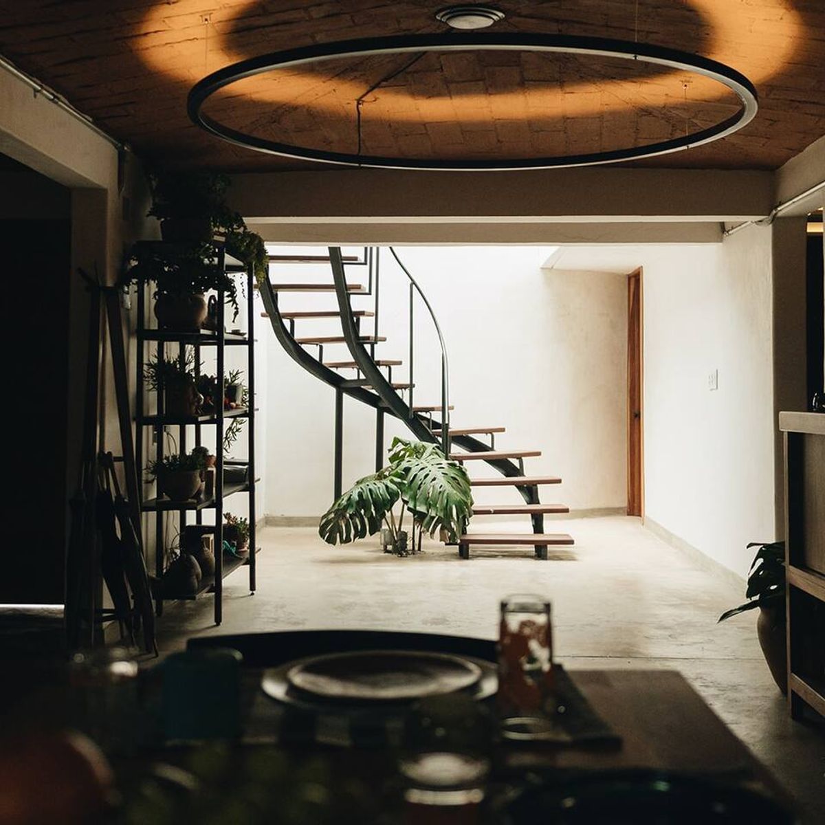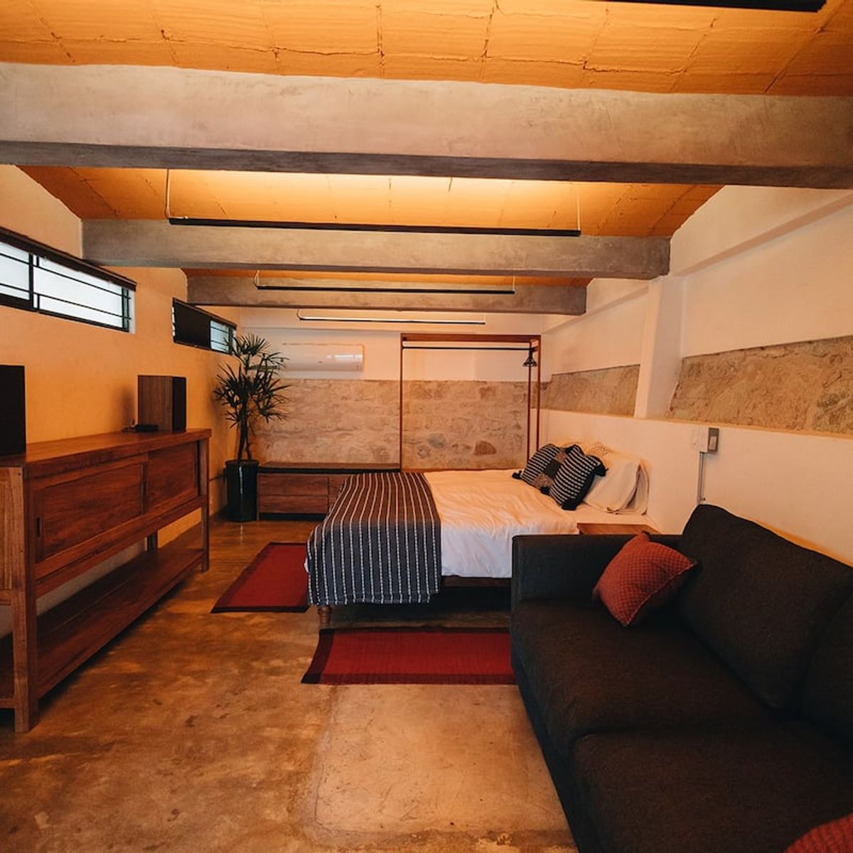 As guests step into the backyard, they might forget they are in the middle of Oaxaca city and think they have traveled into a jungle. On the first level of the outdoor space, local herbs are available for tea, cooking, or making the space smell amazing. Two large nut trees cover the space, and guests are free to park a car if they wish. The main event of the backyard is the Cocina de Humo, a traditional outdoor brick and clay kitchen made in the style of the owners' Grandmother's outdoor kitchen. If guests would like a meal prepared in this outdoor kitchen, they can make a request. As guests descend one level outside of the downstairs Master Bedroom, they will find a social area from which to make plans or discuss favorite parts of the day under the Oaxacan Clouds. Behind this space is a collection of dessert plants, including Maguey Espadin, Madre Cuish, cacti, and other local varieties of plants. One level further down, guests will find an enclosed lush and green patio space that makes the perfect backdrop for envy-inducing pictures.