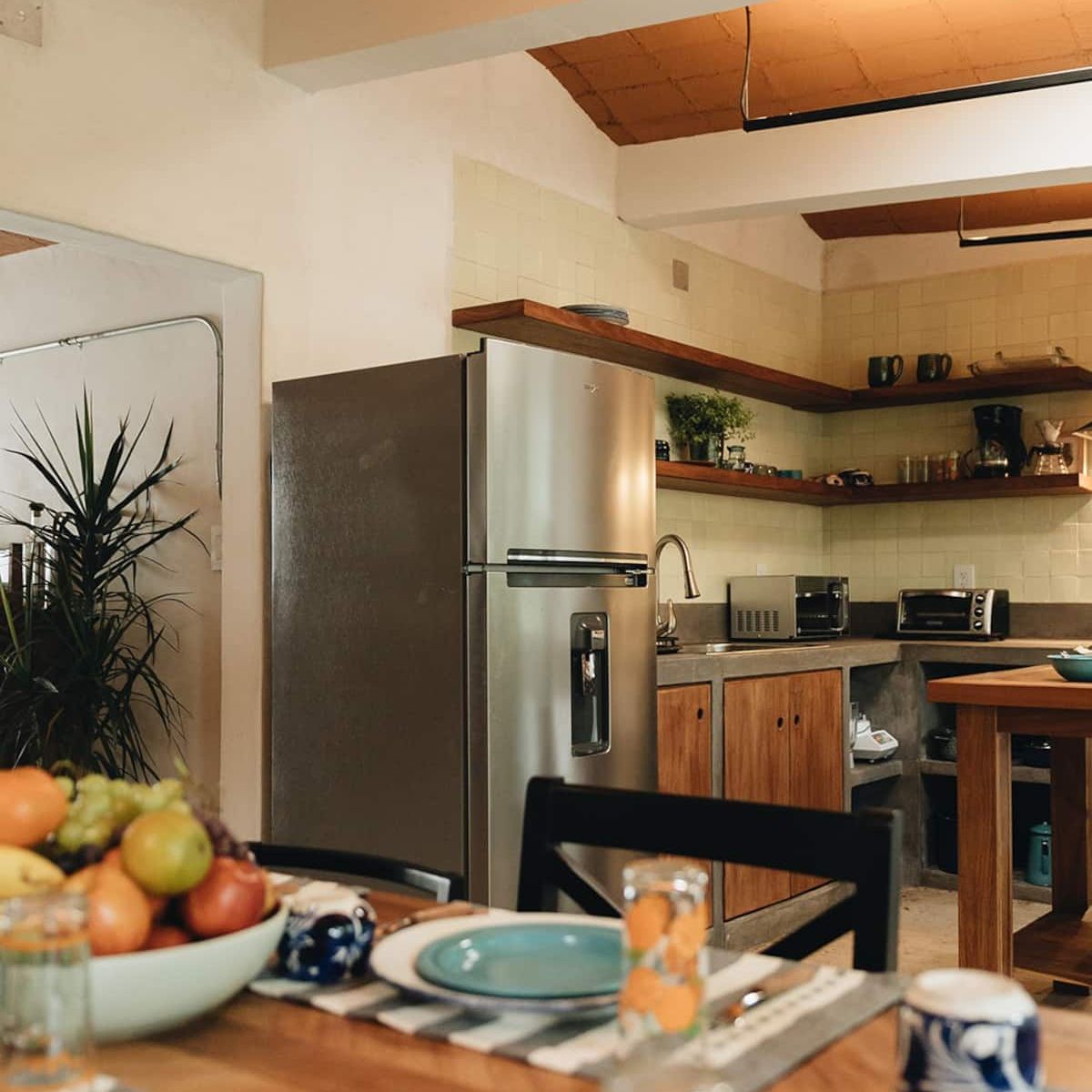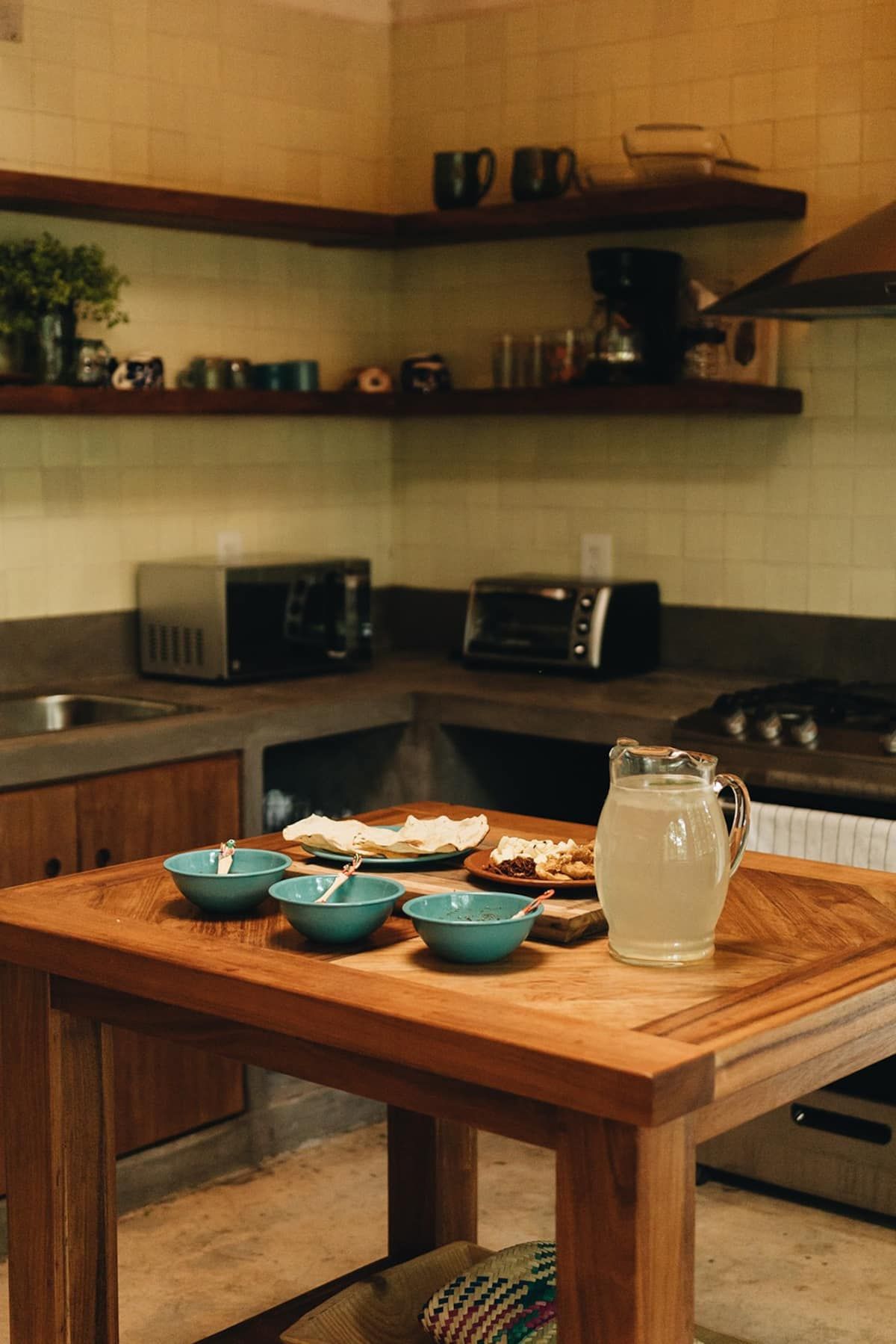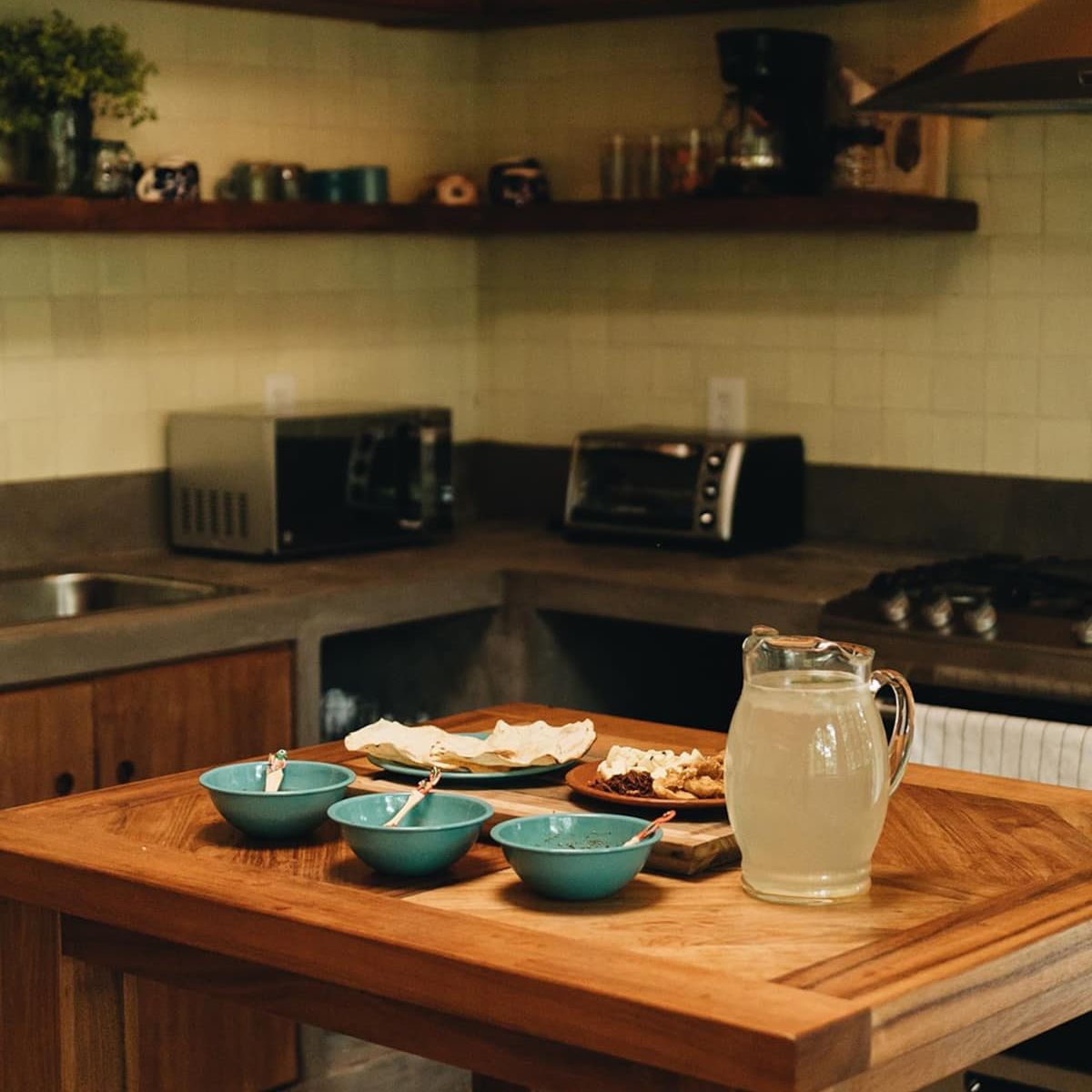 Upon entering 228, guests are welcomed by a fresh agua fresca, a botana of Oaxacan flavors, and Mezcal from some of the favorite Maestro Mezcaleros. The fully equipped kitchen allows guests to prepare delightful meals with ingredients from the local Mercado. Modern amenities include a drip coffee station, electric coffee maker, toaster oven, microwave, gas range and oven, and a refrigerator with a 3.75-liter water capacity for filtered water, filled daily. Fresh coffee, cut-up fresh fruit, and daily fresh bread are included with the stay. The living room features a 65" 4K TV with Apple Airplay & Chromecast connectivity, a surround sound JBL soundbar, and a large Air Conditioning unit for a cool respite. A well-stocked bar with Mezcal from preferred Mezcaleros invites guests to sample a variety of agaves from the comfort of their vacation home.