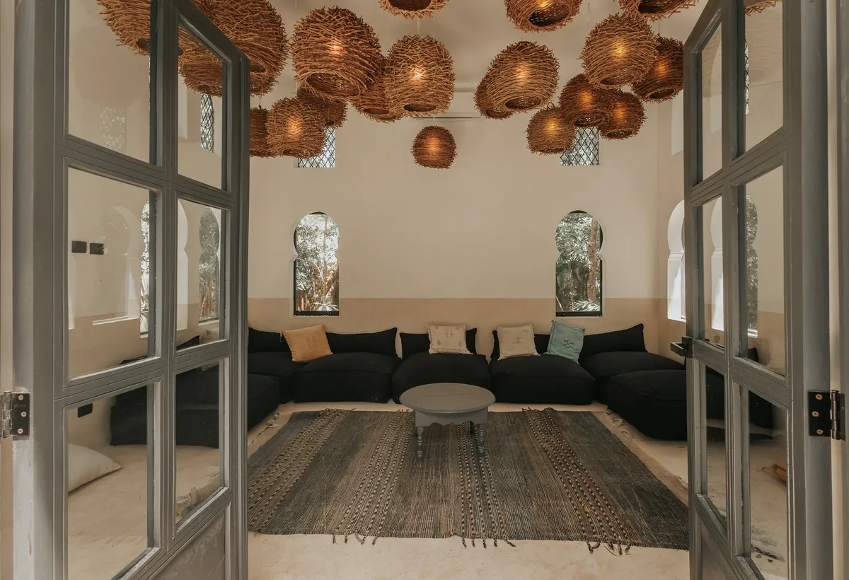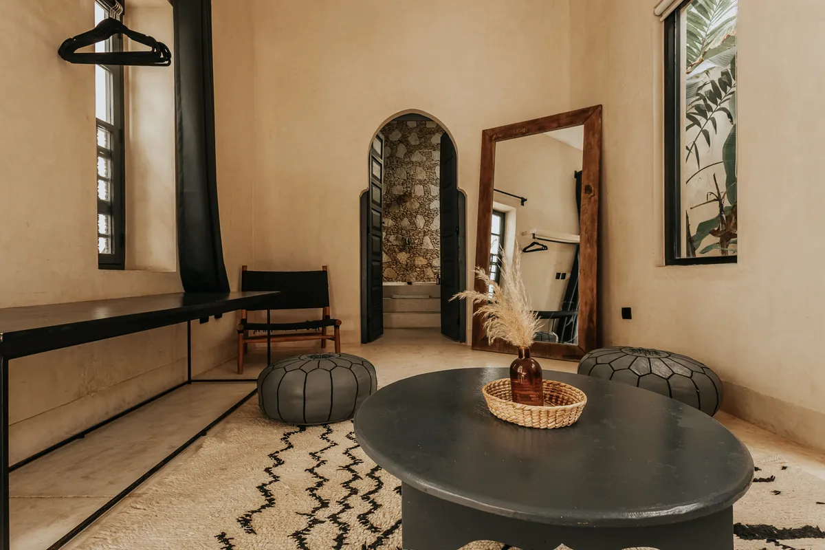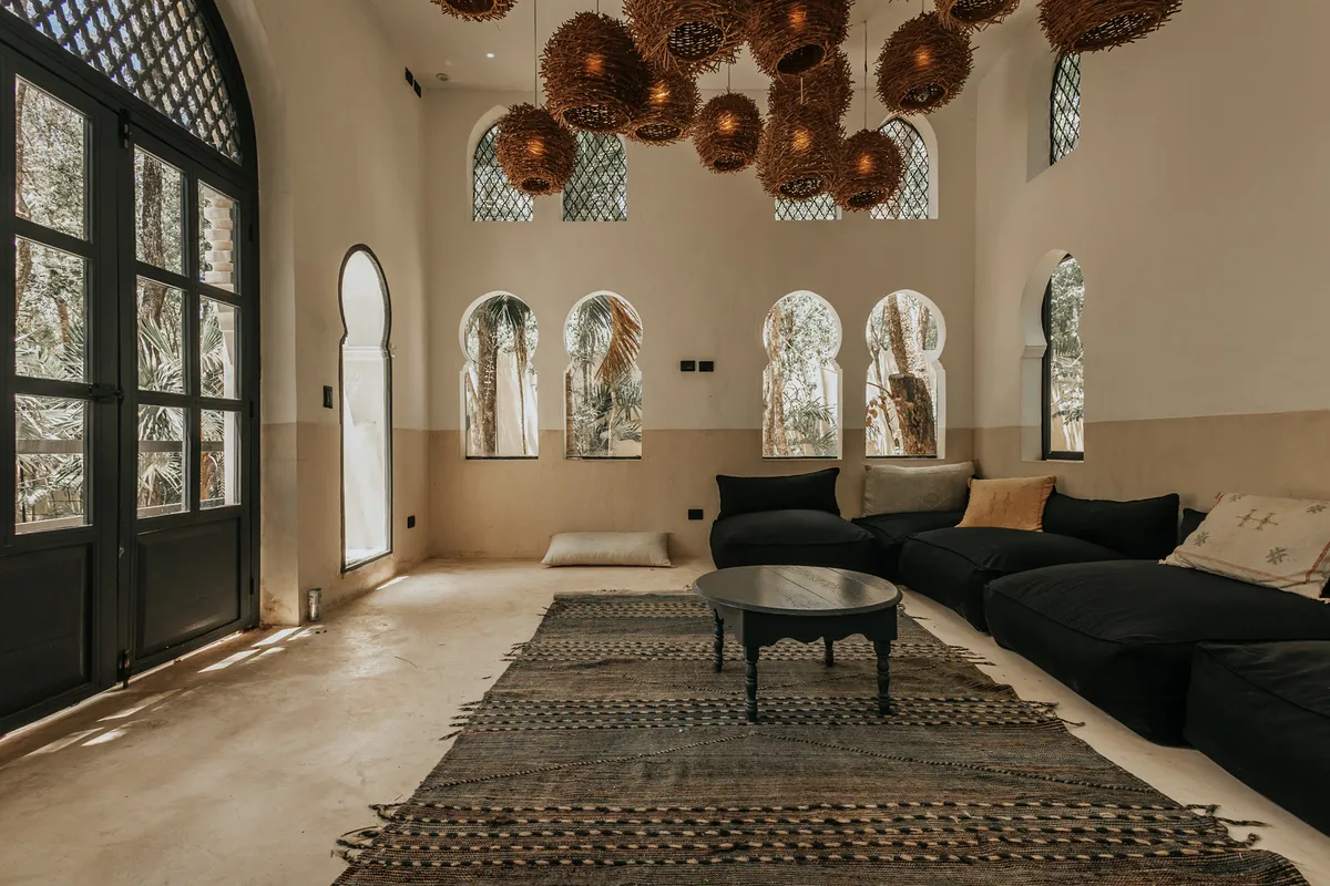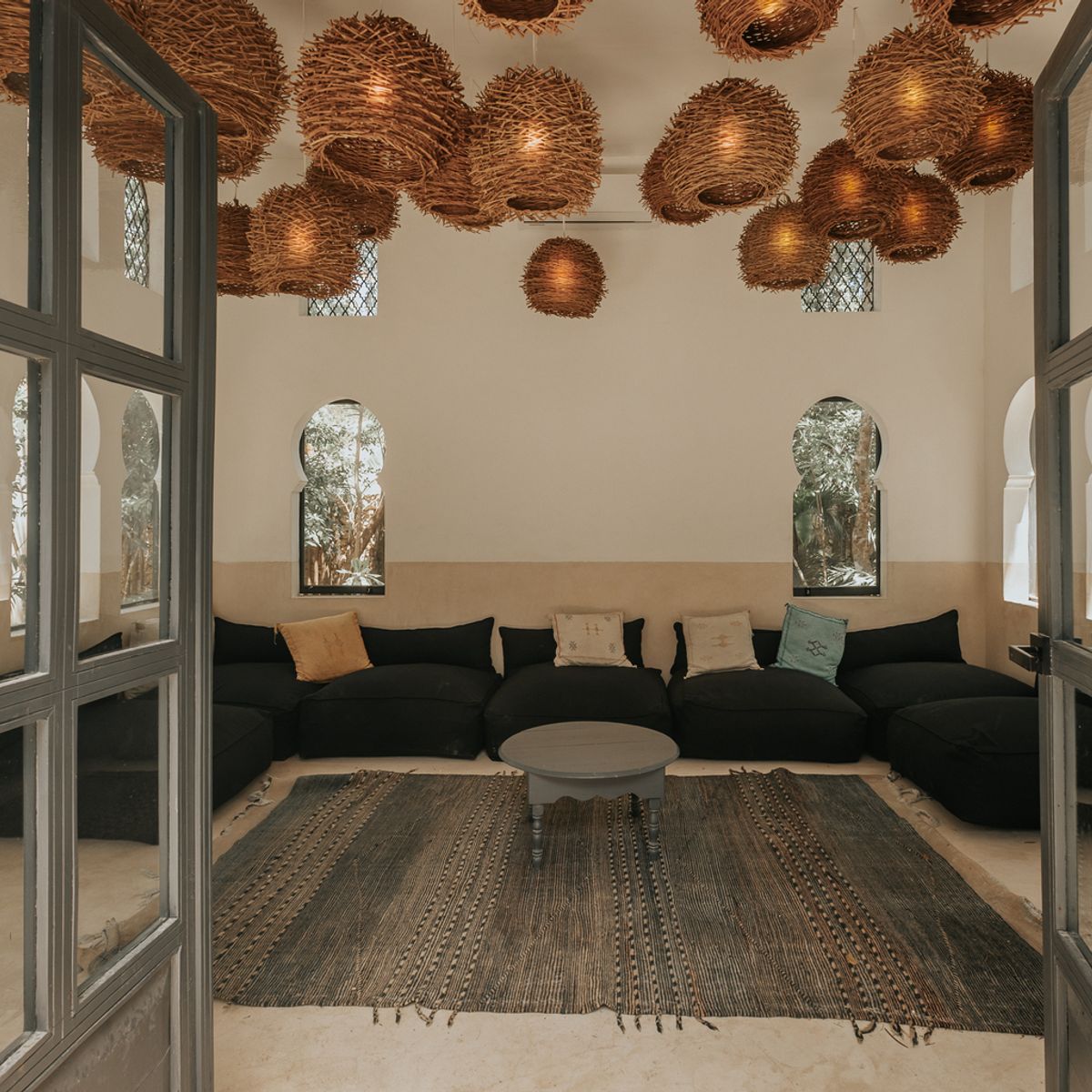 The main dining area is located to one side of the central atrium that the villa features. A corner breakfast bar is next to a dining table that seats up to eight guests comfortably. This is then beside two different comfortable seating arrangements, one on either side. The first one with couches and a small coffee table, the other with a beautiful rug with cushions and small poofs and low tables, where guests may enjoy a meditation session as the sun rises.