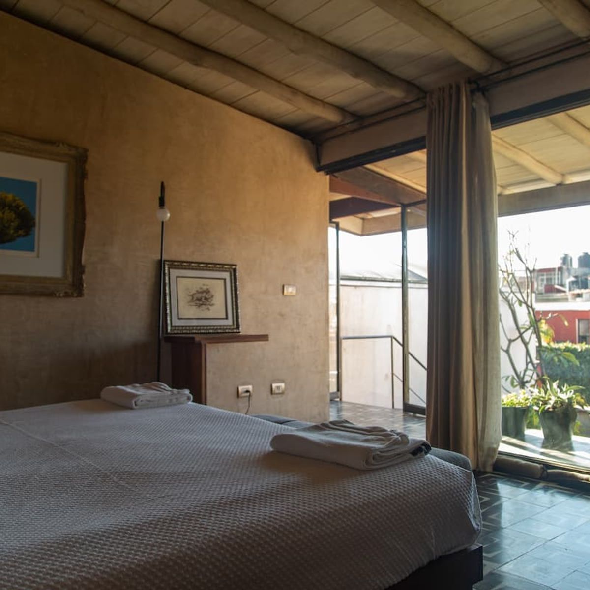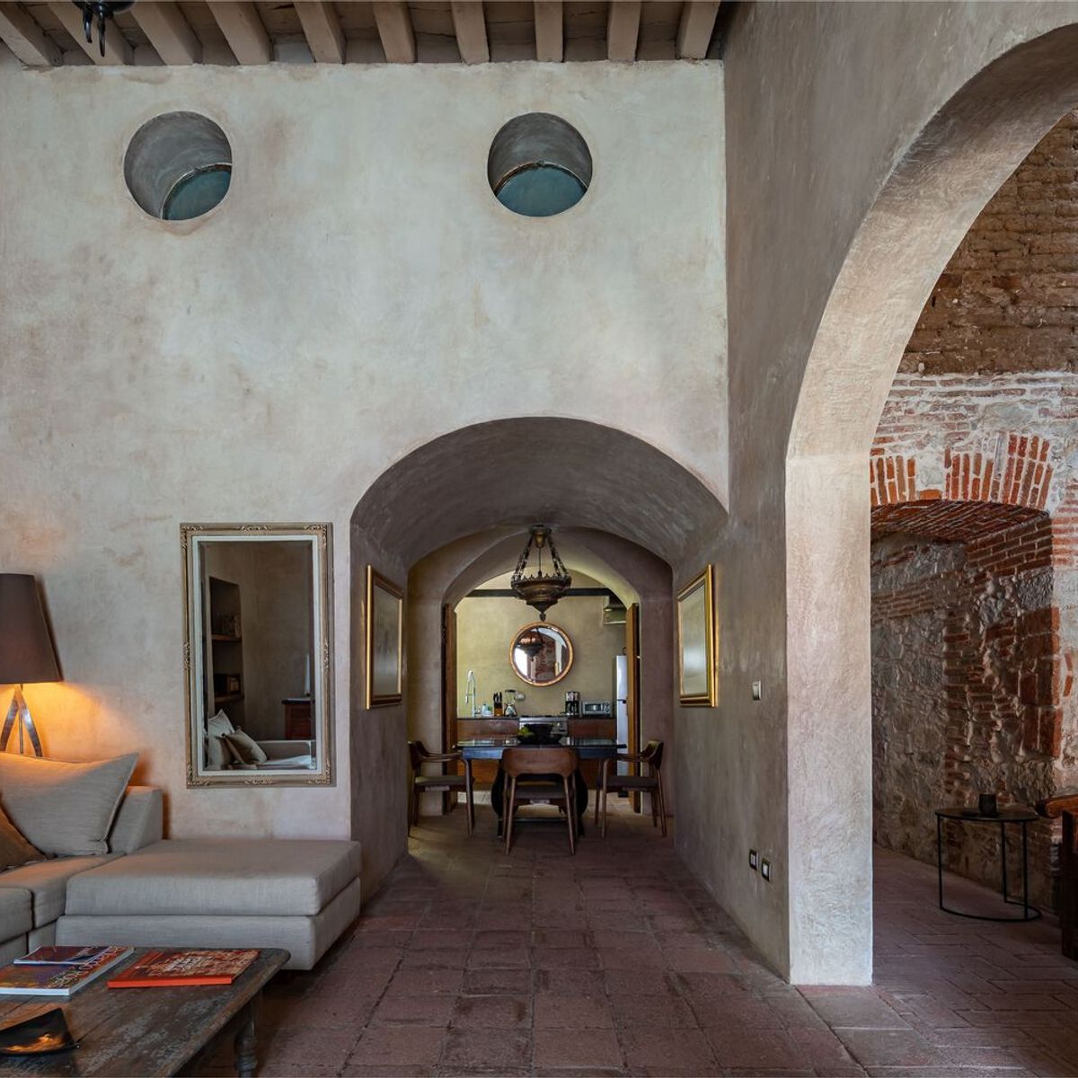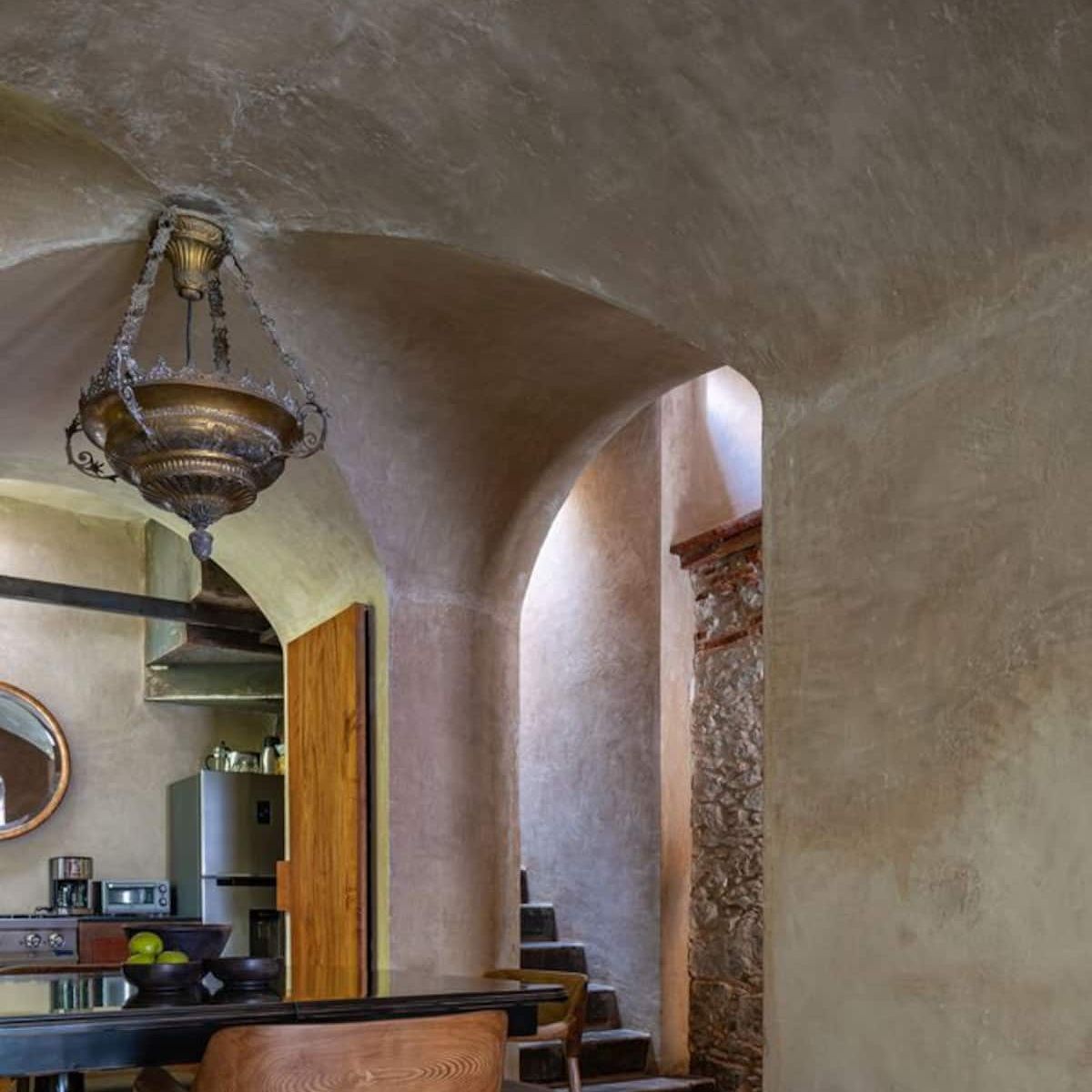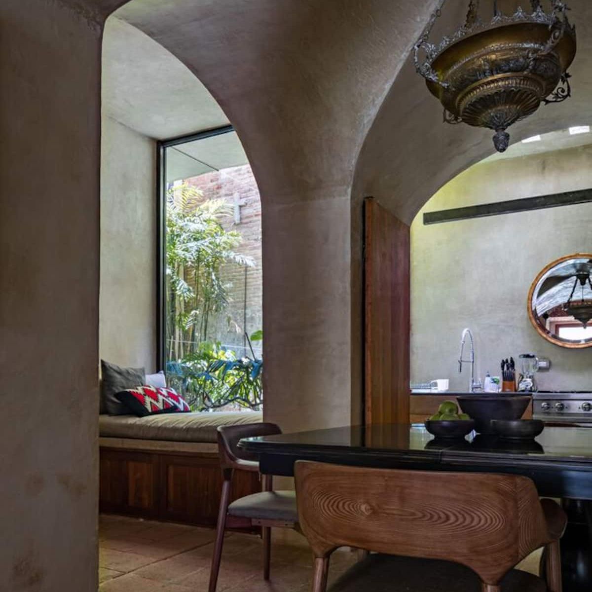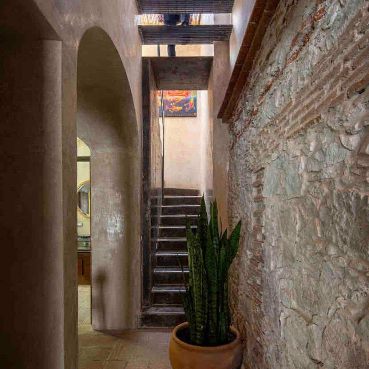 The ground floor embraces its past with art-adorned walls finished in baba de nopal—nopal slime a traditional technique using the natural gel from the nopal cactus to strengthen and smooth surfaces. This method, found in historic buildings, enhances durability while regulating humidity. Cozy spaces like a reading nook and a fully equipped kitchen centered around a stunning dining table invite relaxation and connection.