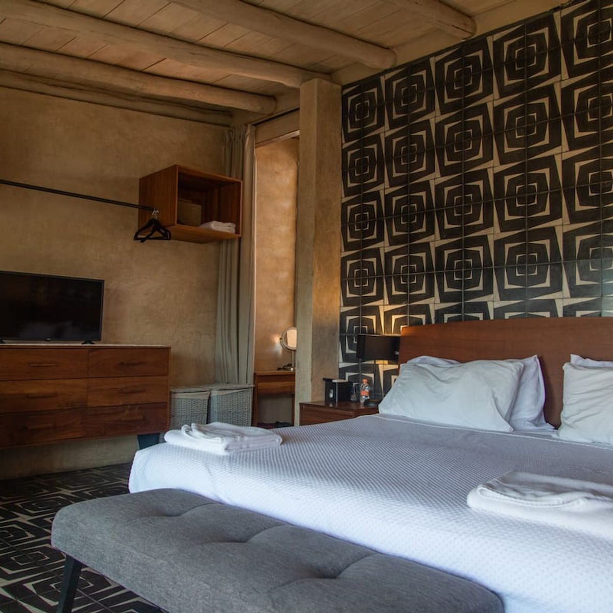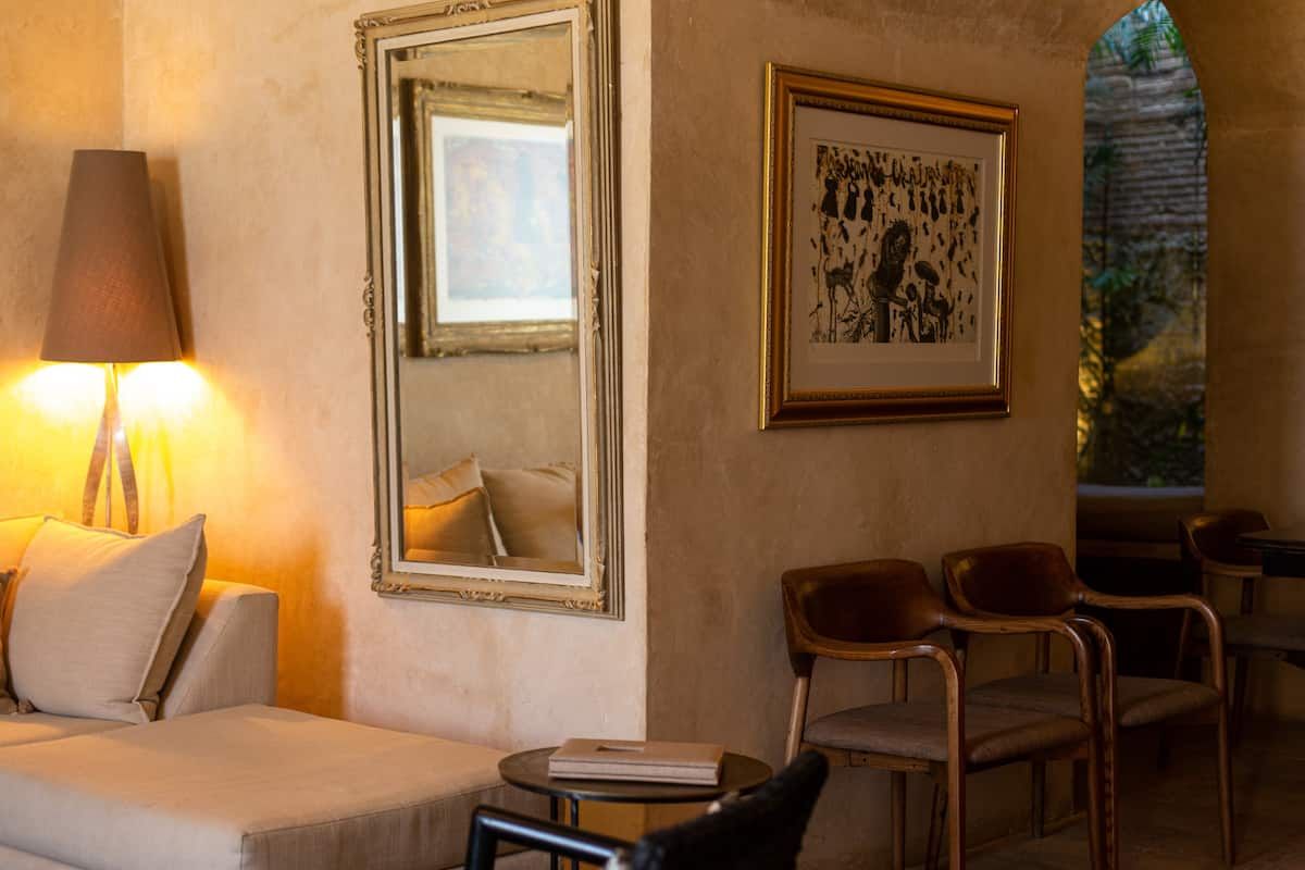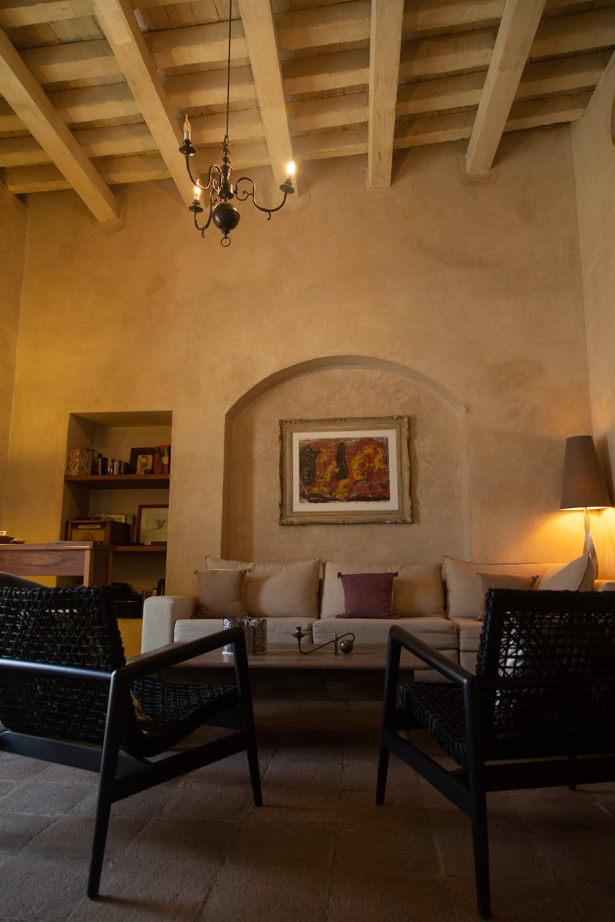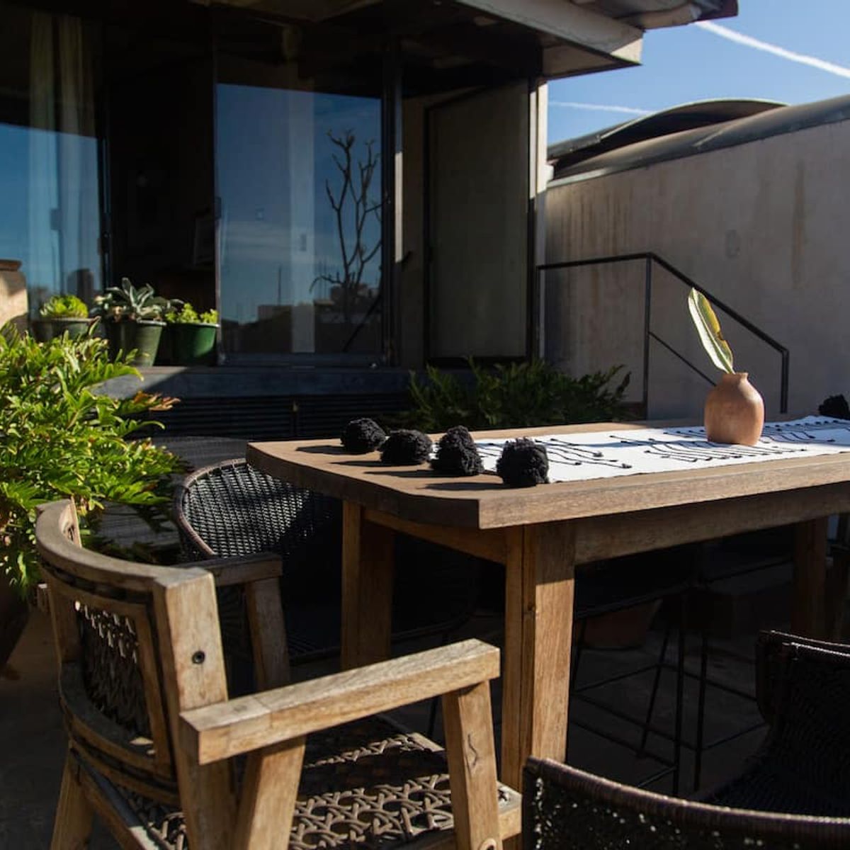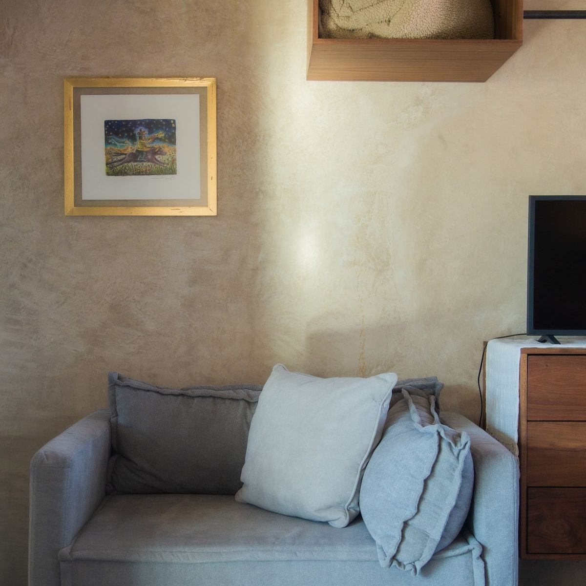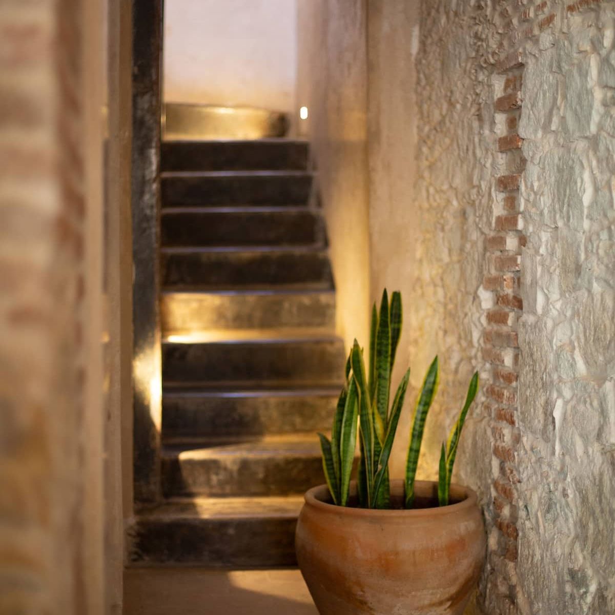 The ground floor embraces its past with art-adorned walls finished in baba de nopal—nopal slime a traditional technique using the natural gel from the nopal cactus to strengthen and smooth surfaces. This method, found in historic buildings, enhances durability while regulating humidity. Cozy spaces like a reading nook and a fully equipped kitchen centered around a stunning dining table invite relaxation and connection.