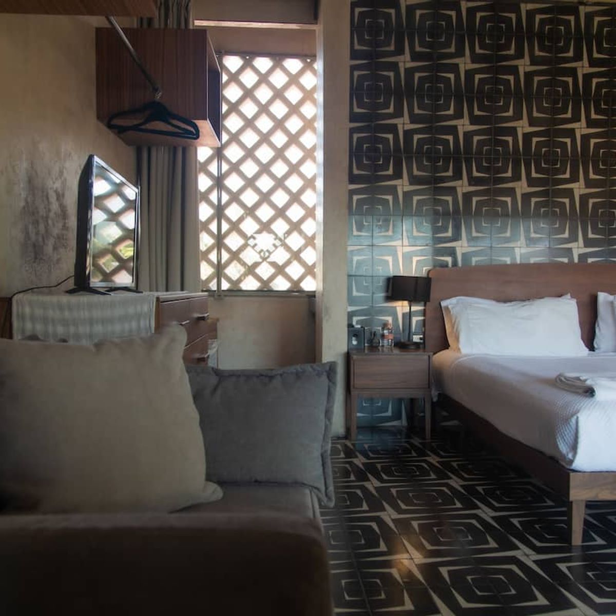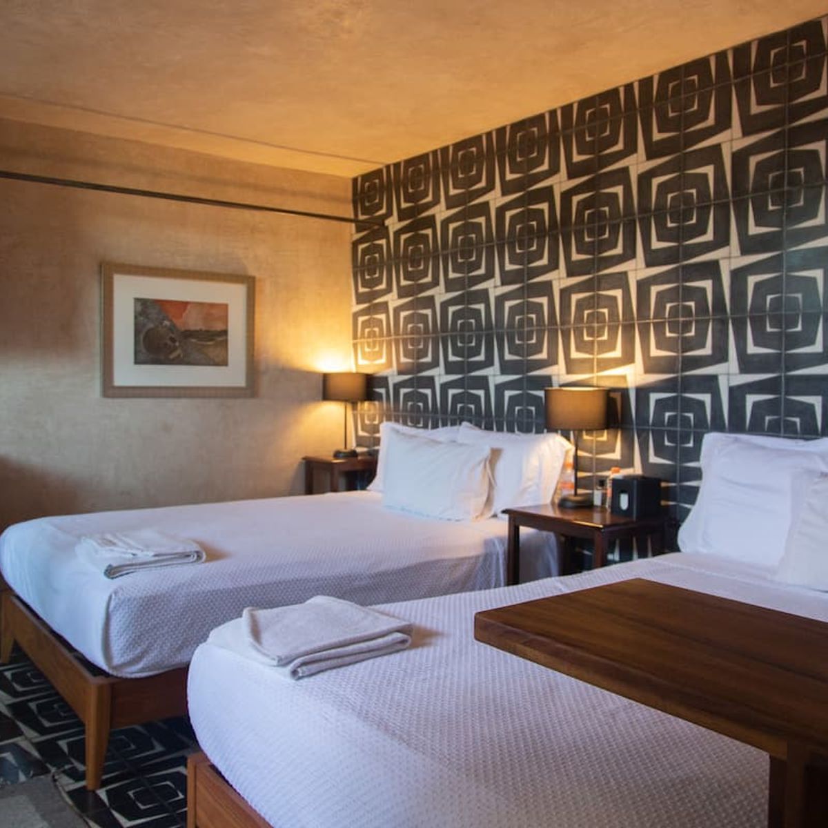 Upstairs, two serene bedrooms with en-suite bathrooms and air conditioning feature handmade mosaics designed by artist Francisco Toledo.