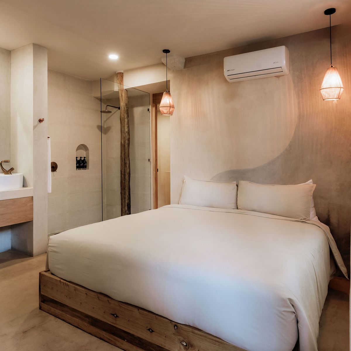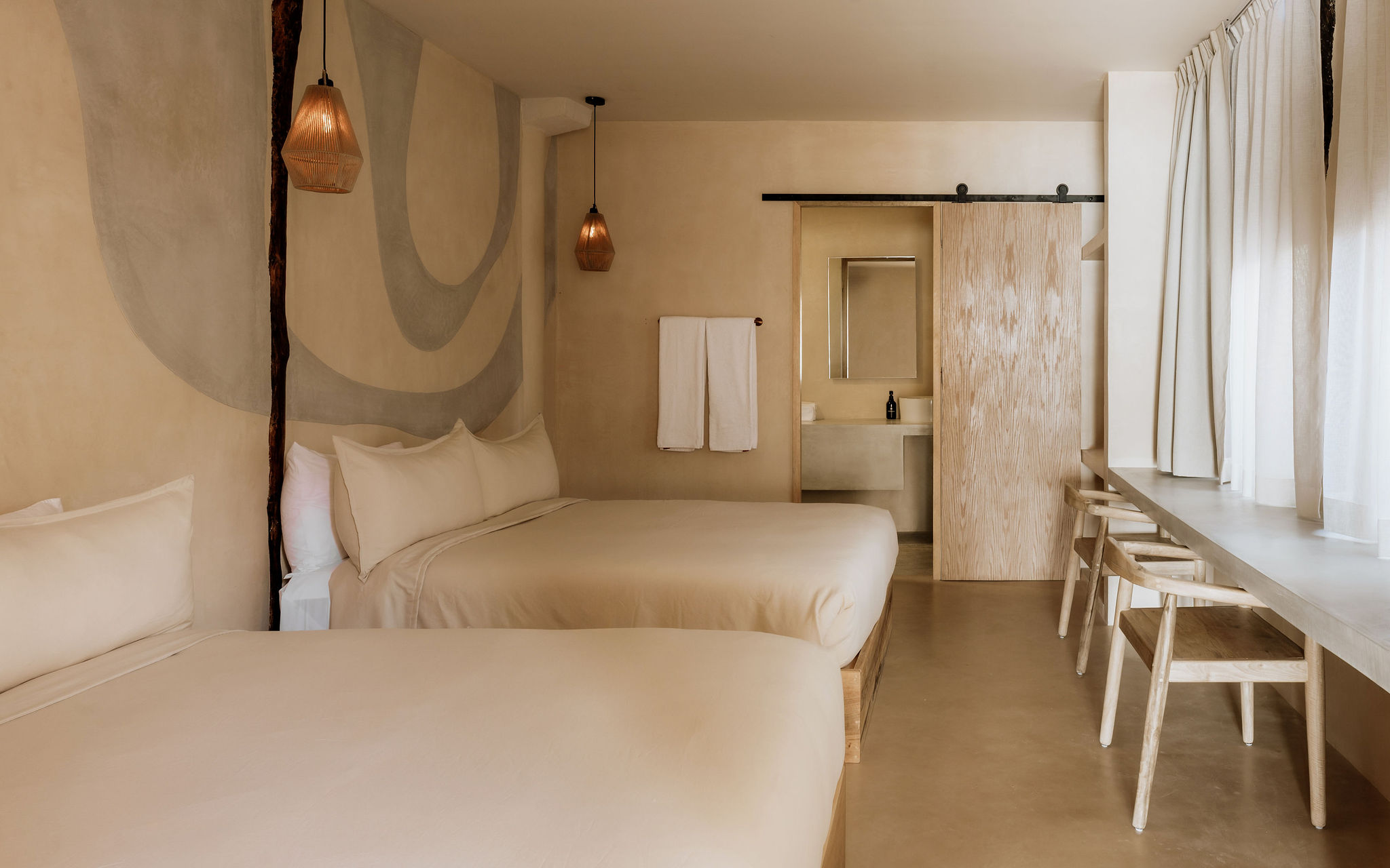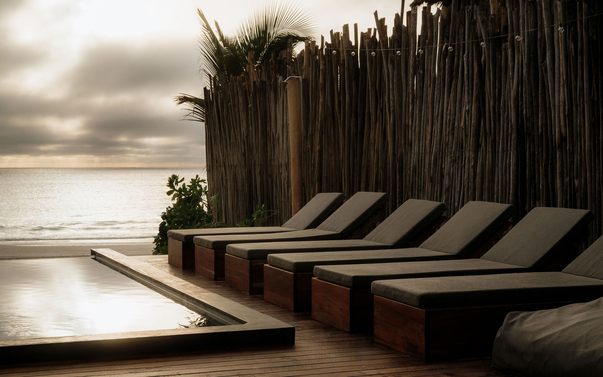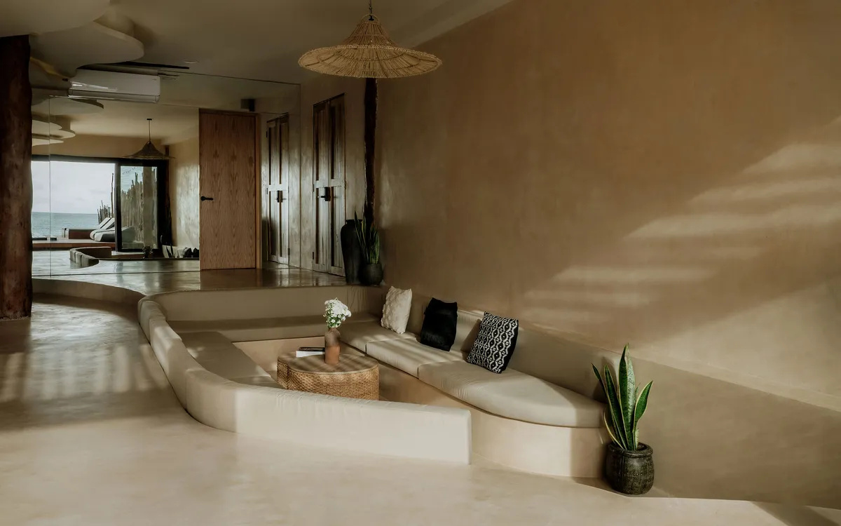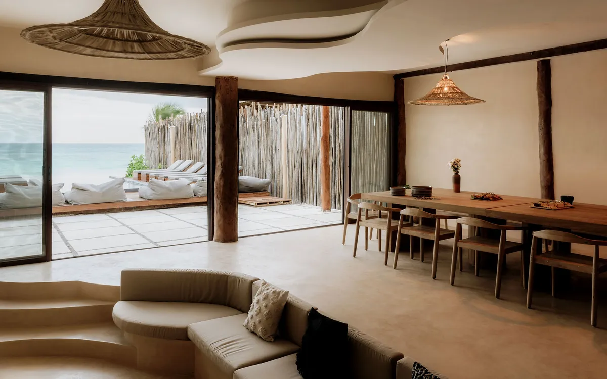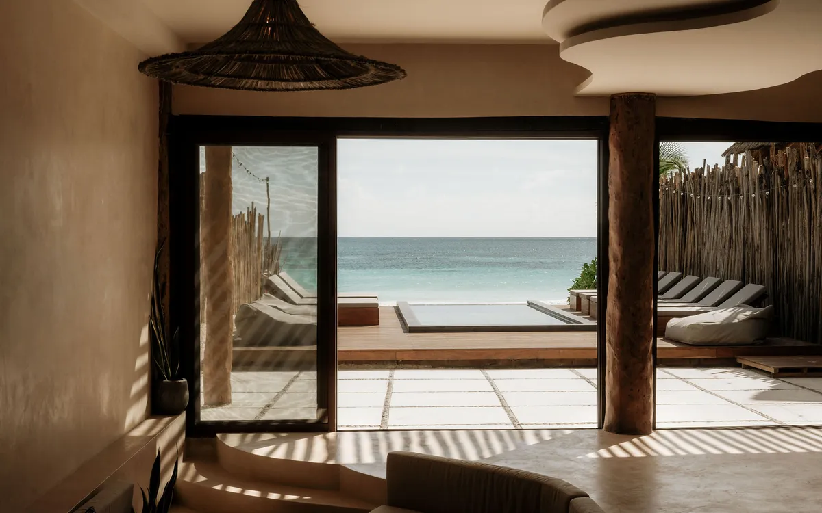 The outdoor spaces are just as impressive: a private beachfront pool, a rooftop lounge with panoramic views, and a plunge pool for cooling off after the beach.