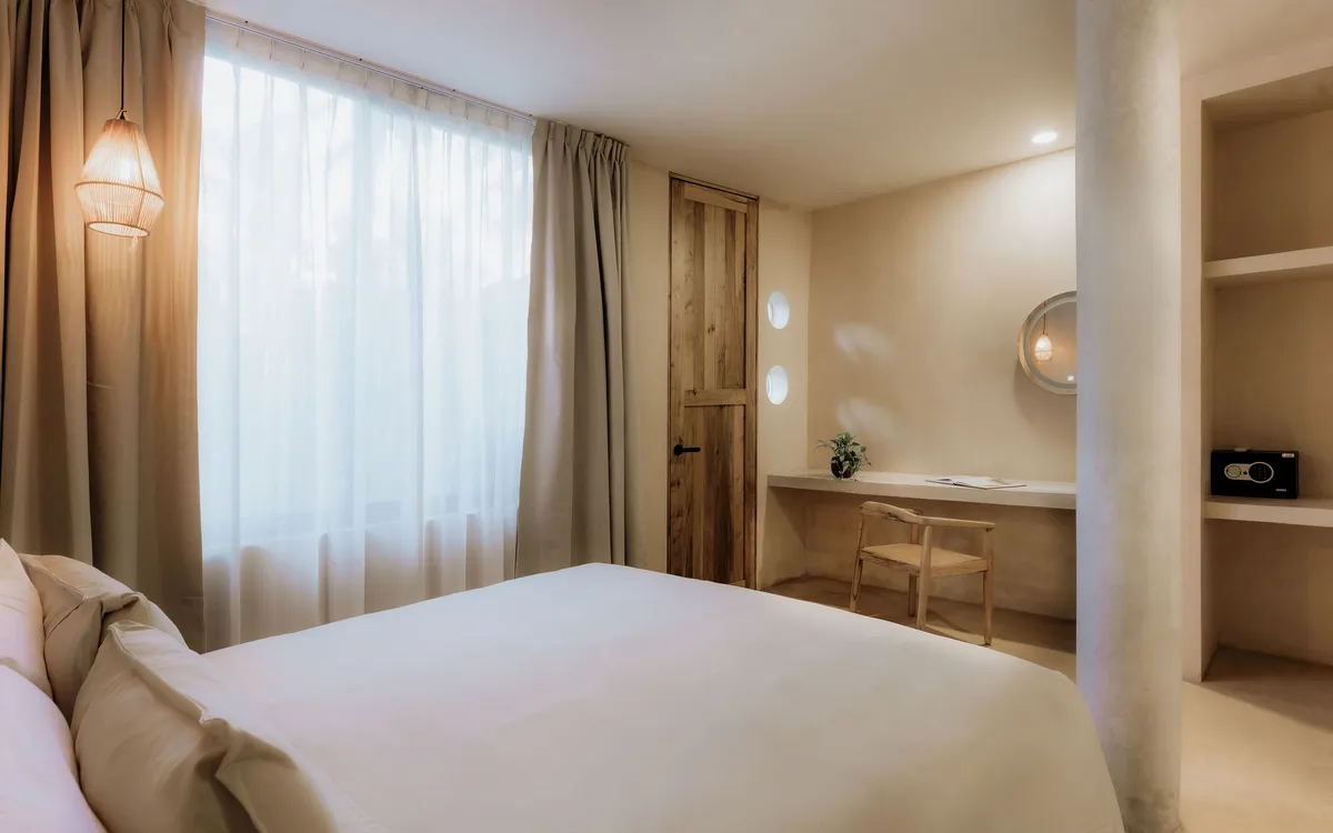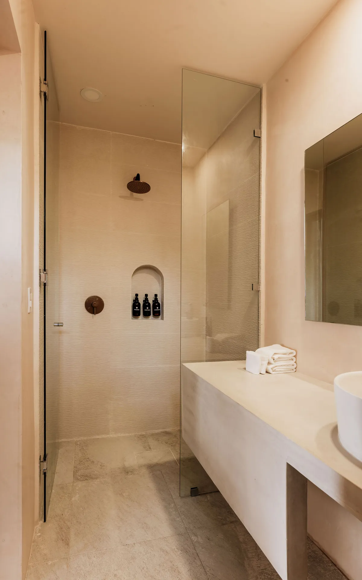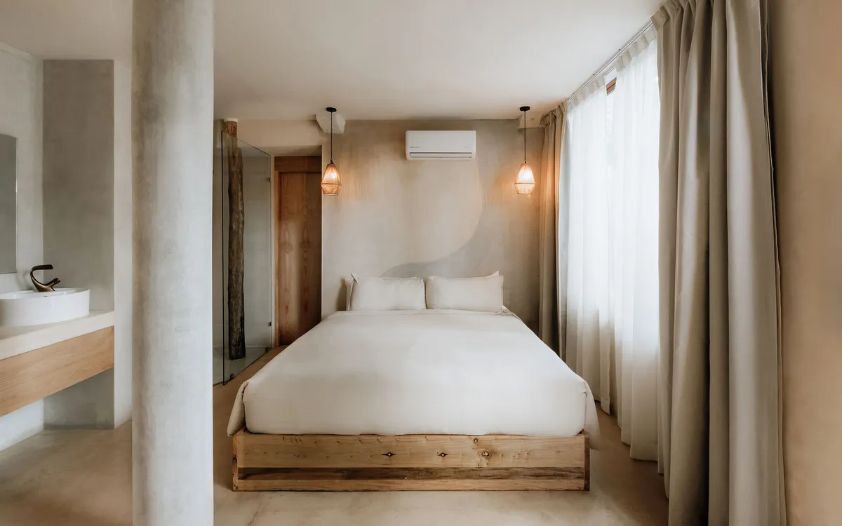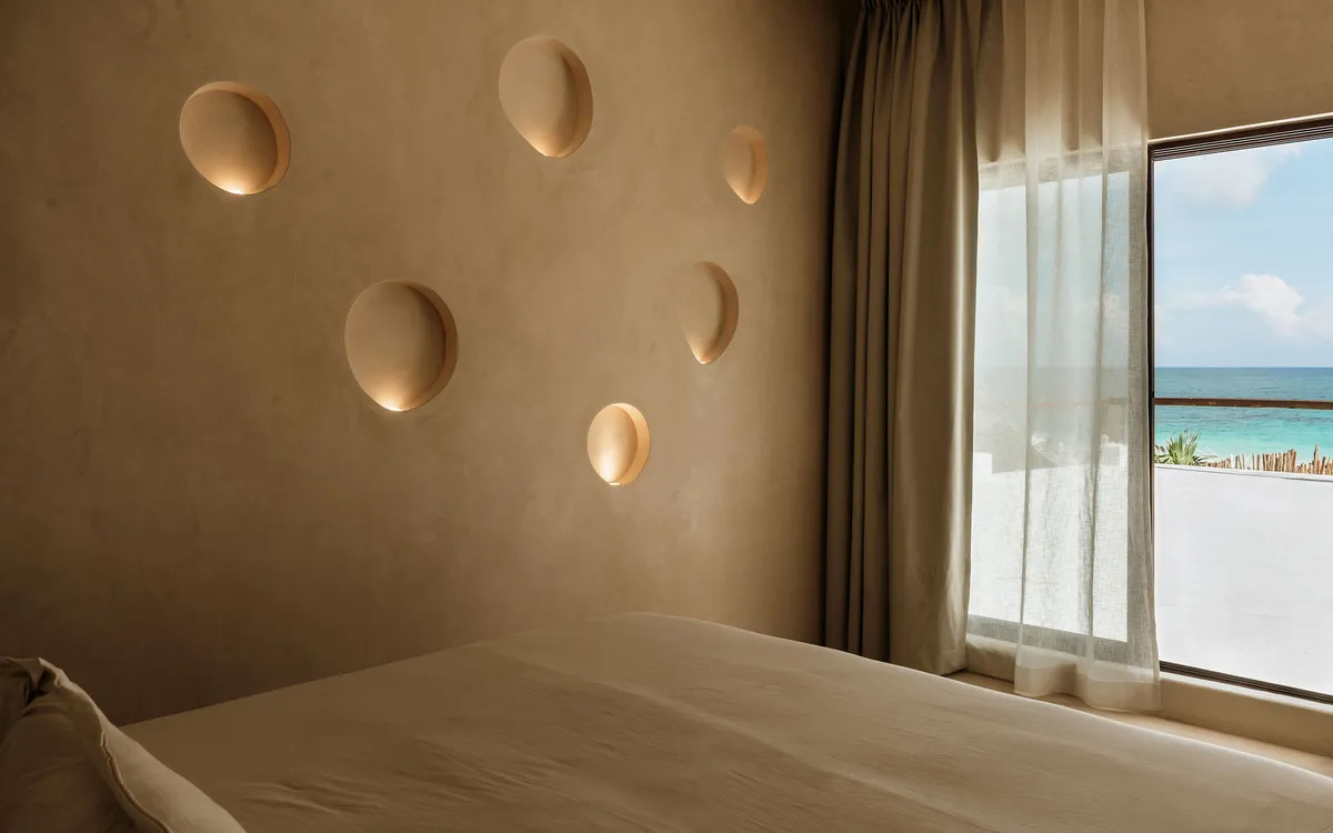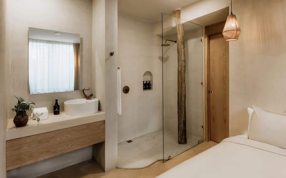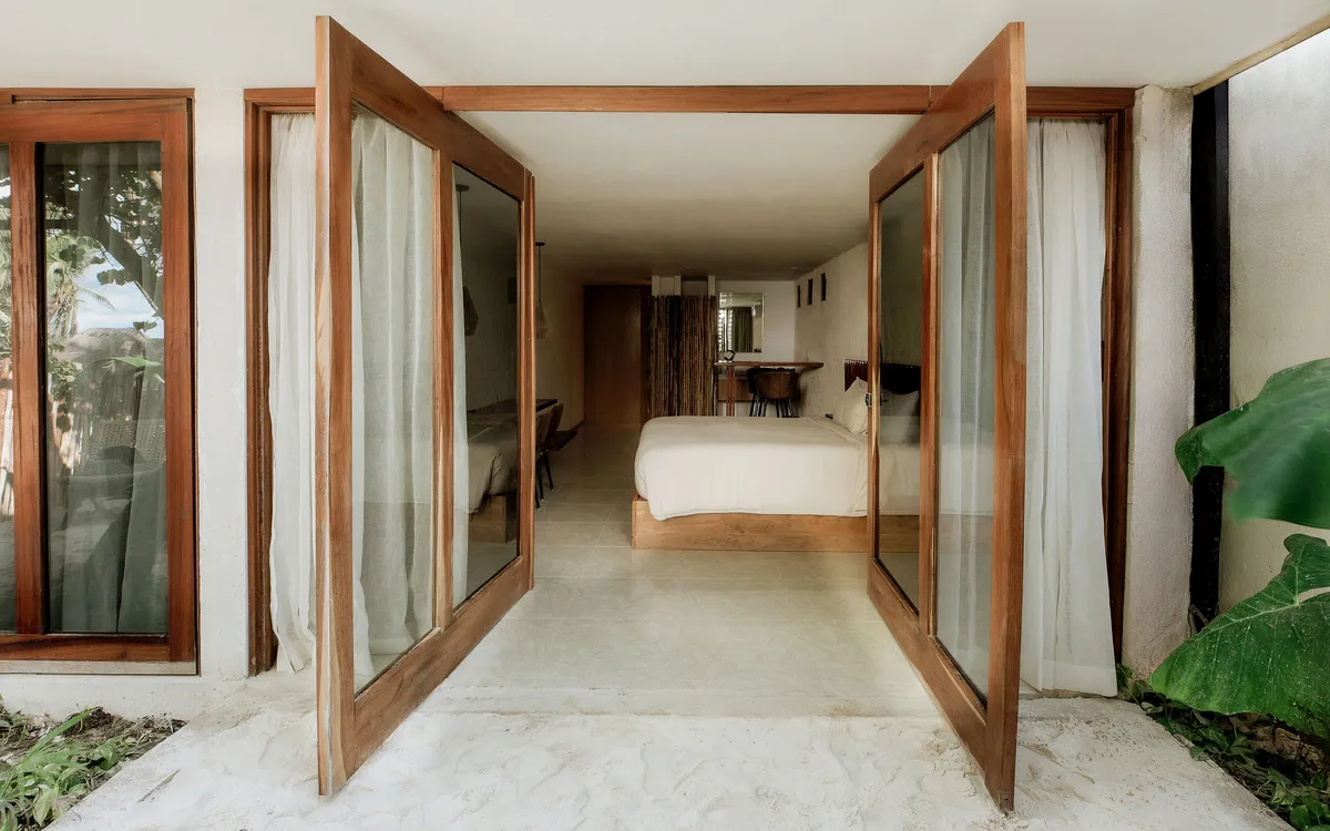 The outdoor spaces are just as impressive: a private beachfront pool, a rooftop lounge with panoramic views, and a plunge pool for cooling off after the beach.