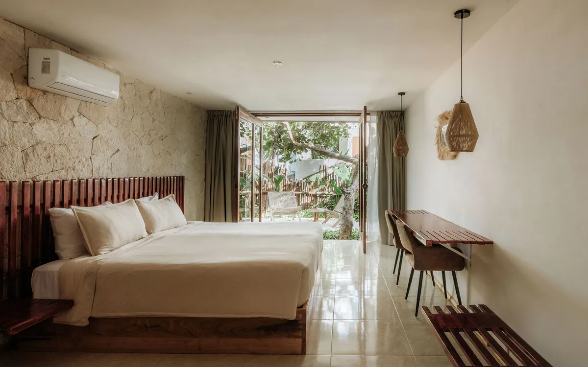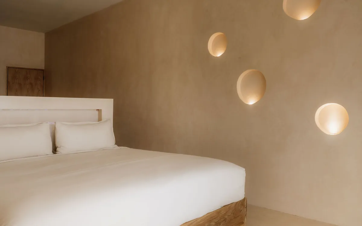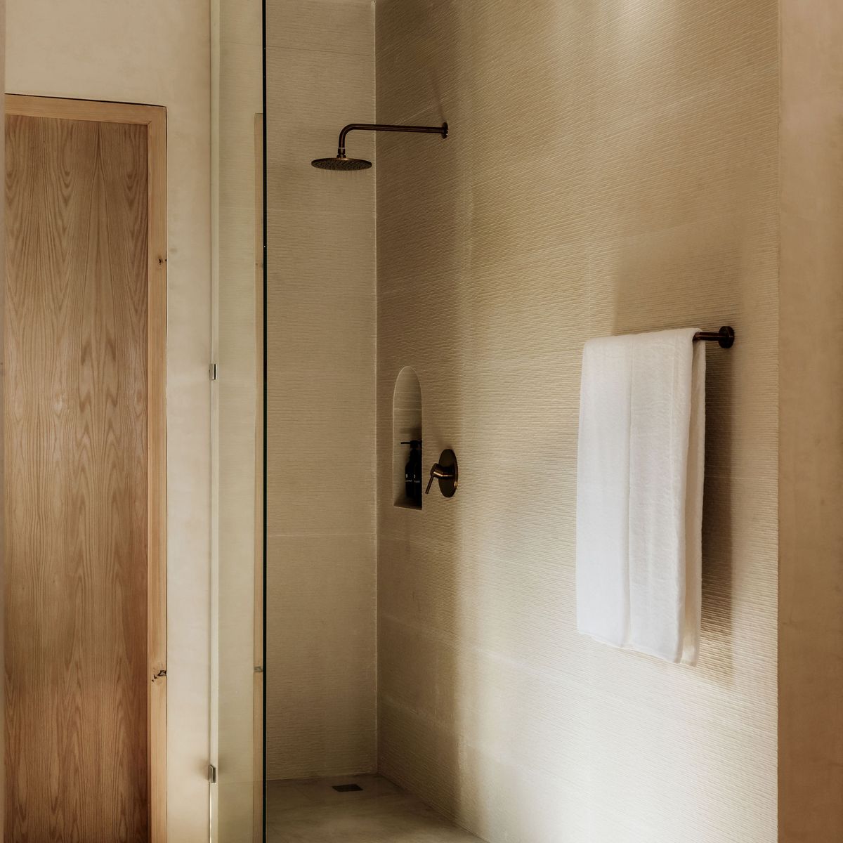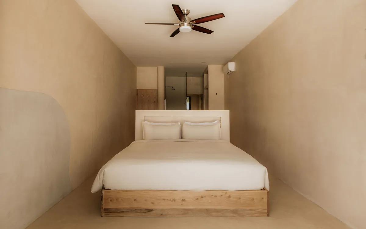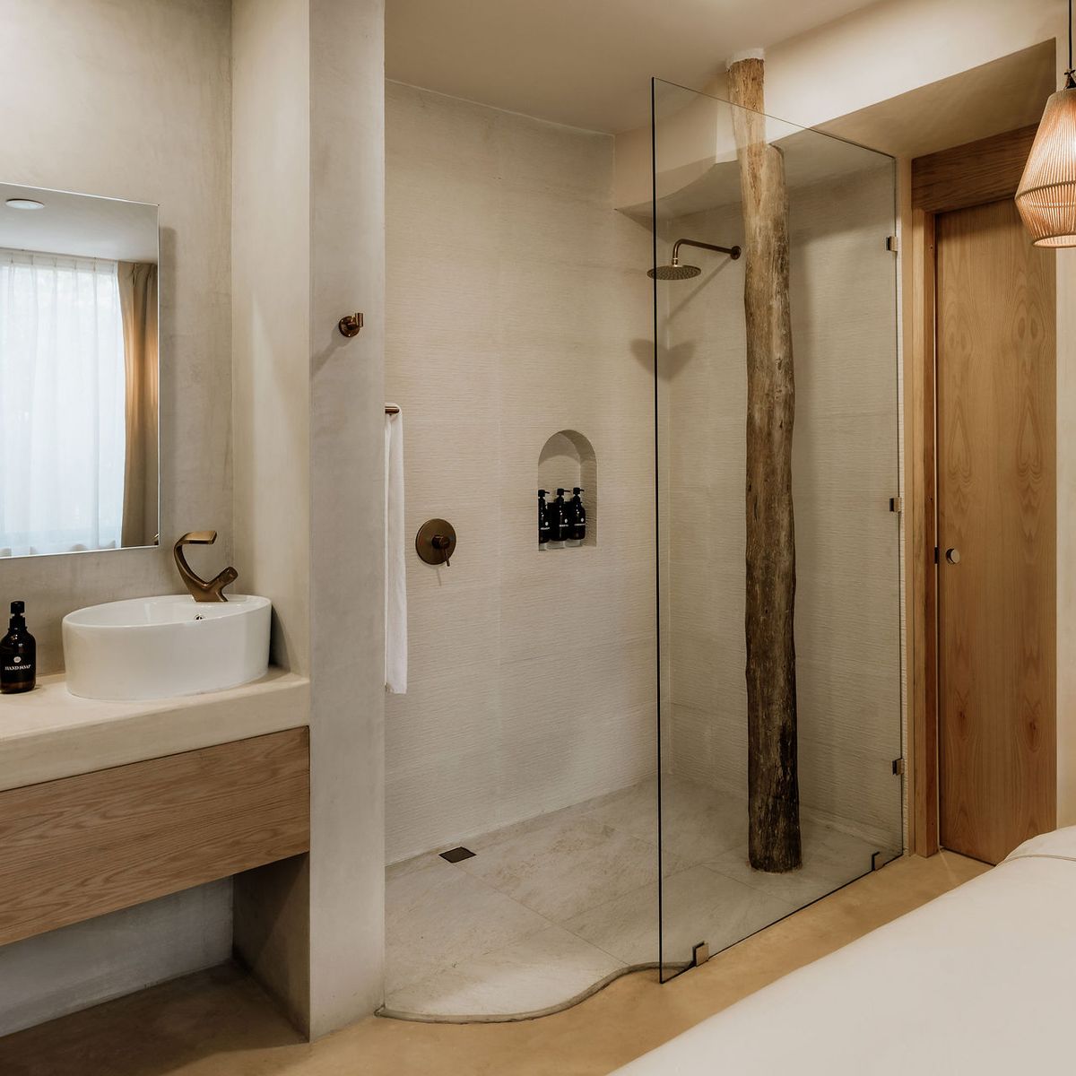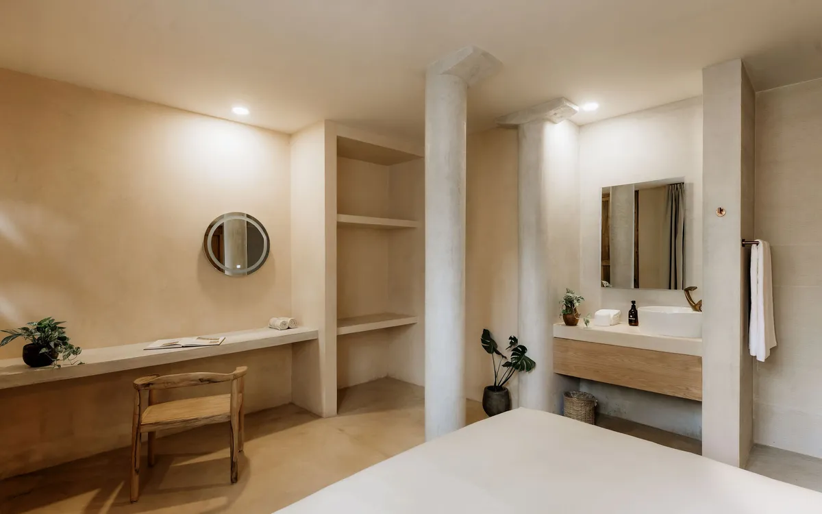 The outdoor spaces are just as impressive: a private beachfront pool, a rooftop lounge with panoramic views, and a plunge pool for cooling off after the beach.
