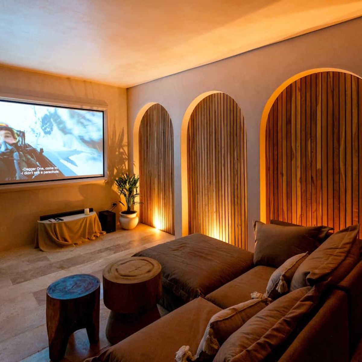 Enjoy the indoor waterfall and rainfall, or unwind in the starlit pool. The rooftop pool and firepit provide a stunning 360° view, making it the perfect space for relaxation or hosting an unforgettable event. The home has a private heated jacuzzi accommodating up to 16 guests, an indoor cinema room, and a secure gated community. Please note that there may be construction activity in the vicinity between 9 AM and 5 PM.