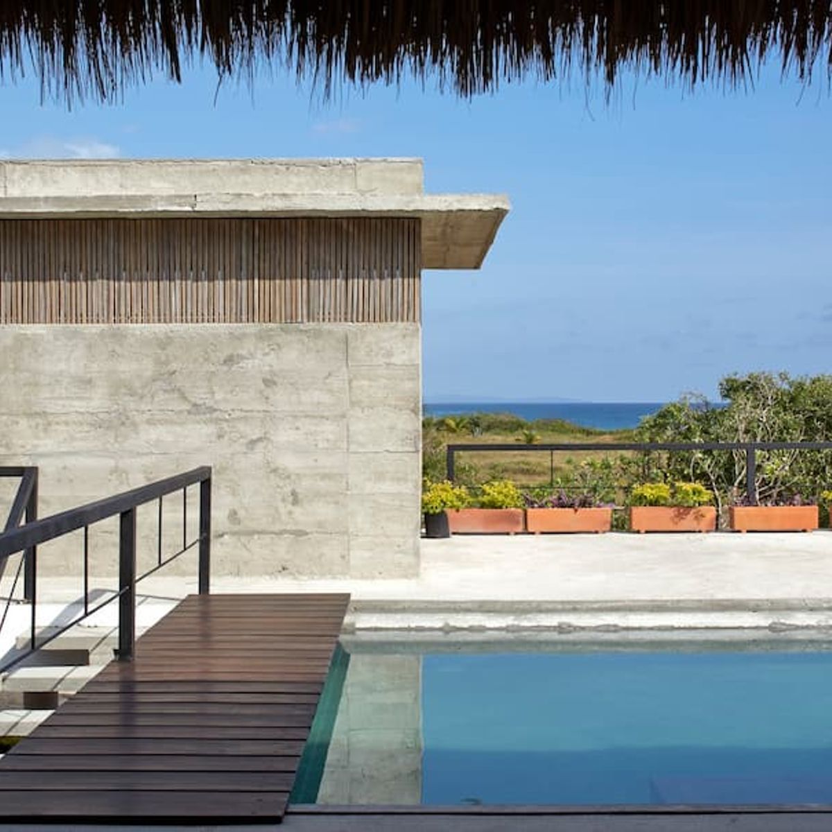 For instance, the plot is set back from the beach; to maximize the vistas, Quiñones flipped the traditional layout, placing the living areas upstairs and bedrooms below. This captured stunning ocean views and prompted some fascinating design choices. The standout example is the elevated concrete pool, whose dramatic cubic sides and sculptural ladder are the property’s defining features.
