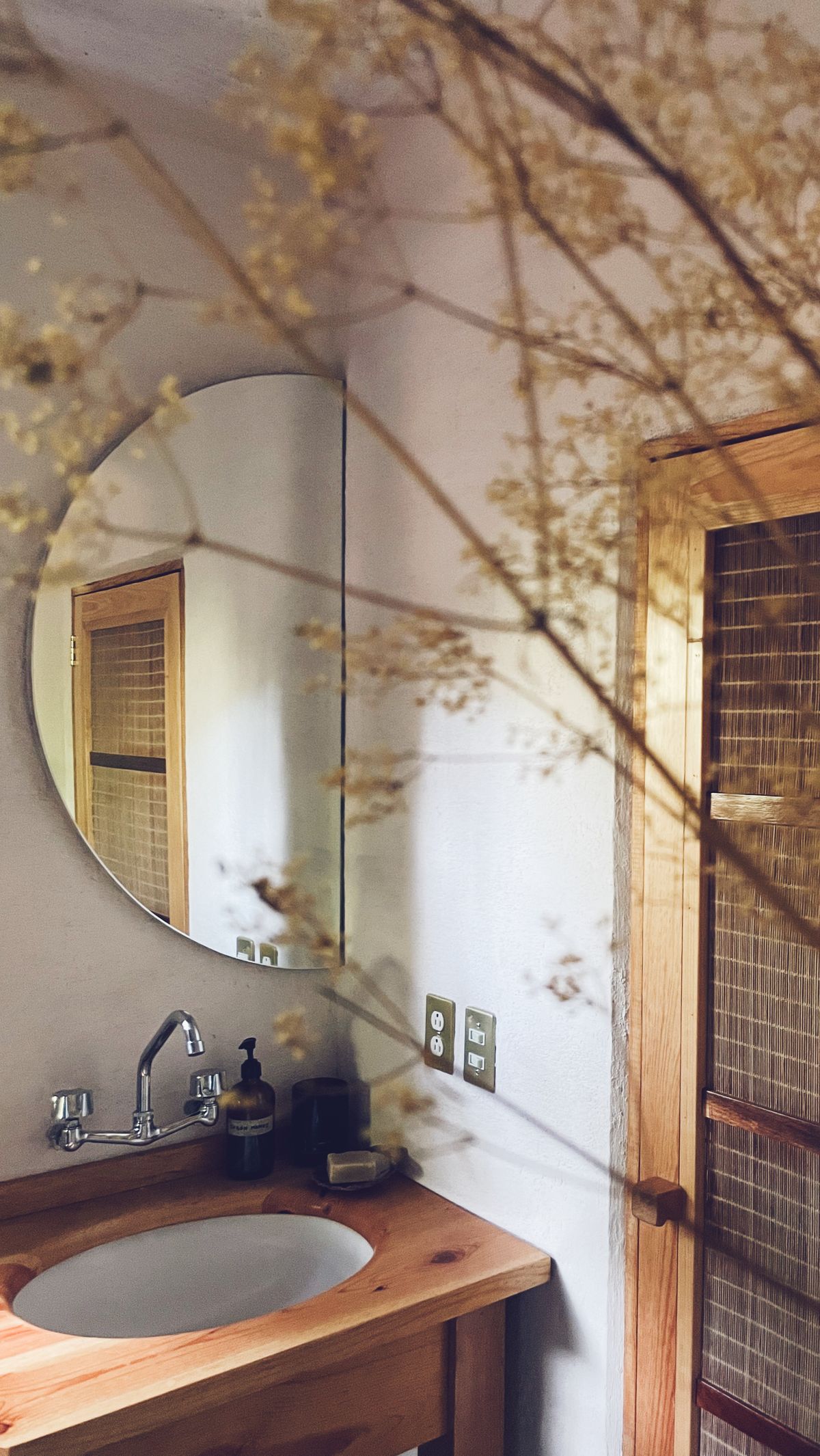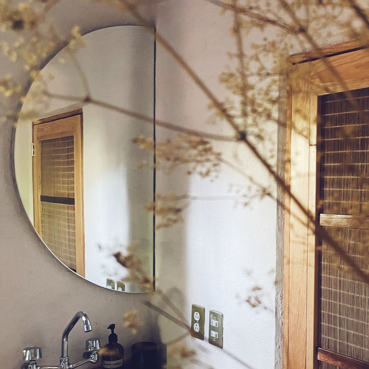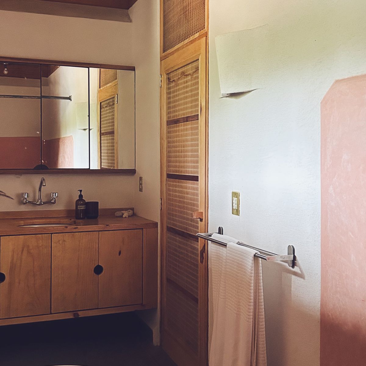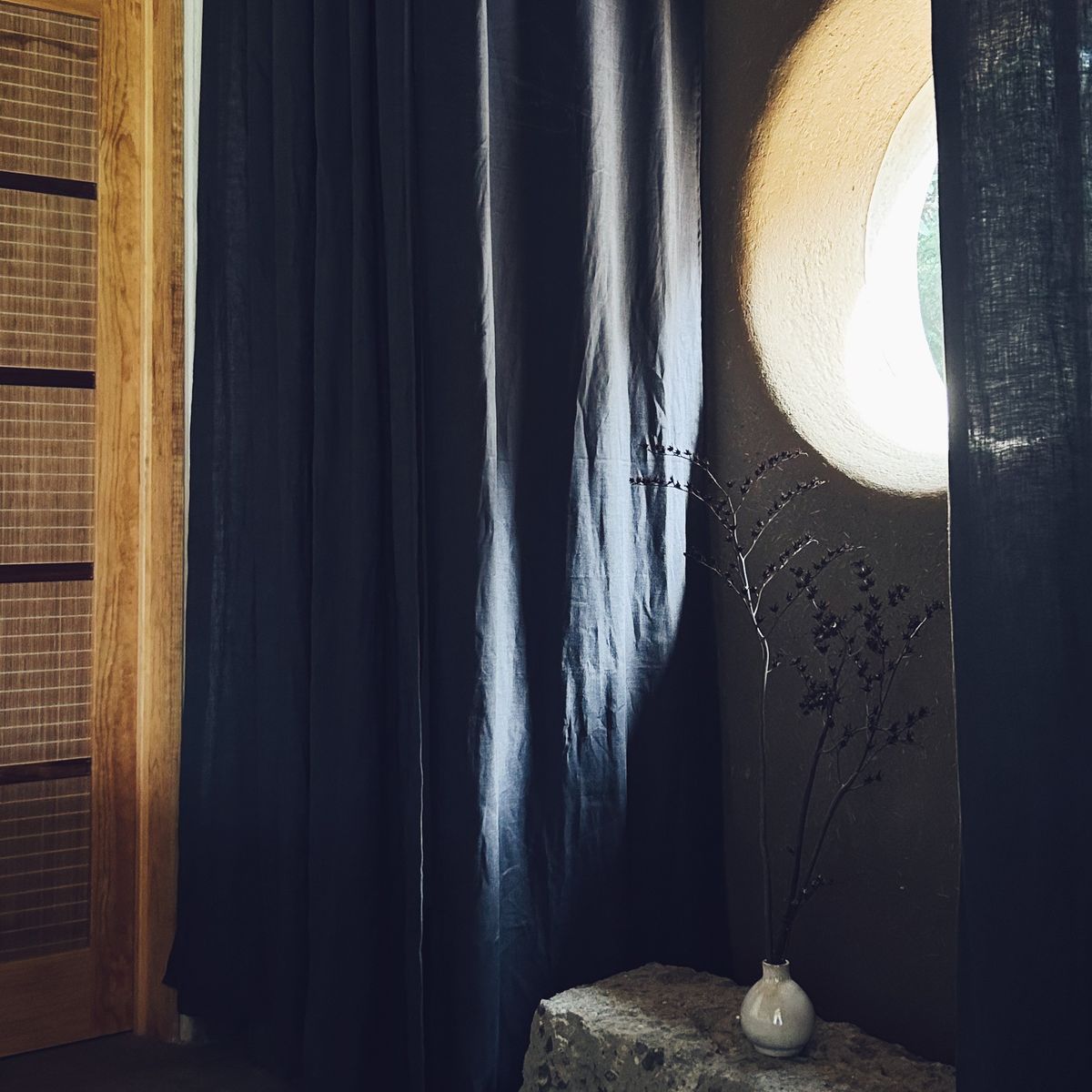As you walk in, a Japanese-inspired entryway welcomes you to leave all that is too heavy behind. From the vestibule, you can enter a full bathroom with a wide shower made from soothing dark Tadelakt, giving the space a certain mystique.