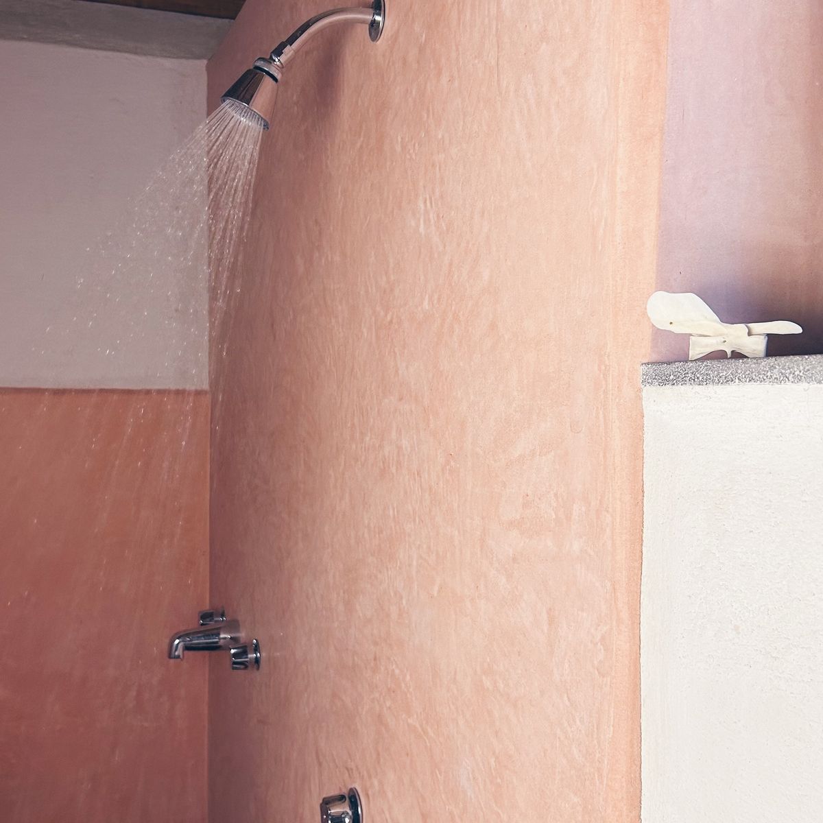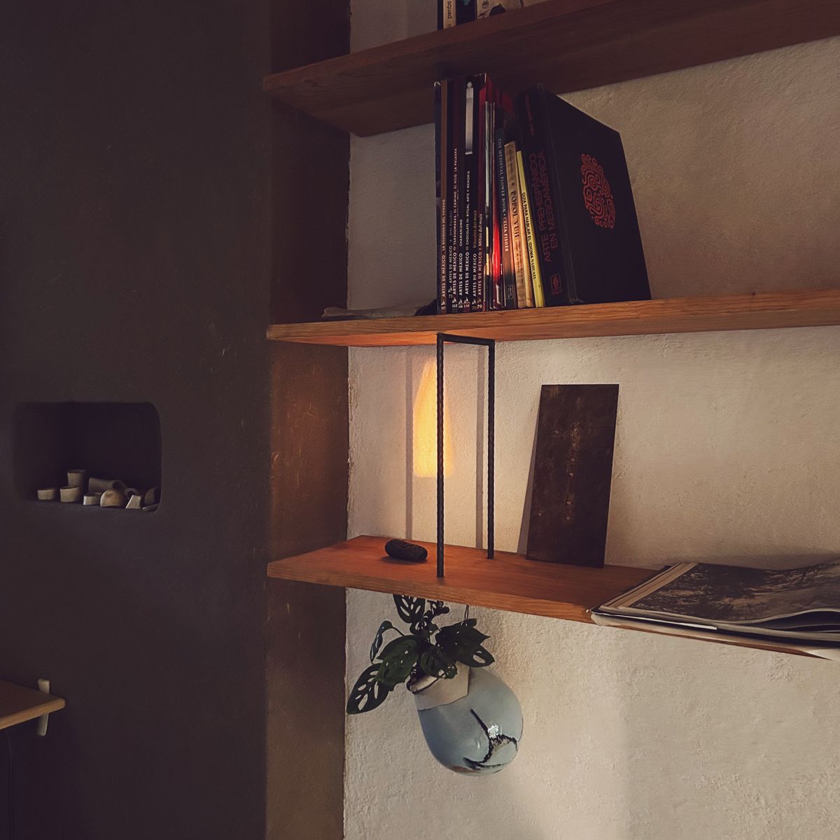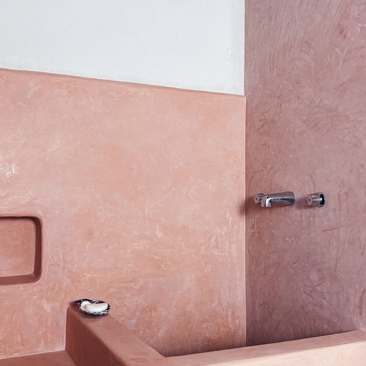 From the terrace, there are three main doors. Two lead into the kitchen and living area. The third opens into a small studio filled with handpicked books—ideal for a leisure getaway or working retreat. From the studio, a door leads to the main bedroom with a full-size bed. The earthen walls and high ceilings offer deep, tranquil rest. In the main bathroom, you can shower in peach-colored Tadelakt or fill a small hot tub and forget the world.