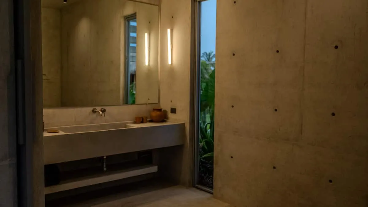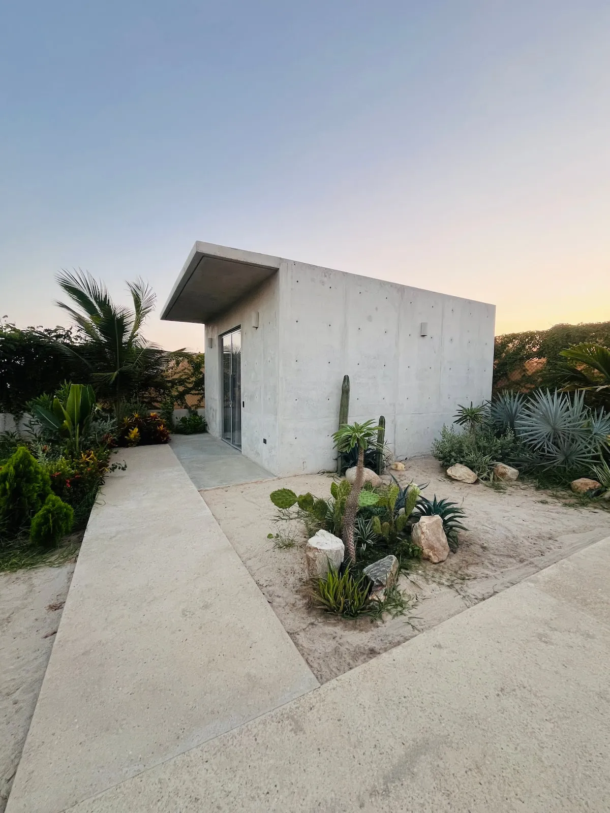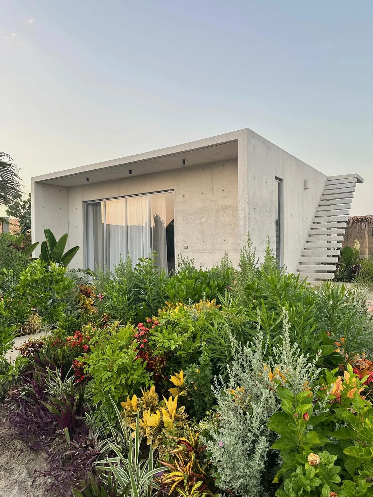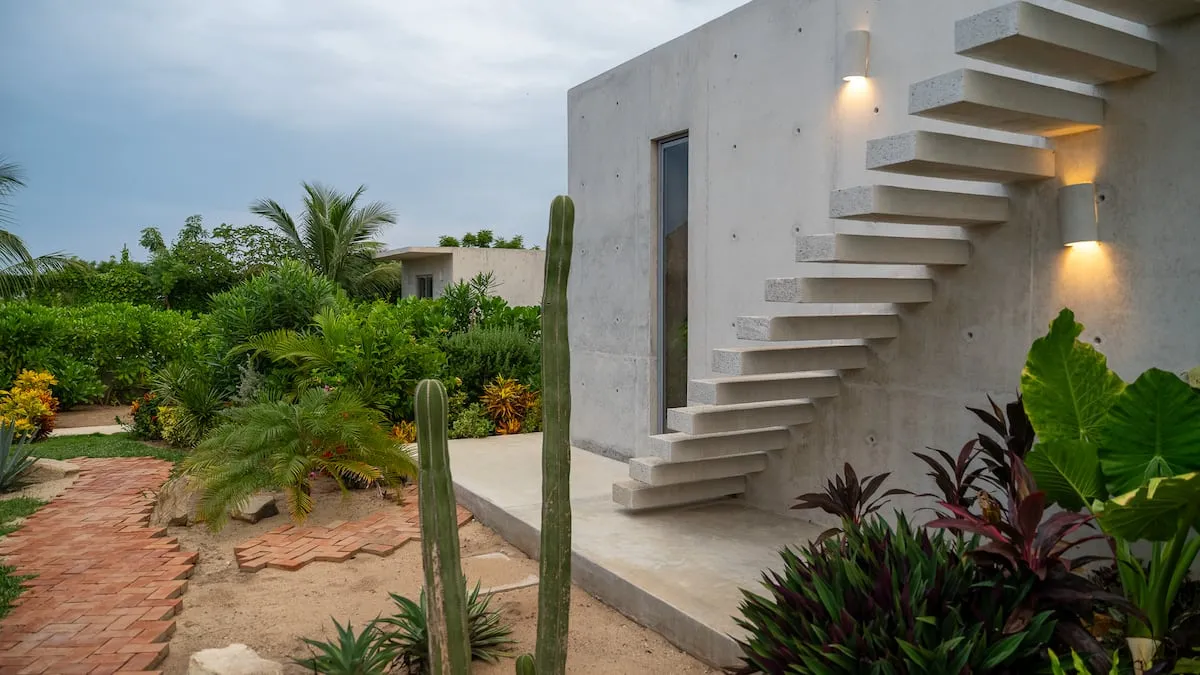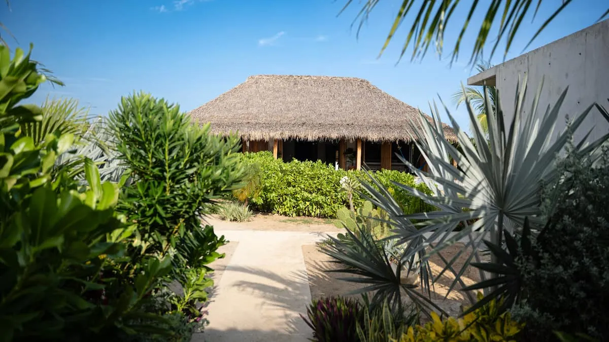 A space where modern design and brutalist architecture blend with the essence of the Oaxacan coast through the work of local artists, creating a cozy atmosphere immersed in the exuberance of a garden of endemic species that leads us to connect with nature uniquely.