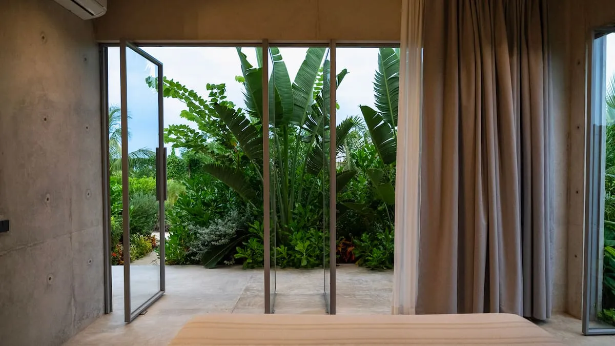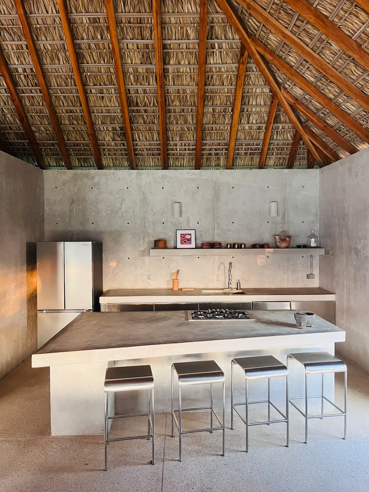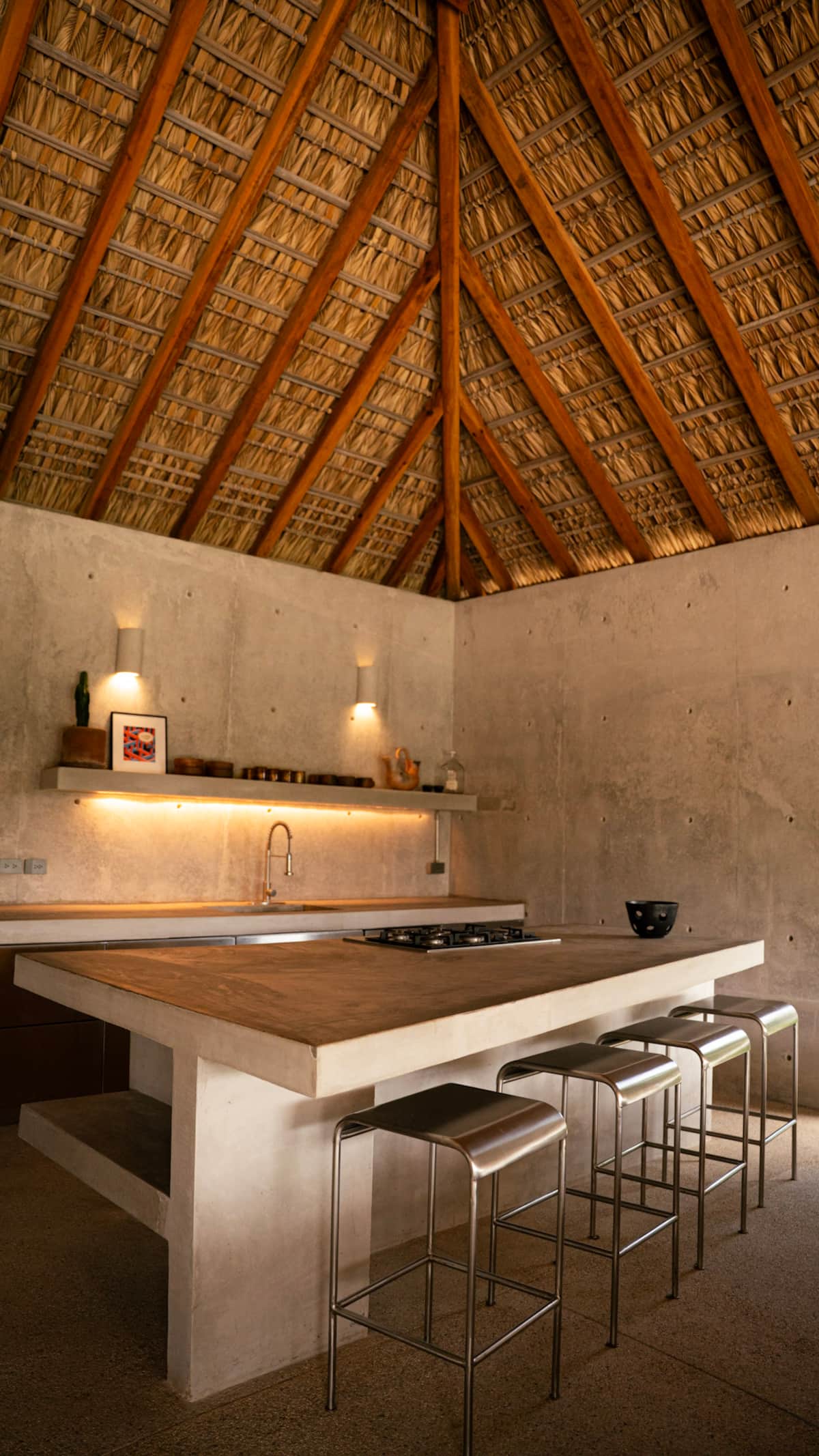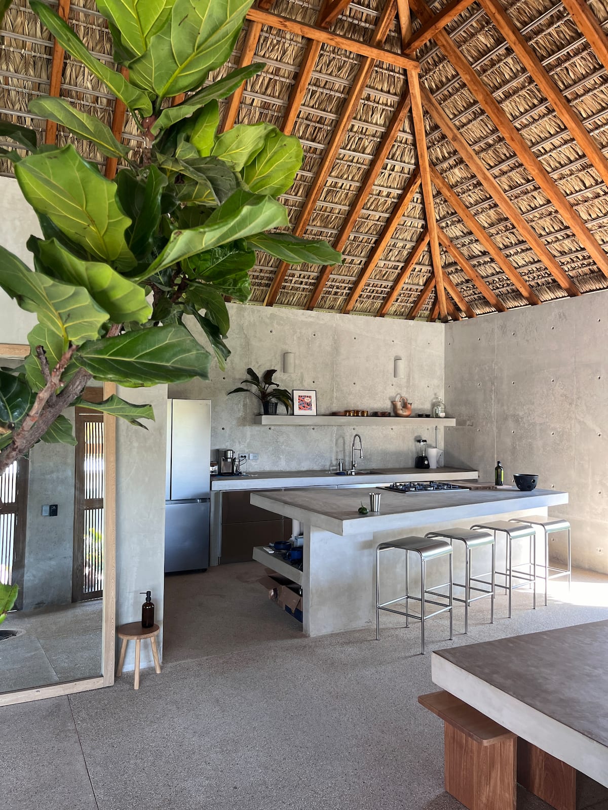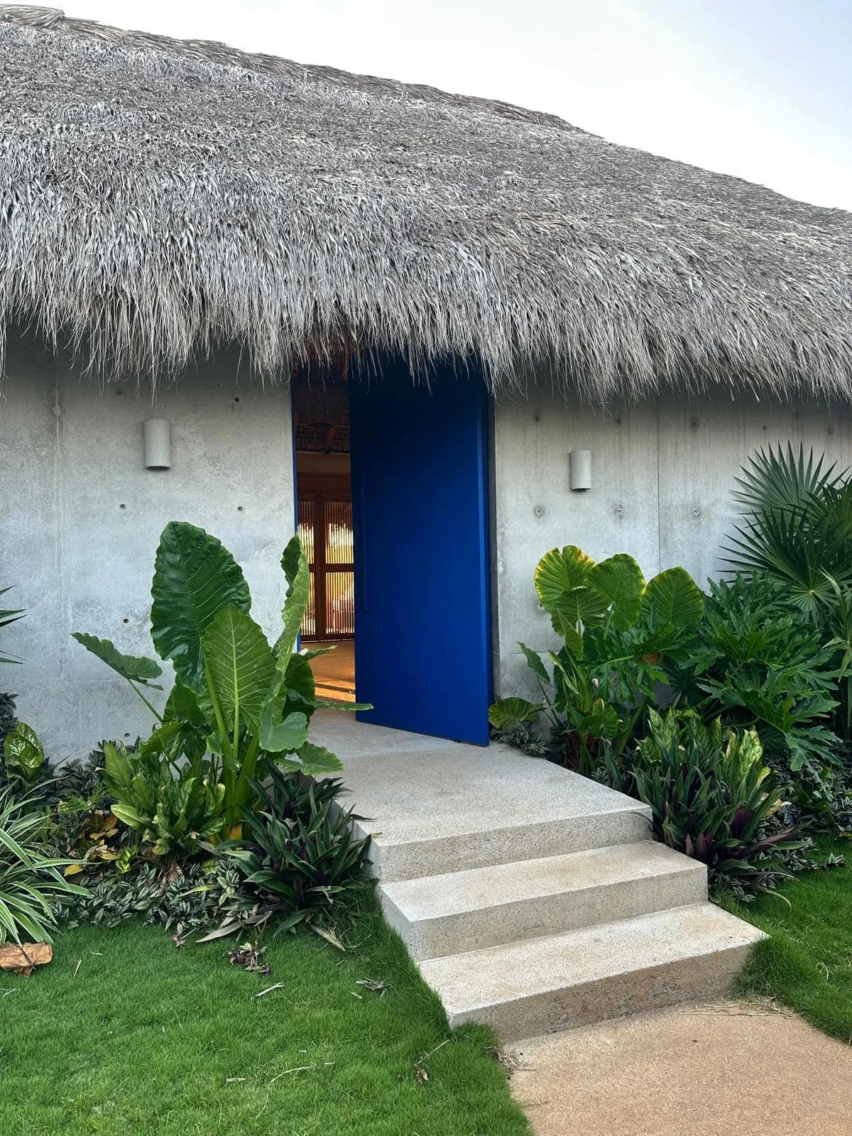 A space where modern design and brutalist architecture blend with the essence of the Oaxacan coast through the work of local artists, creating a cozy atmosphere immersed in the exuberance of a garden of endemic species that leads us to connect with nature uniquely.