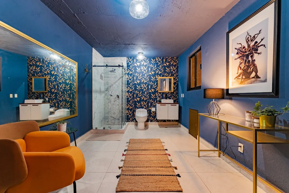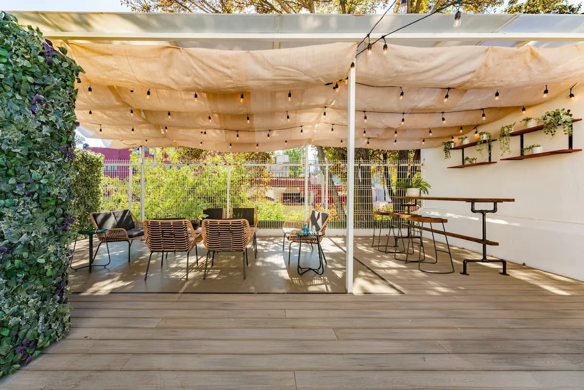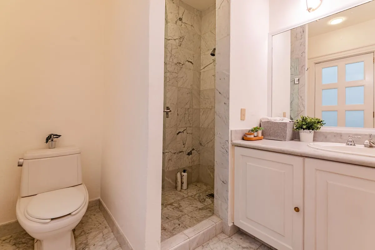 The upper floor of the home includes a rooftop terrace with lounge seating, dining area, barbecue, and full bathroom. This home is ideal for families or groups seeking comfort, space, and walkable access to La Condesa’s best cafés, parks, and nightlife.