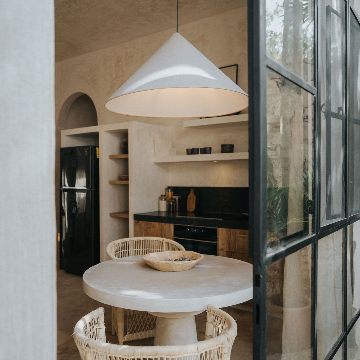 The kitchen is fully equipped to prepare your favorite dishes or explore Mexican cuisine. It includes a coffee machine, French press, a high-end blender, an oven, and a toaster for your bread. We offer handmade cutting boards, a great selection of knives, and artisan plates and cups. To make you feel right at home, we provide a selection of tropical fruits as a welcoming gesture, along with a bottle of wine. You'll also find a tap for purified, drinkable water, so feel free to indulge.The bedroom area comes with a separate fan, and the AC is thoughtfully placed to keep your space consistently fresh. Charging your devices is a breeze with convenient outlets on both sides of the bed.