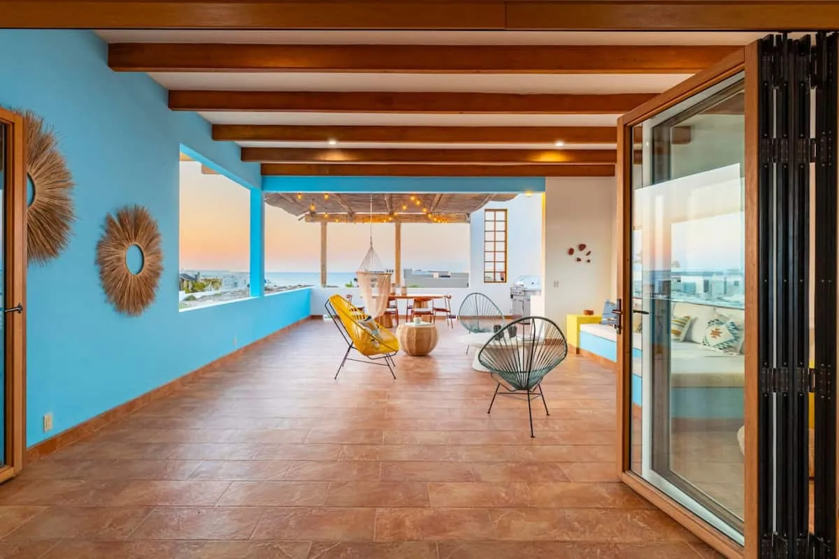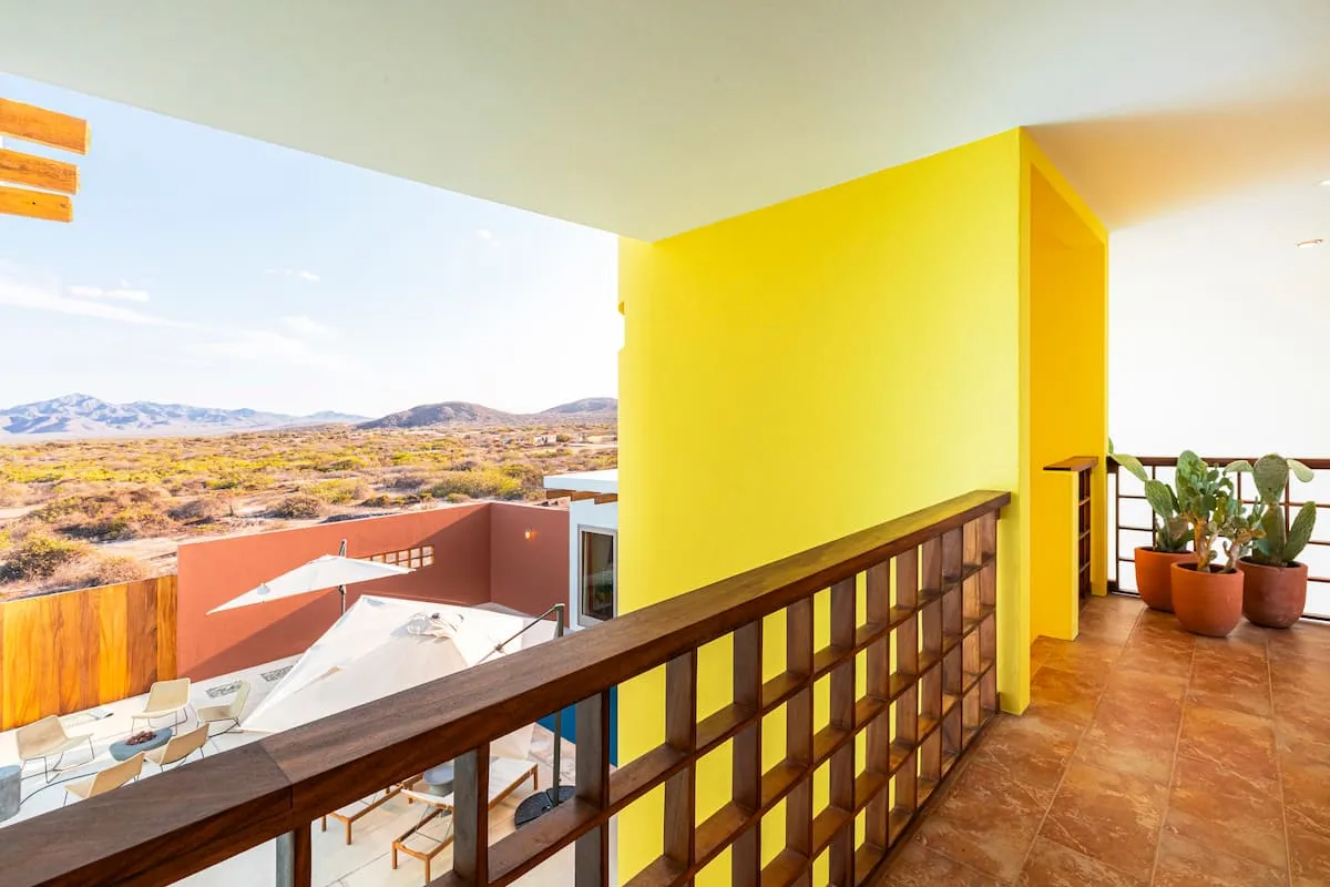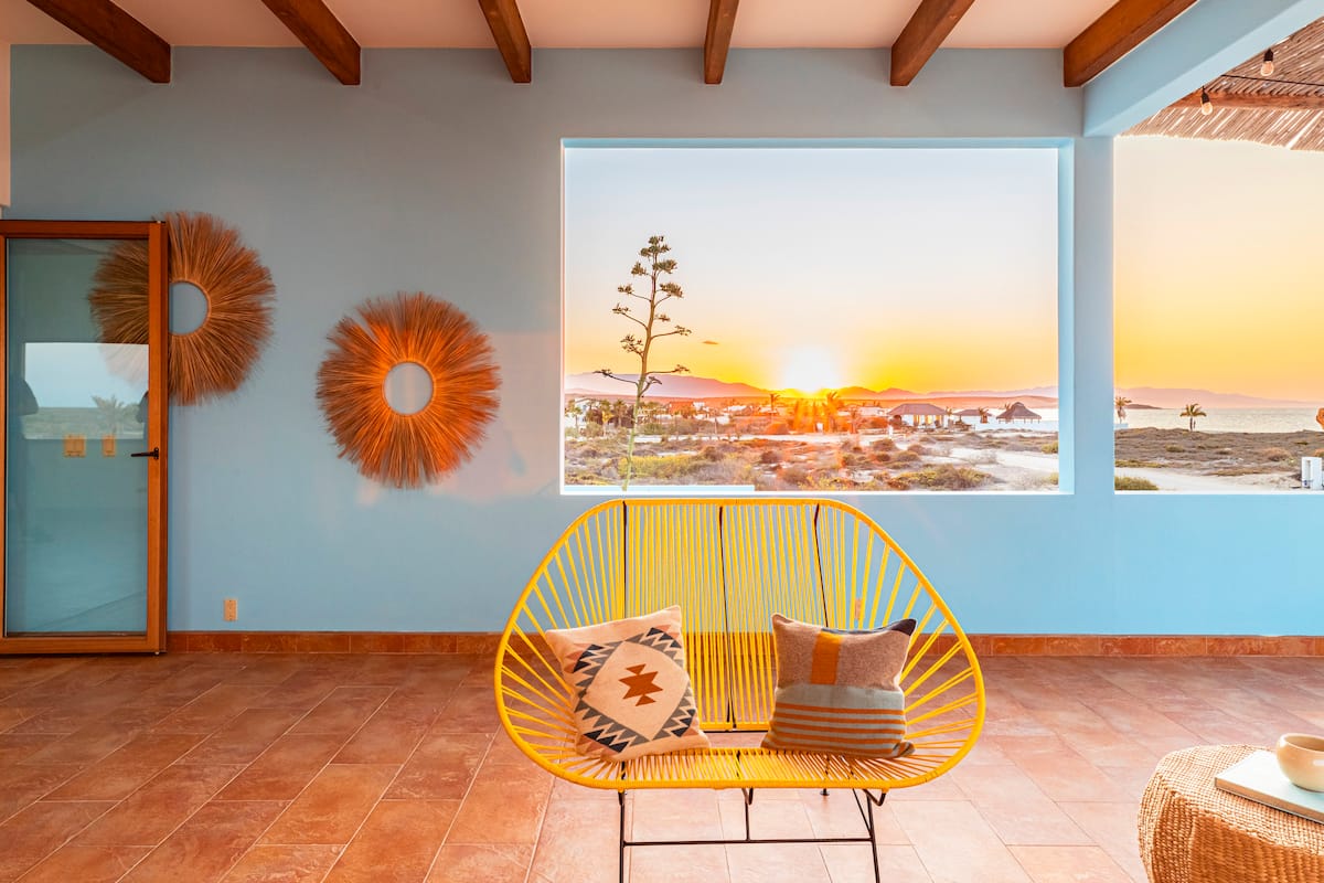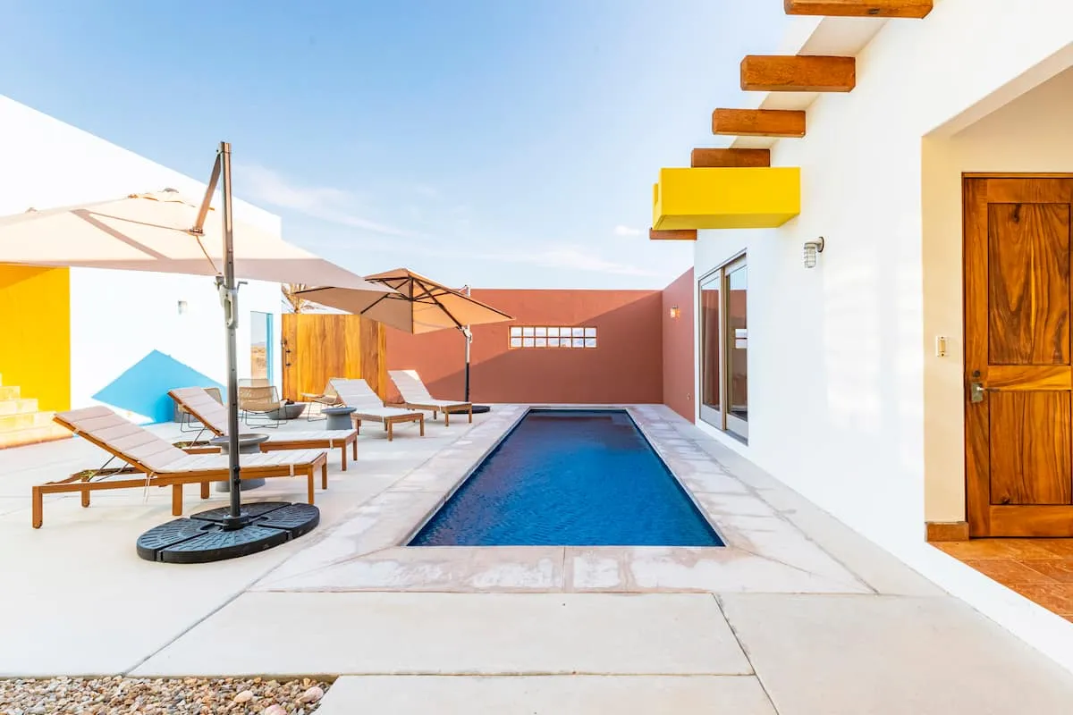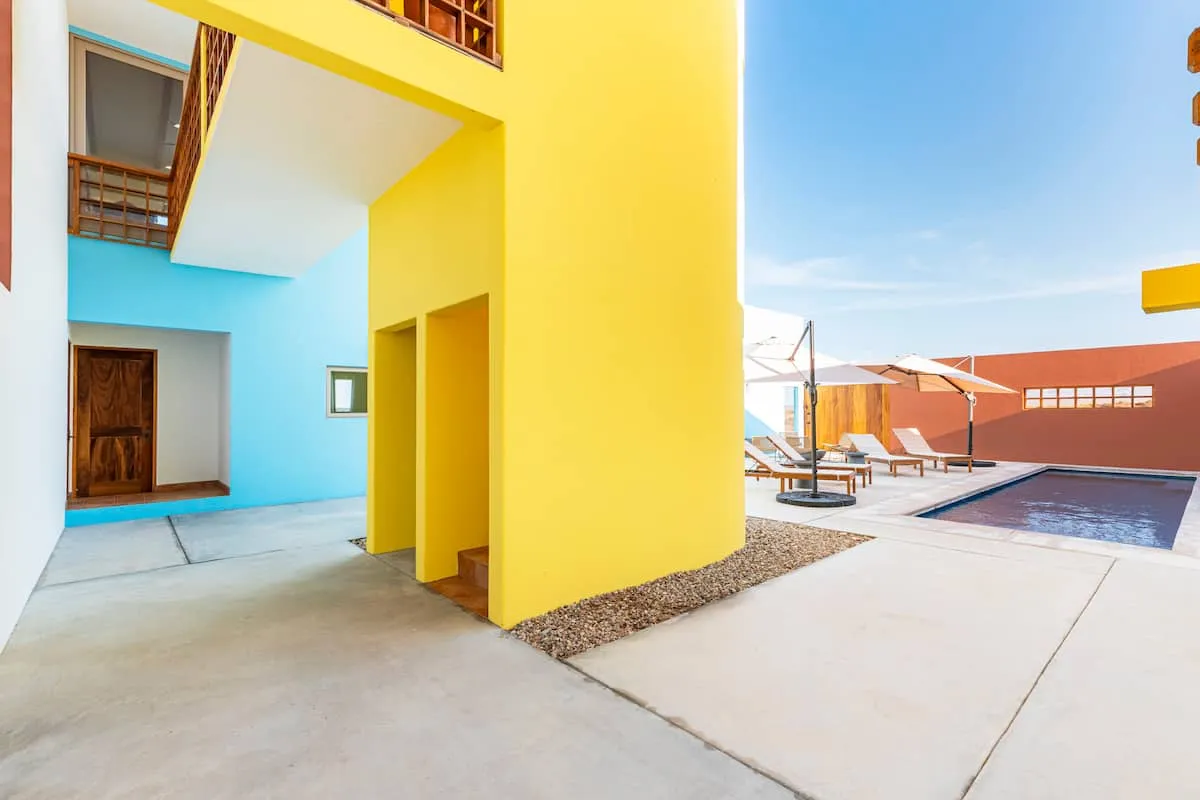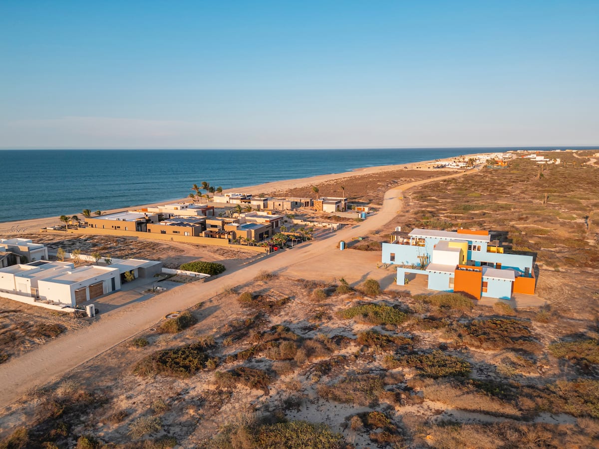 This contemporary beach house is a striking expression of modern architecture, defined by bold color accents and clean geometric lines. Thoughtfully designed and carefully positioned within a private beachfront community, the property sits just 50 yards from the shoreline, offering easy access to one of the most swimmable and serene stretches of the Sea of Cortez.