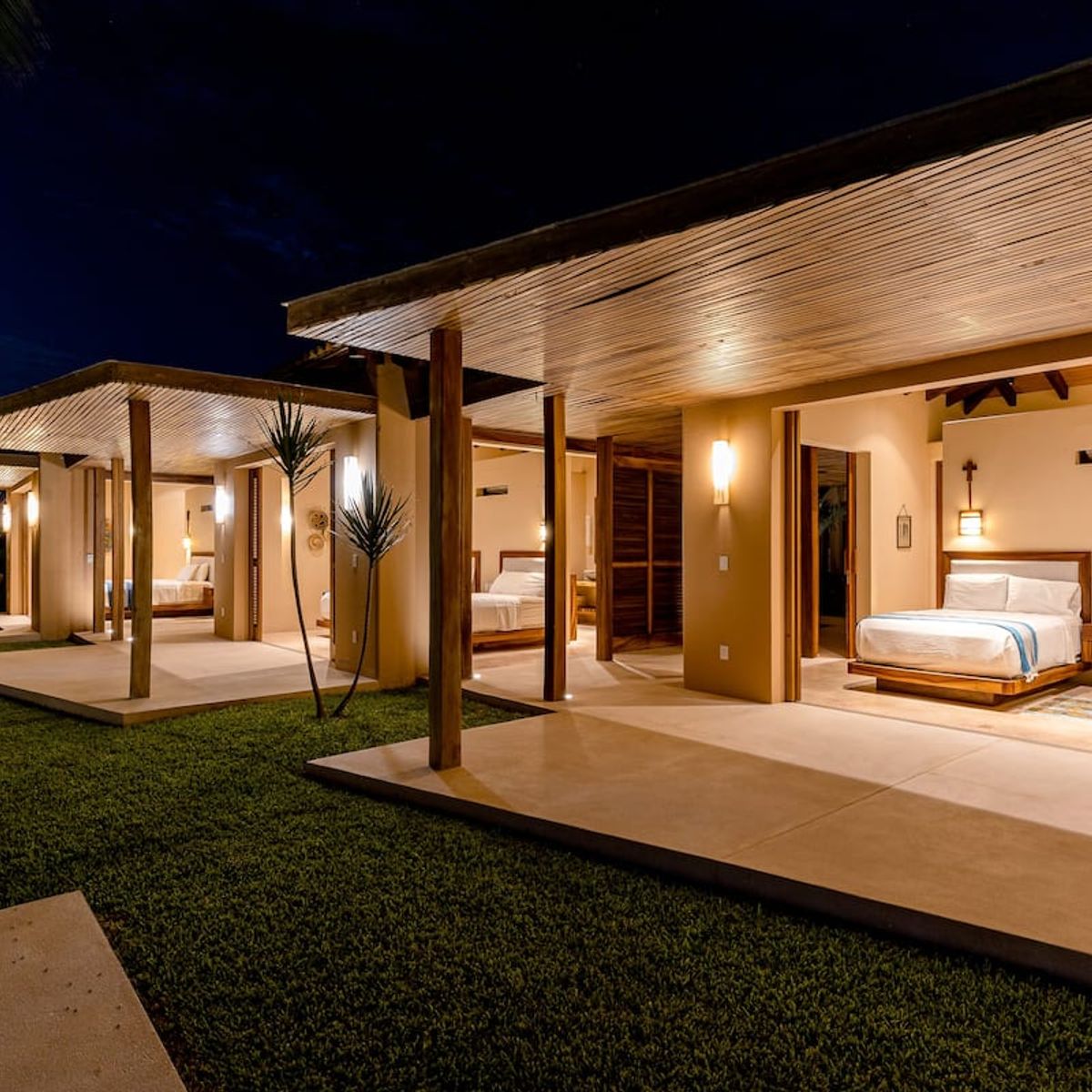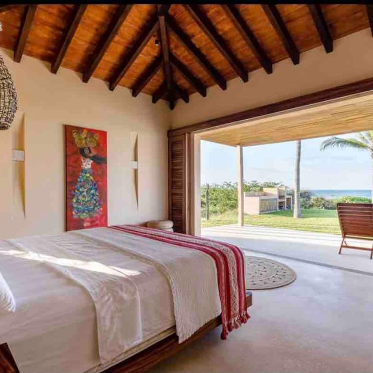 Five thoughtfully designed bedrooms, each with its own garden en-suite bathroom, accommodate up to fourteen guests in an atmosphere of effortless comfort. Four oceanfront master suites open to the sound of the waves, while a spacious bunk room provides an inviting space for families or groups of friends.