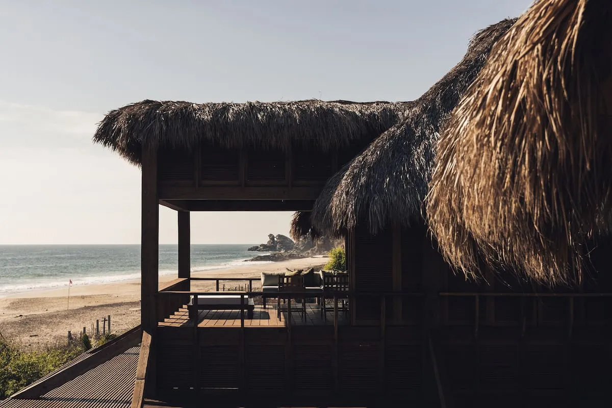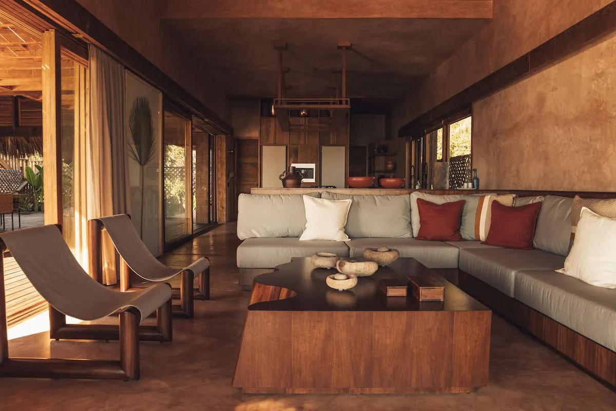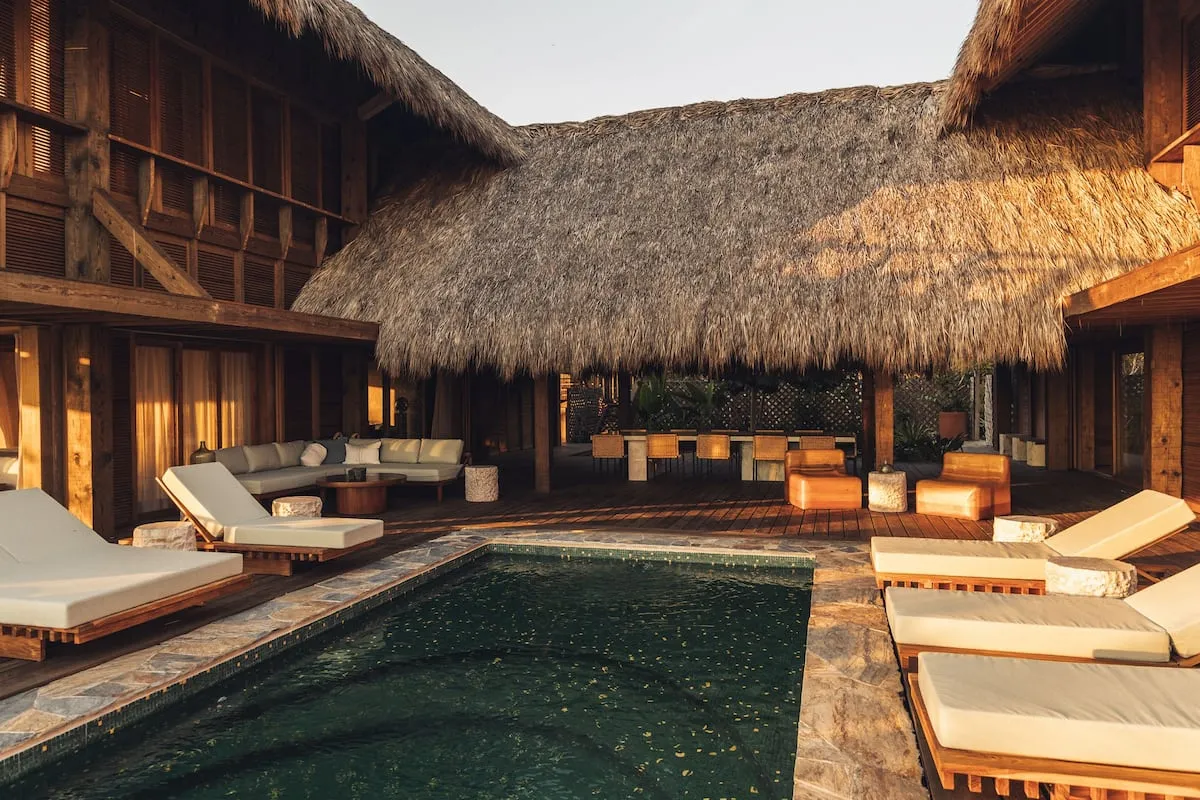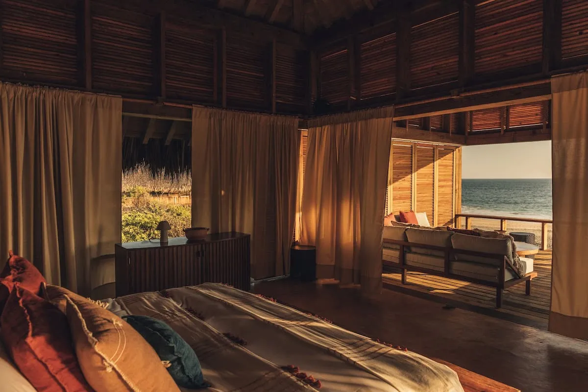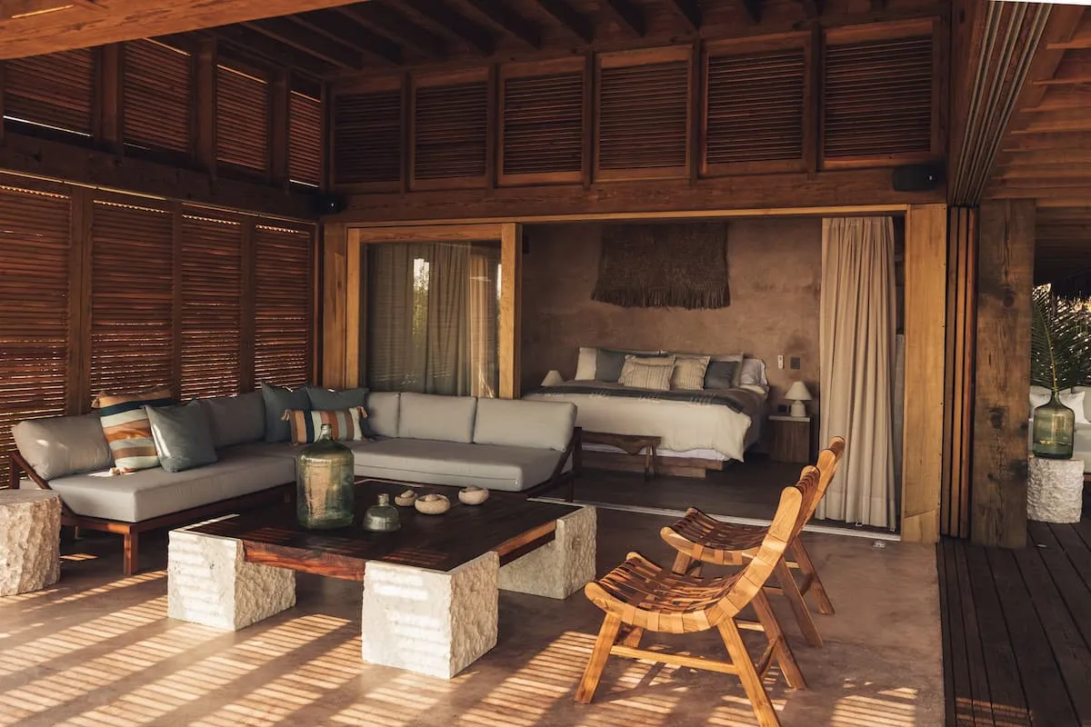 Casa de Mayo, designed by the renowned Massiv Studio, is an exclusive six-bedroom villa in Playa Mermejita, Mazunte. Blending architectural elegance with the beauty of nature, it accommodates up to fourteen guests in comfort and style.