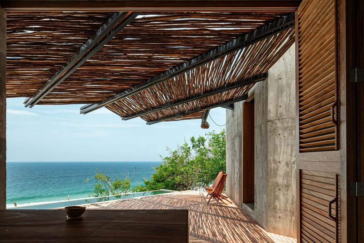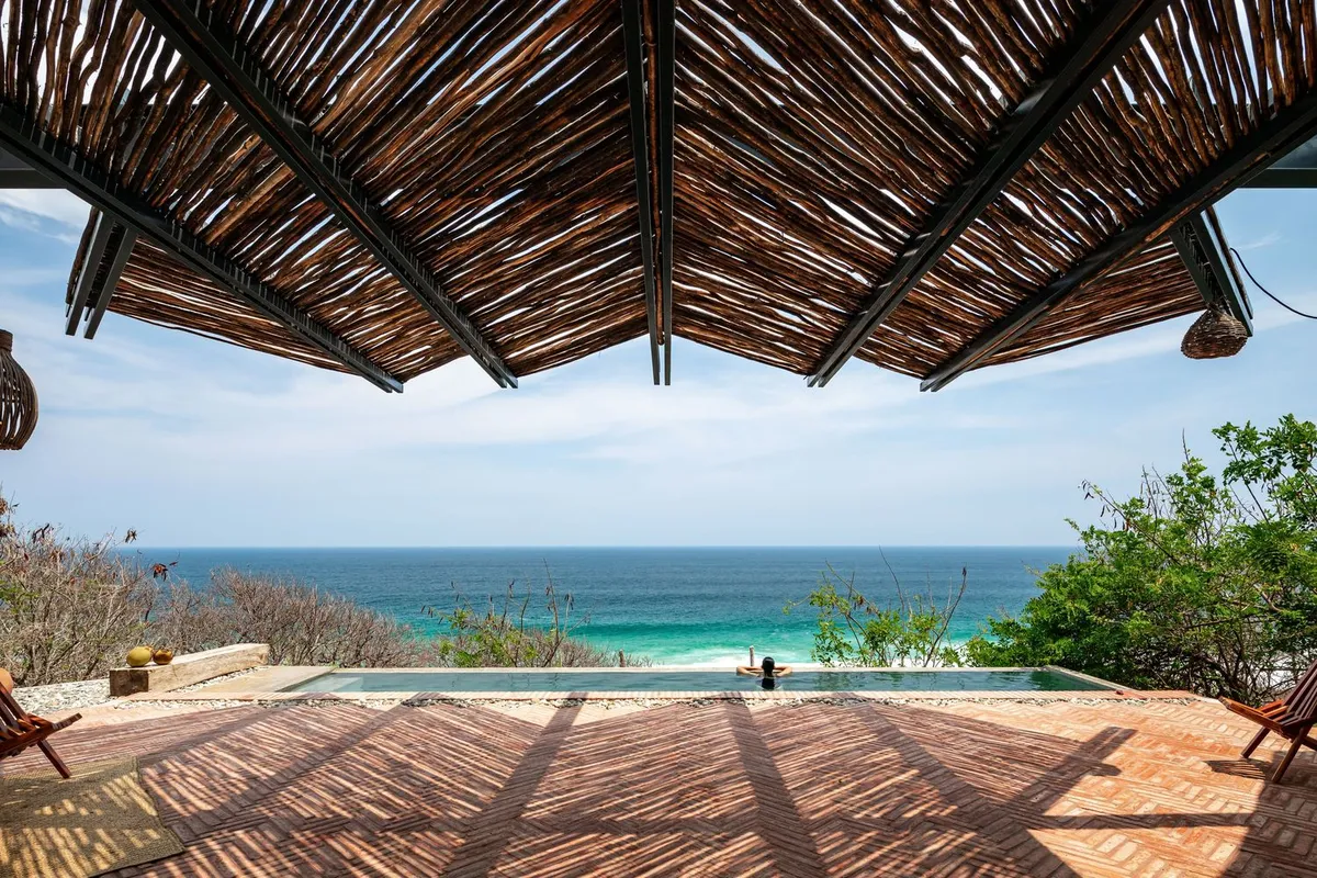 Set on the rugged Oaxaca coast, Casa del Sapo is a jaw-dropping, brutalist masterpiece perched dramatically on a cliff above Zapotengo Beach. This hidden gem is just a brief drive away from the Huatulco International Airport, making it an accessible paradise for travelers seeking natural beauty and tranquility. It's also a 90 minute or so drive from Puerto Escondido.