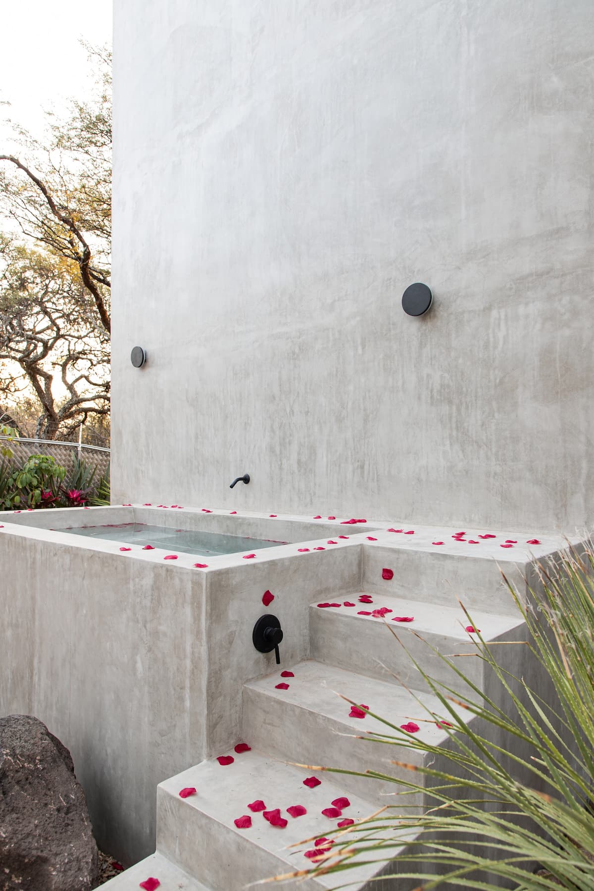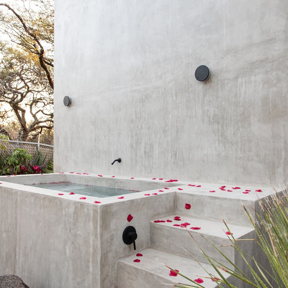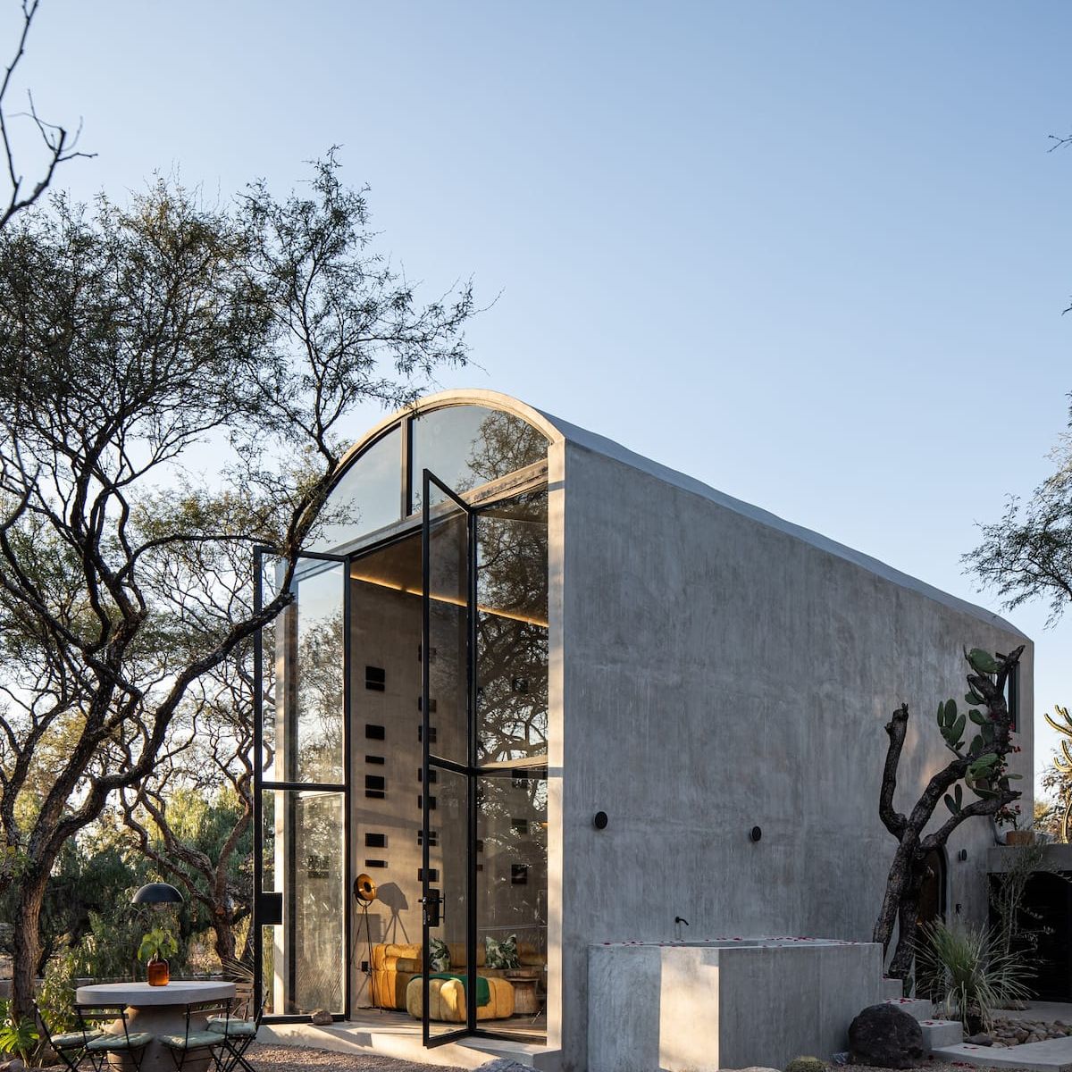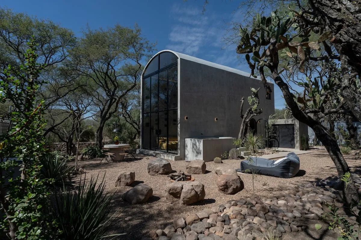 The exterior is designed for outdoor living and relaxation. Shaded by mesquite and cactus trees, the outdoor area includes a comfortable seating space, a hammock, a fire pit, and a dining area with a wood and charcoal-fired grill. An oversized soaking tub with hot and cold water provides a serene spot for unwinding under the open sky, whether enjoying the stillness of the surroundings or stargazing at night.