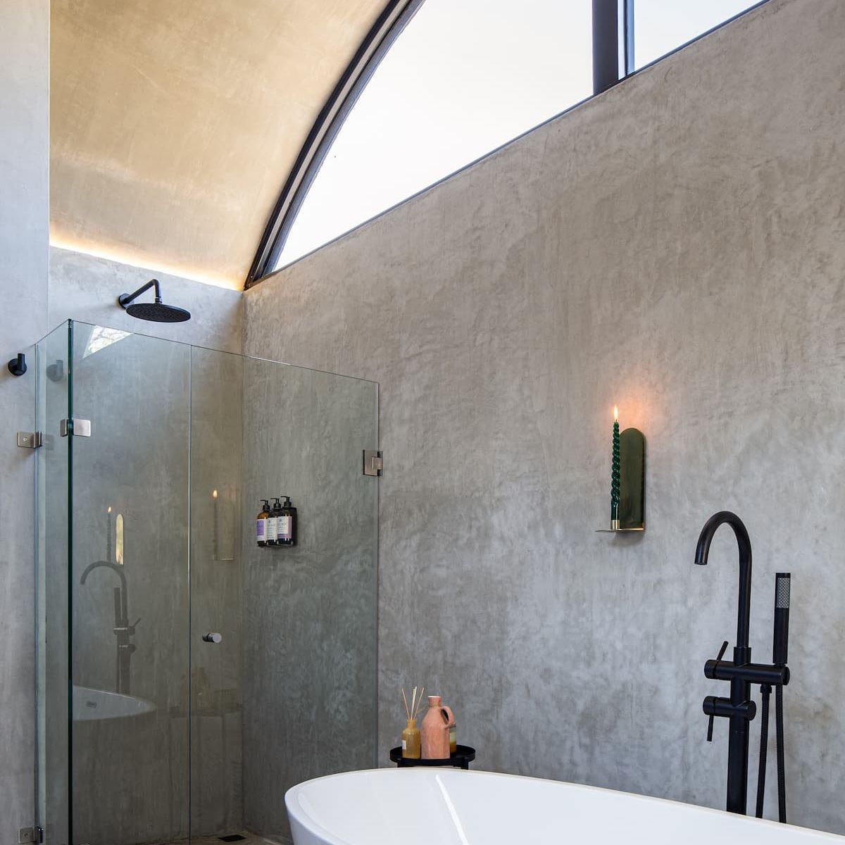 The interior includes an open living space with floor-to-ceiling glass doors that connect the indoors to the outside. The modern kitchen is fully equipped with appliances, cookware, and utensils, making it functional and convenient. A loft-style king bedroom overlooks the living area and includes an ensuite bathroom with an oversized soaking tub, perfect for relaxation. For entertainment, the living area transforms into a cinema-like space with a projector screen and remote-controlled blinds.