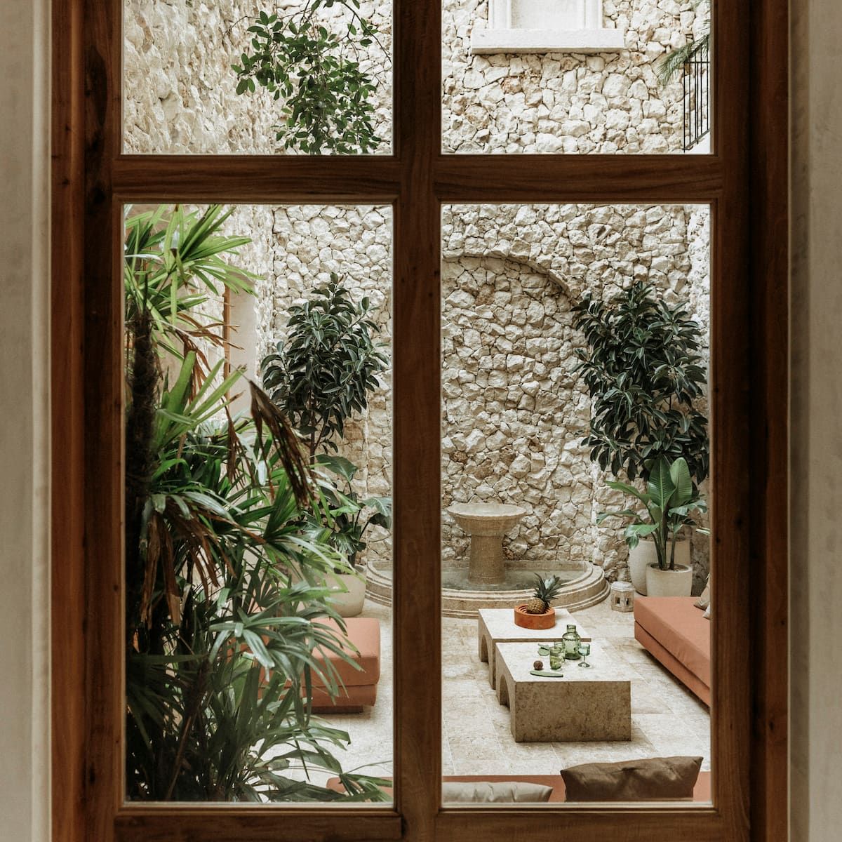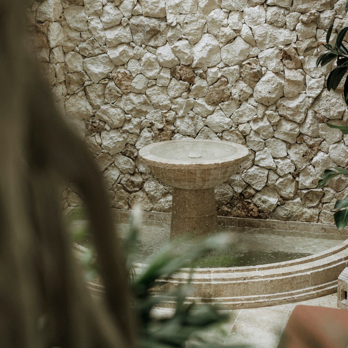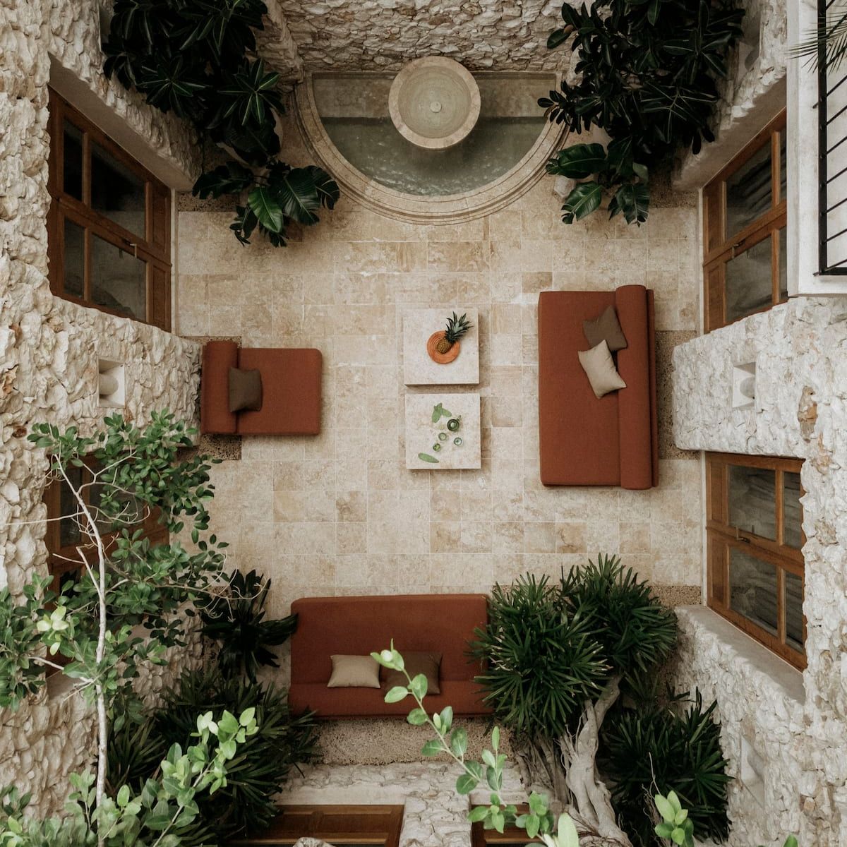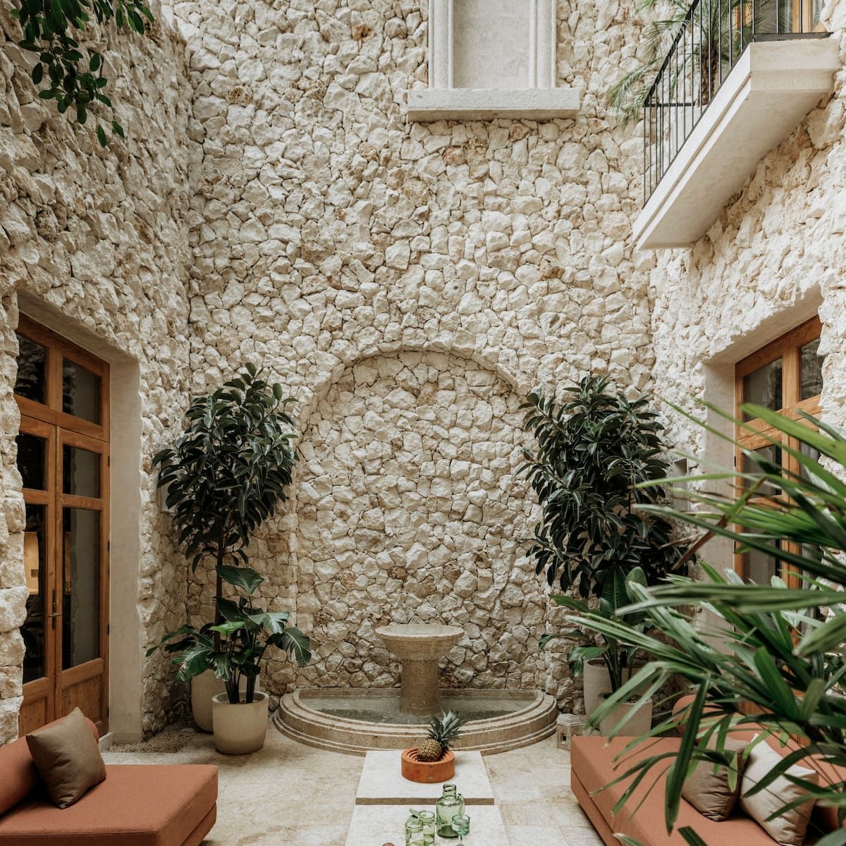 At the center of the property is a lush, shaded patio surrounded by natural stone walls, ambient lighting, and a tranquil water feature. It includes three outdoor sofas under a large tropical tree.