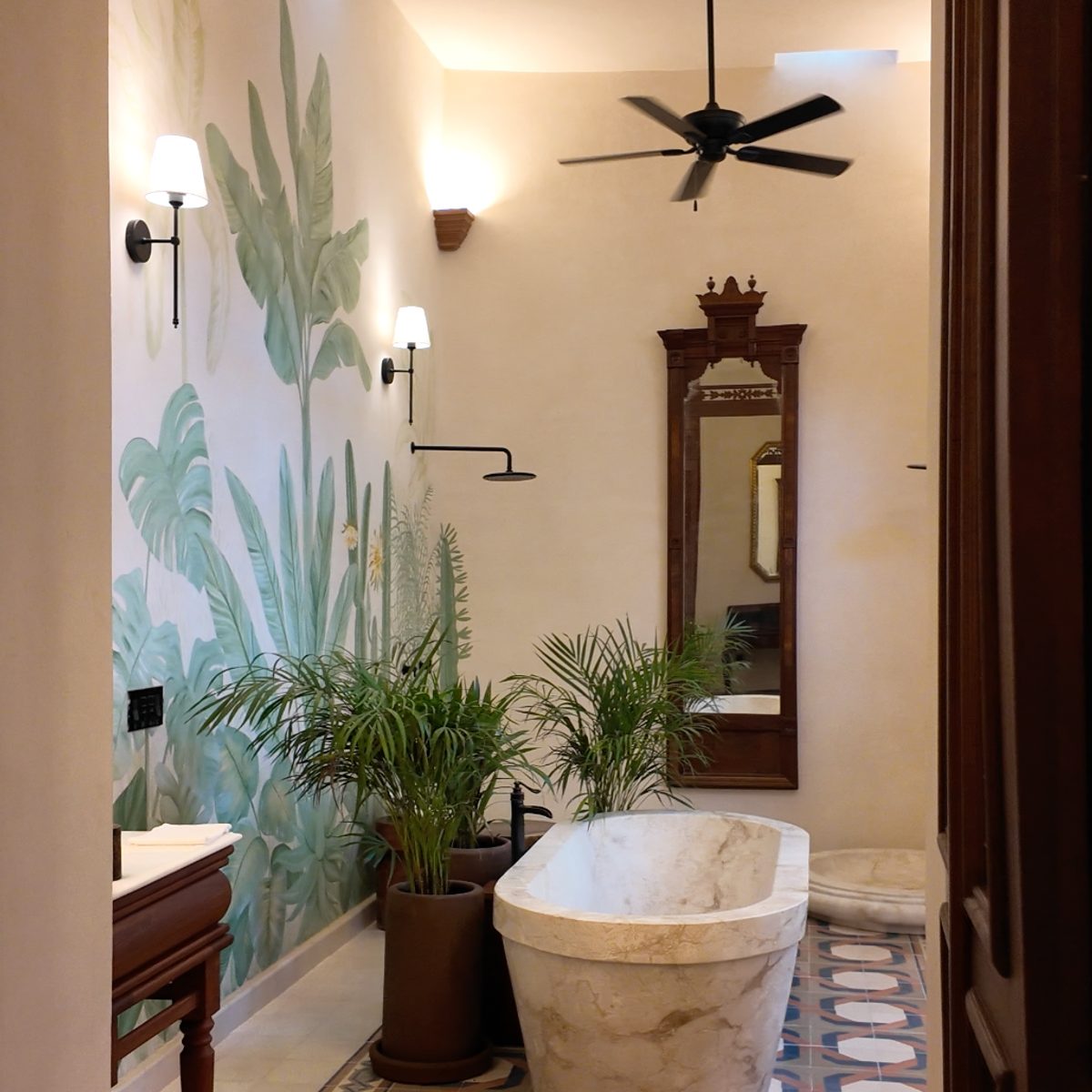Each ensuite bedroom has four post beds and marble soaking tubs (and the primary bedroom has his and hers tubs).