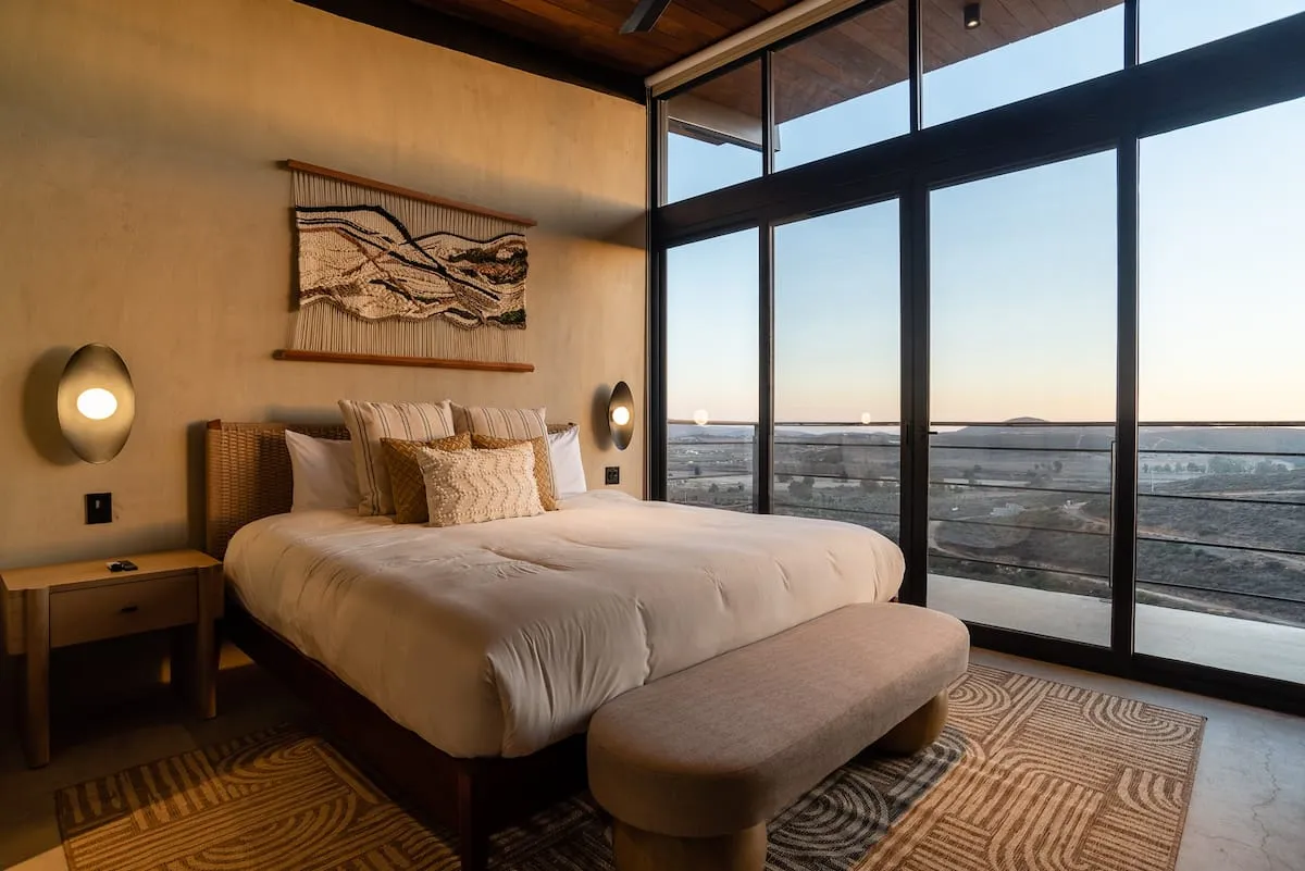 Step into a designer's dream house! This brand-new architectural gem sits on a hilltop, blending seamlessly with the landscape and offering breathtaking views of mountains and vineyards. With 4 bedrooms, 3 bathrooms, a heated pool, a fire pit, and multiple lounge areas, every detail has been tailored to create a perfect getaway. Unique indoor gardens and a connection to nature create a serene escape. A rare find, this stay has quickly become a top favorite among guests in Valle de Guadalupe.