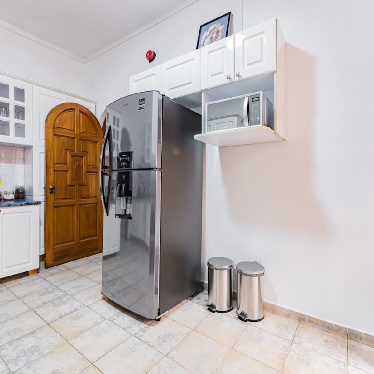 Kitchen & Dining: Microwave, oven, refrigerator, stove, toaster, wine glasses. Large dining table for shared meals.