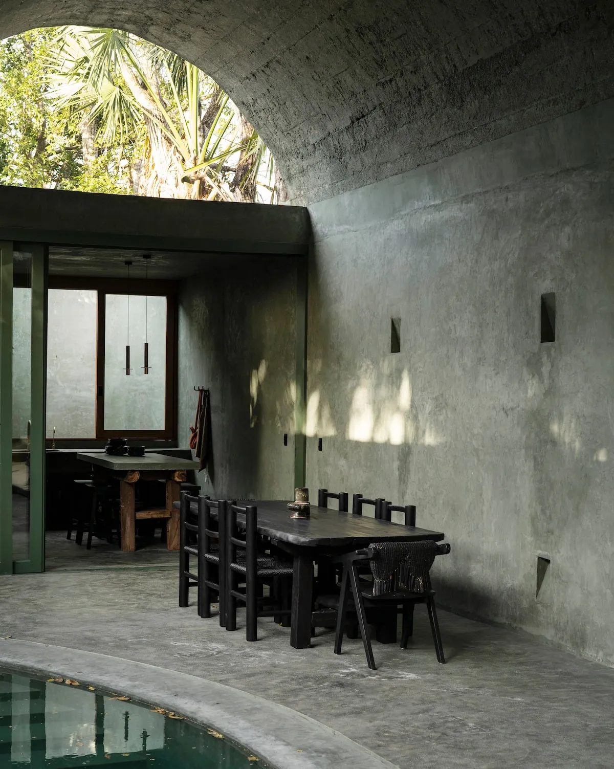 At the heart of the house, a vaulted terrace with a pool, open-air living room, and dining area invites guests to gather and unwind. The fully equipped kitchen opens to the terrace, creating a seamless flow between indoor and outdoor living spaces.