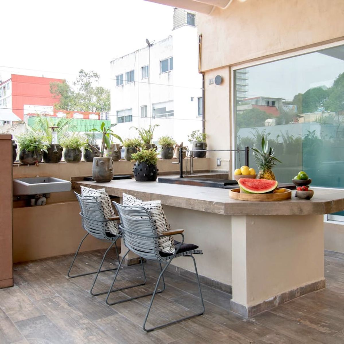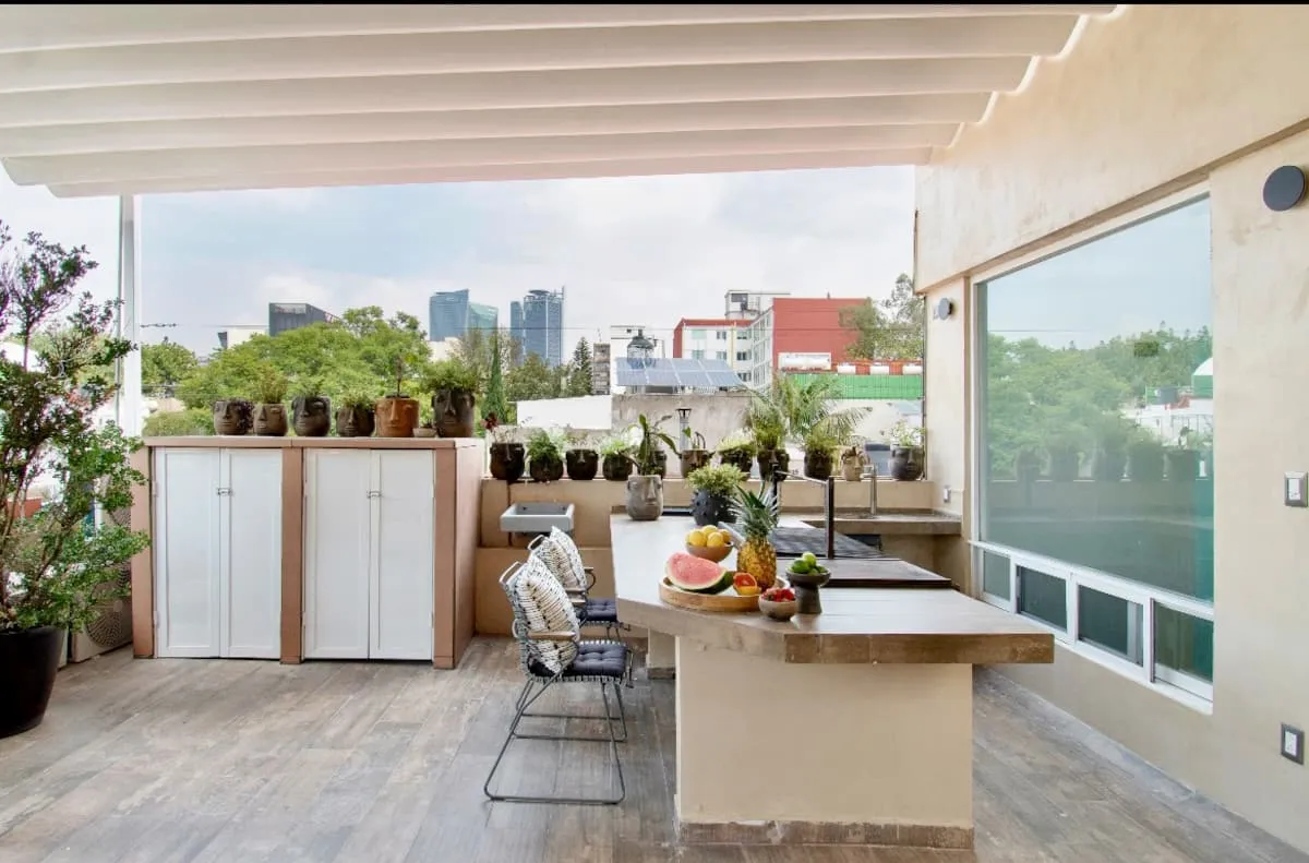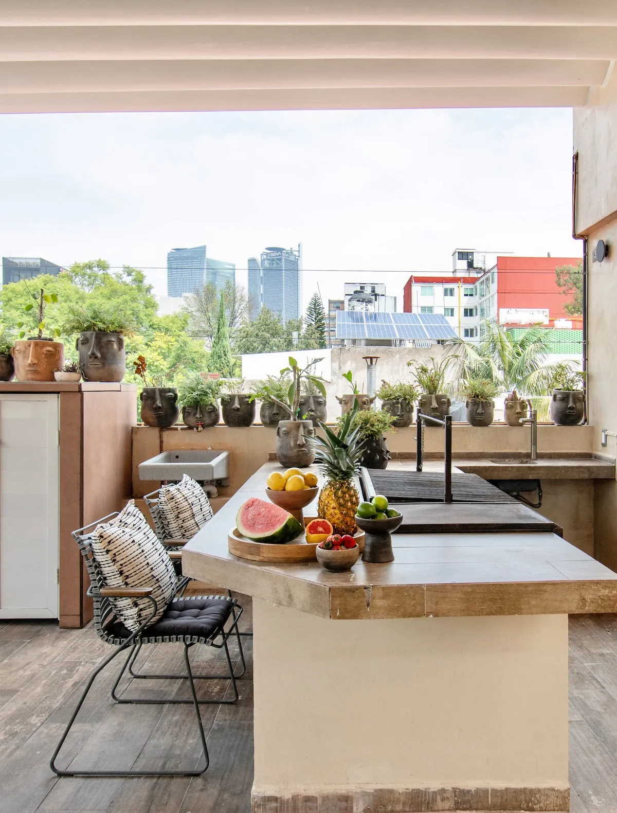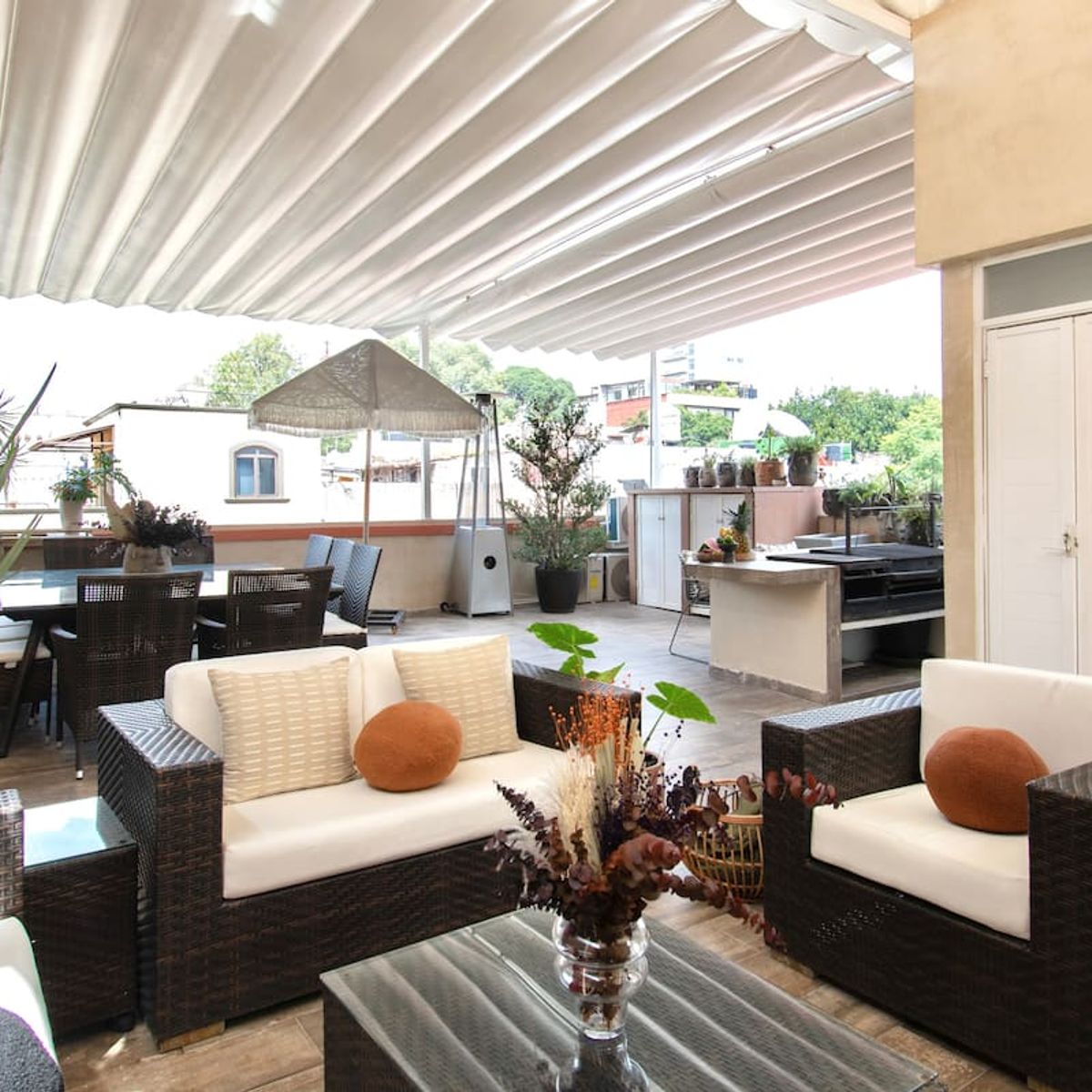 Up above, the rooftop sanctuary offers a lounge, dining table, and grill: perfect for gatherings under Mexico City’s sky, whether it’s a sunny afternoon or a starry night.