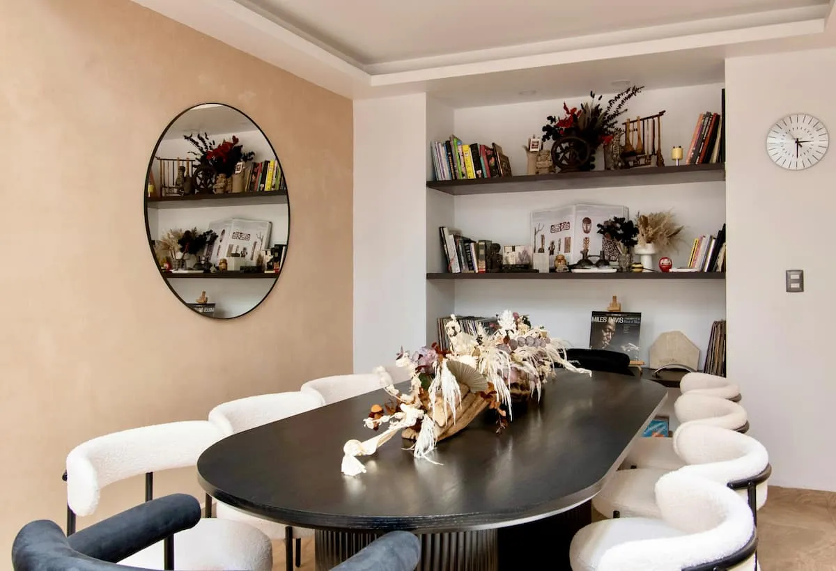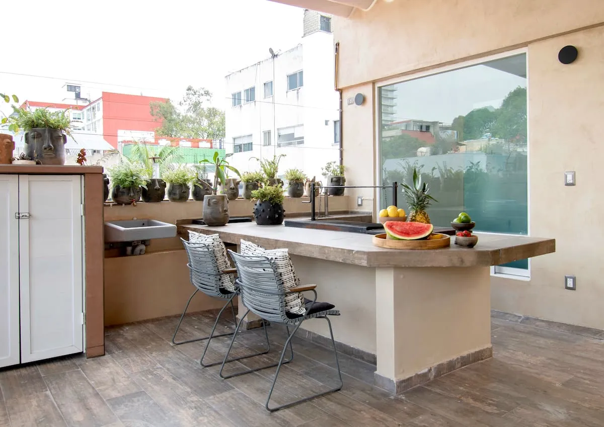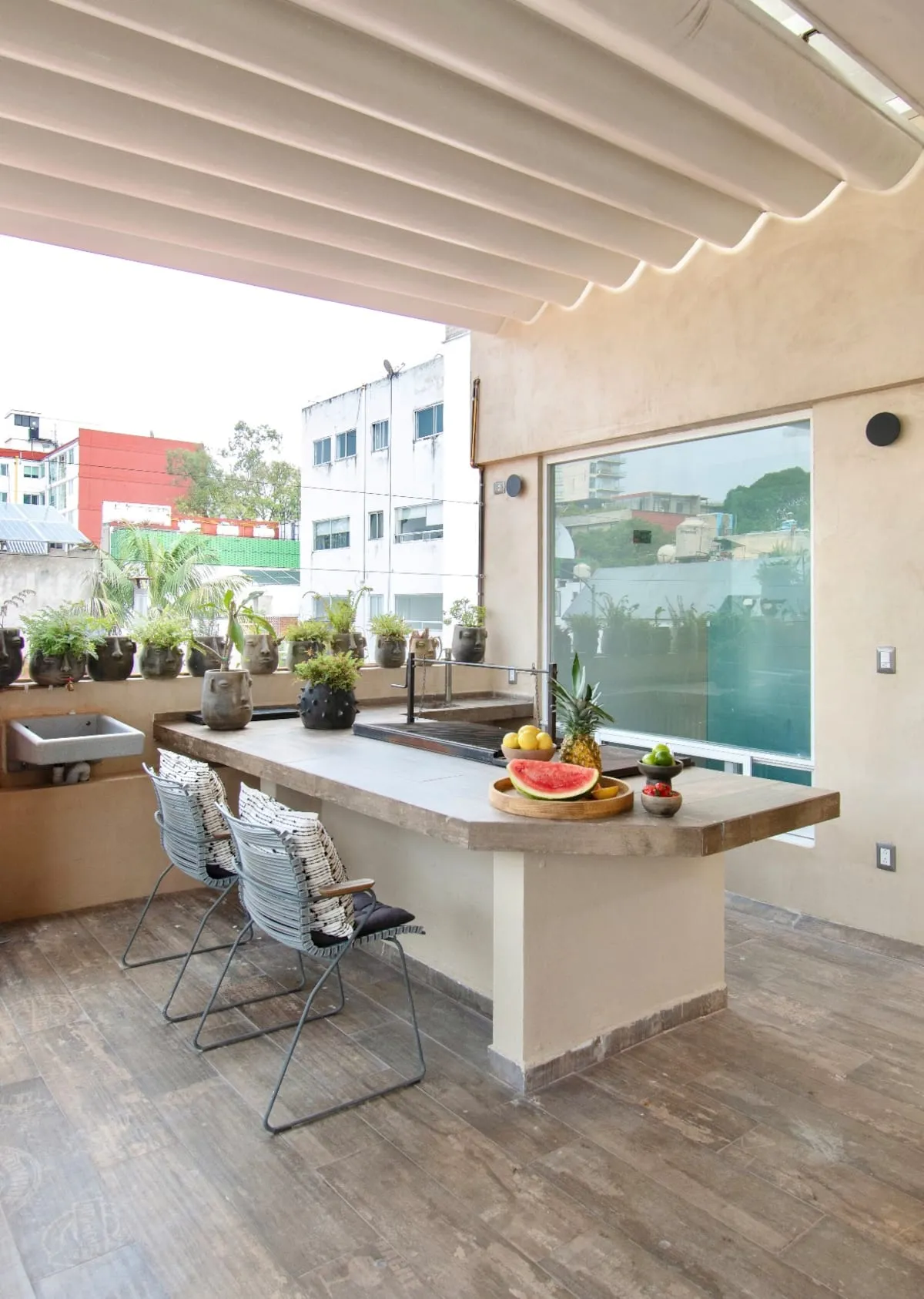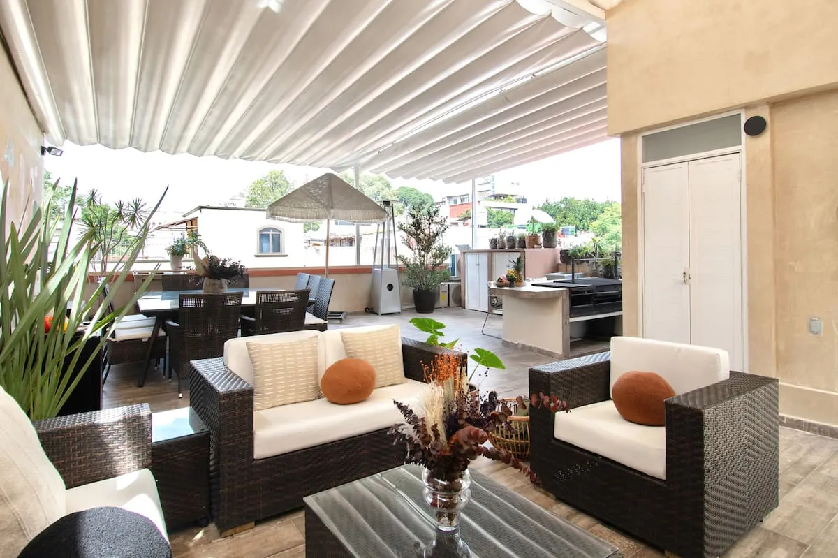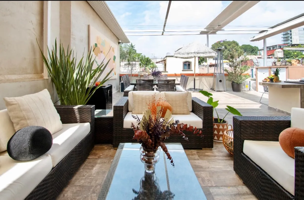 Up above, the rooftop sanctuary offers a lounge, dining table, and grill: perfect for gatherings under Mexico City’s sky, whether it’s a sunny afternoon or a starry night.