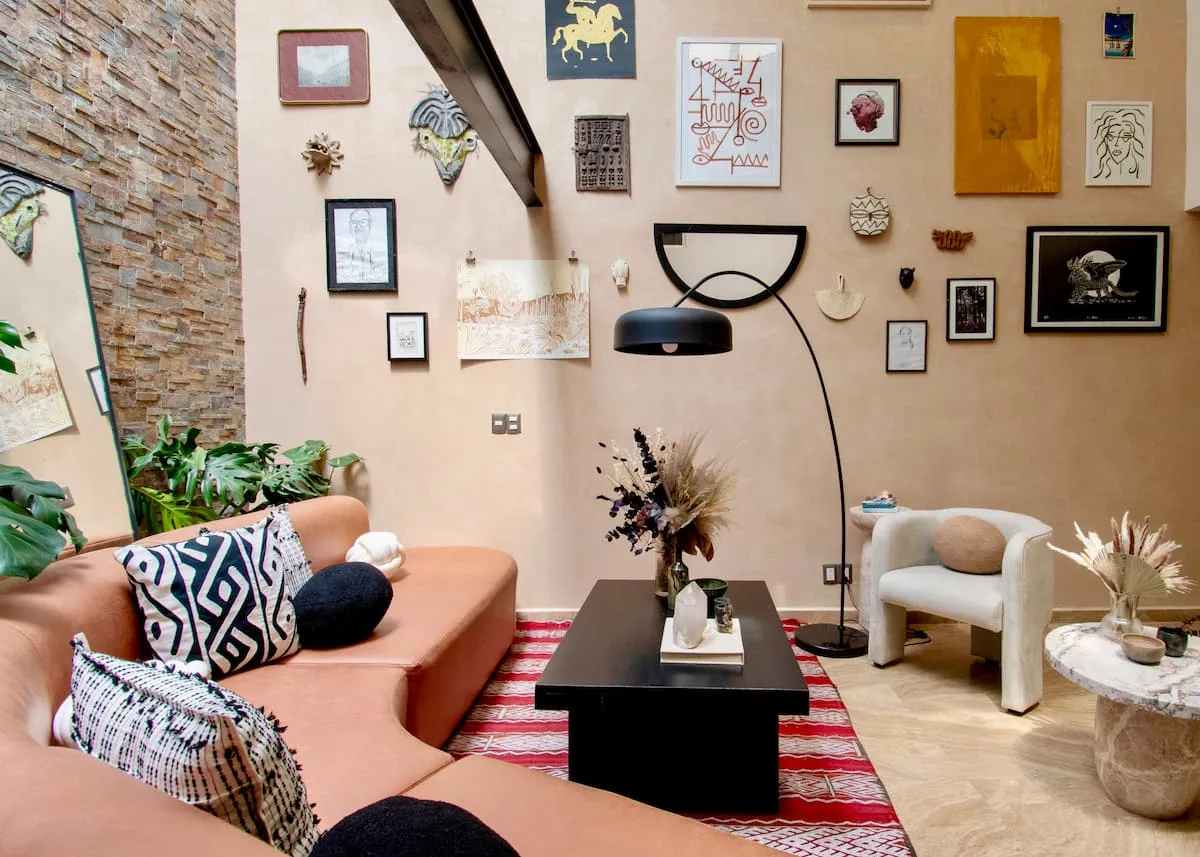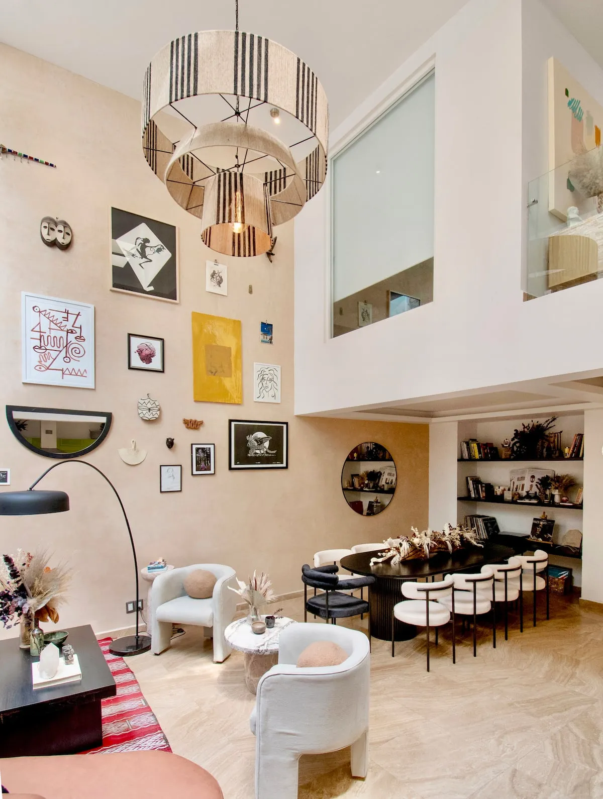 Step into a soaring living room with triple-height ceilings and an art wall curated with works and objects collected over years of exploration. The spaces are warm yet contemporary, with textures that move from polished stone to woven fibers, terracotta tones, and greenery.