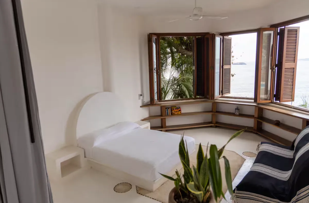 Down a few stairs in the room is a queen bed and futon for any extra guests - with 3 big windows overlooking the ocean.