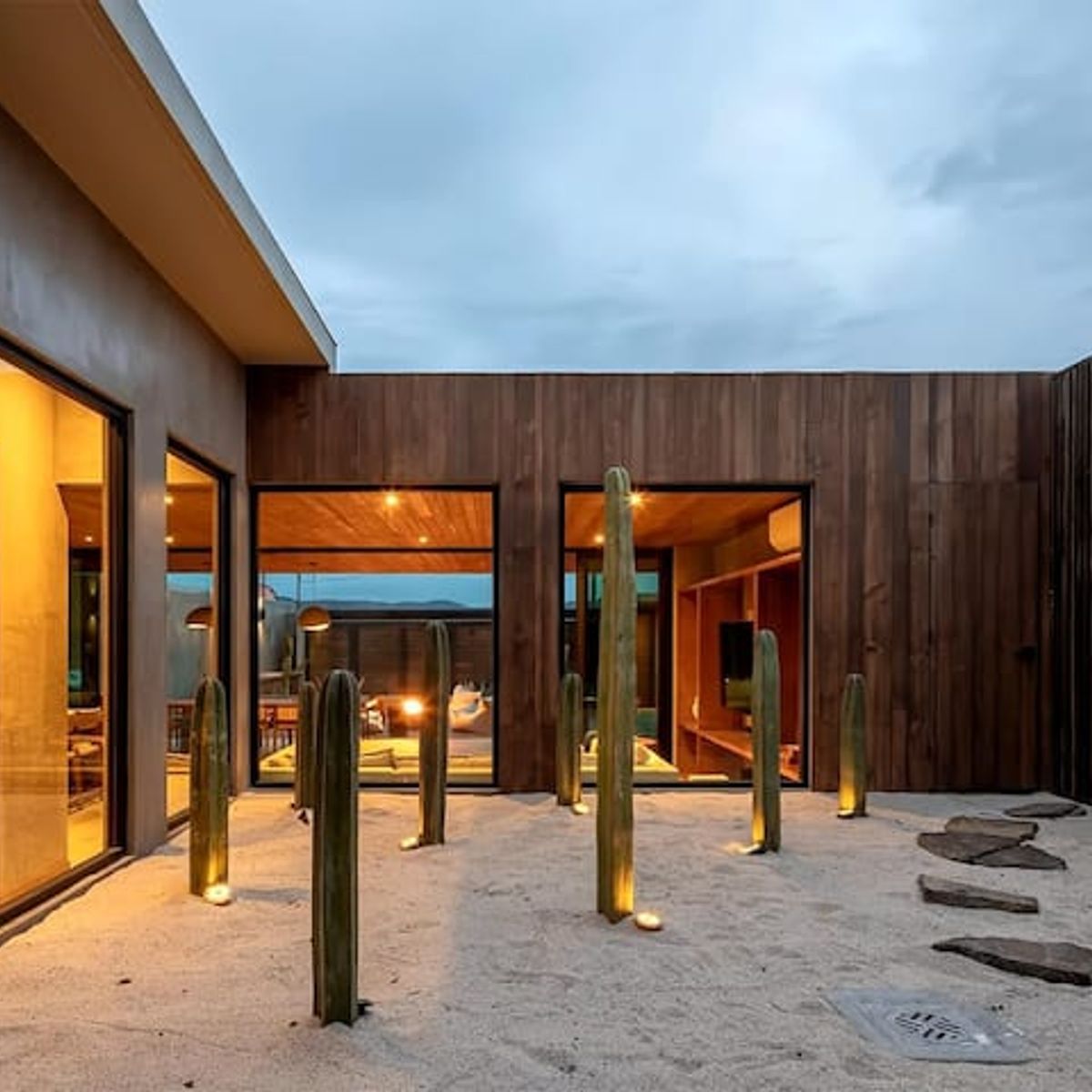 It is specifically designed to comfortably host a group of up to 9 people in its 4 king-size suites, 4 full bathrooms, and huge open spaces that beautifully melt together the living room and kitchen area with the outdoor dining and grilling area and fire pit lounge plus many indoor gardens and patio with a built-in hot tub.