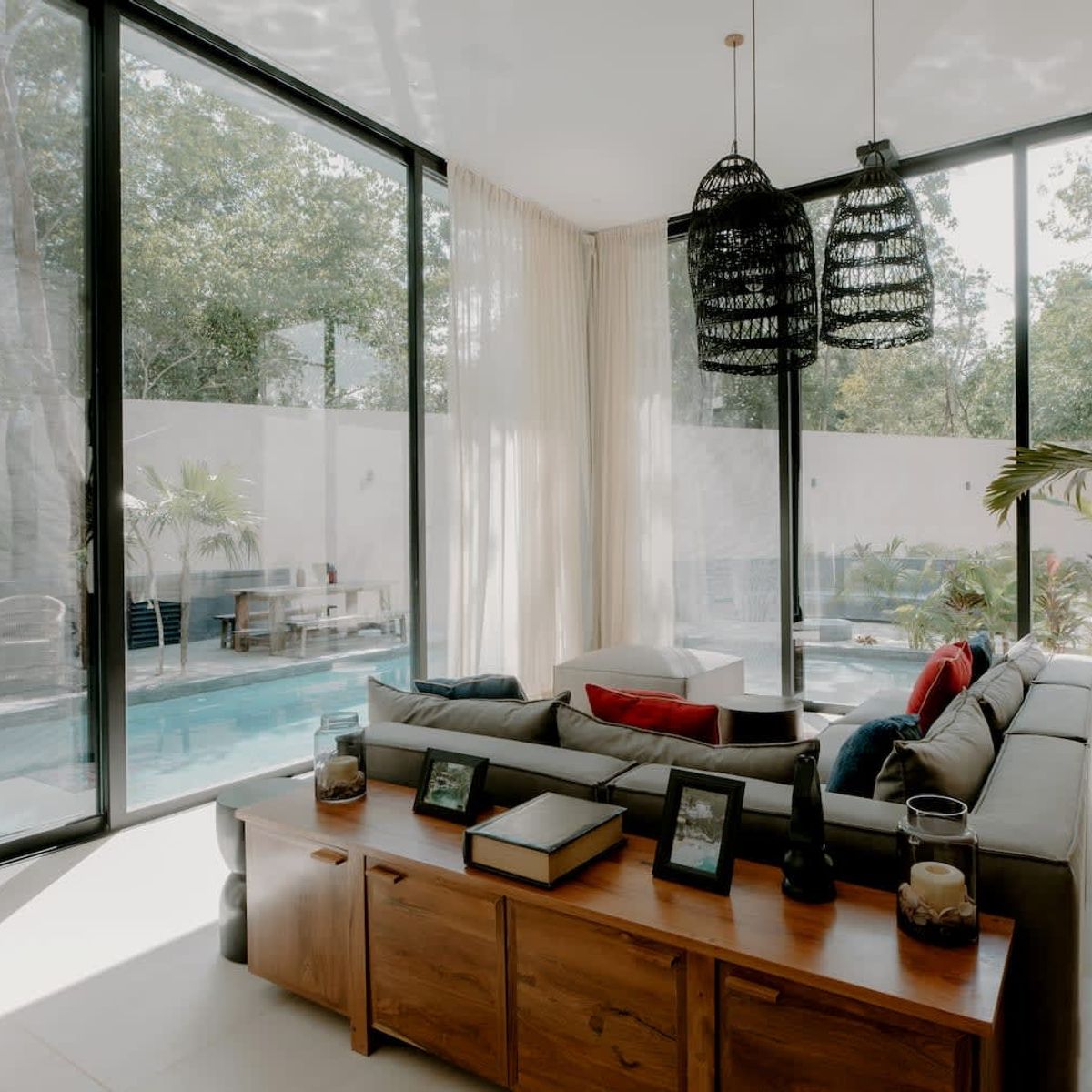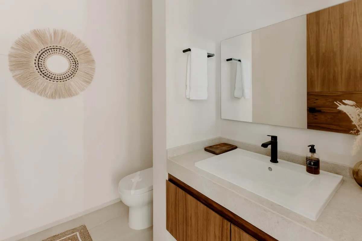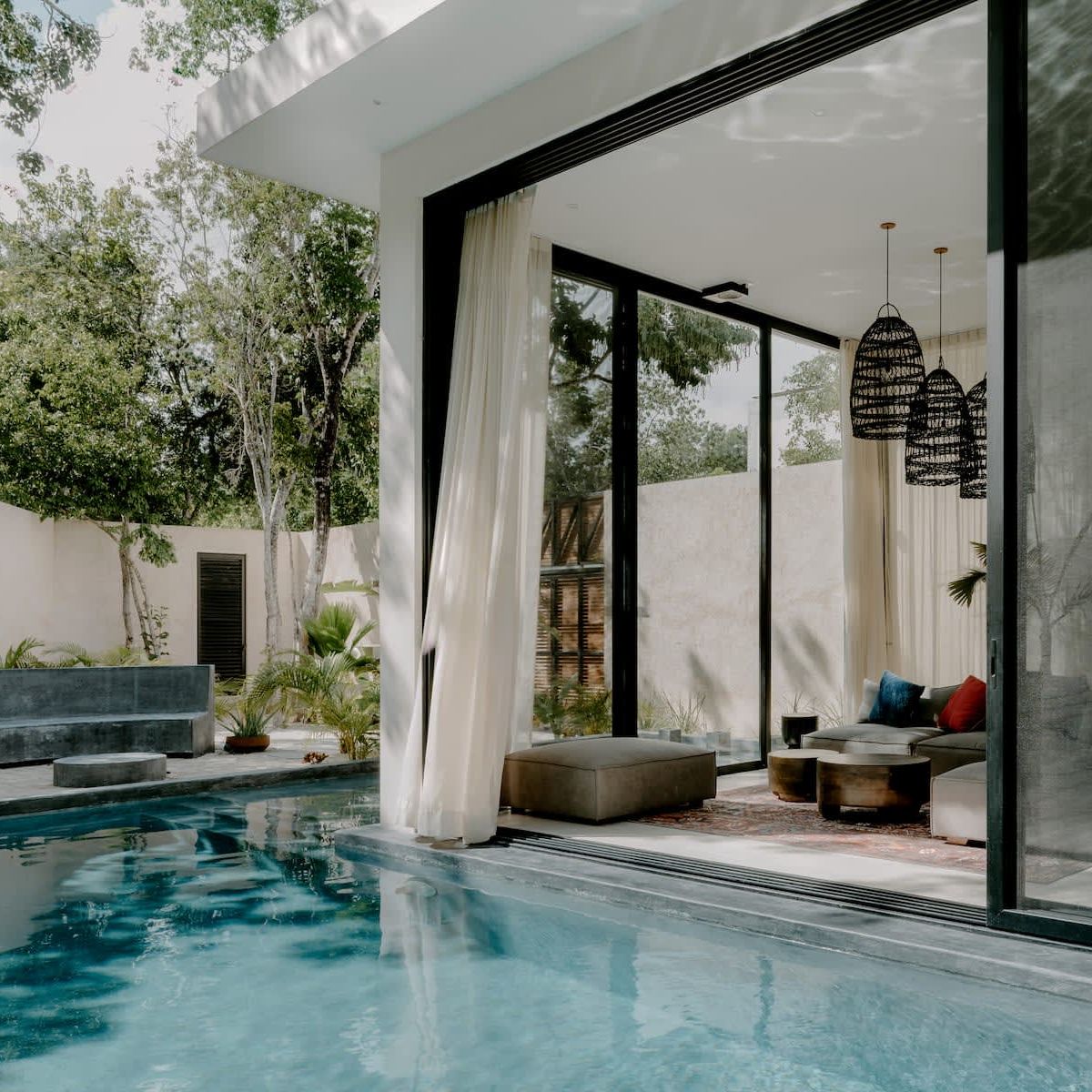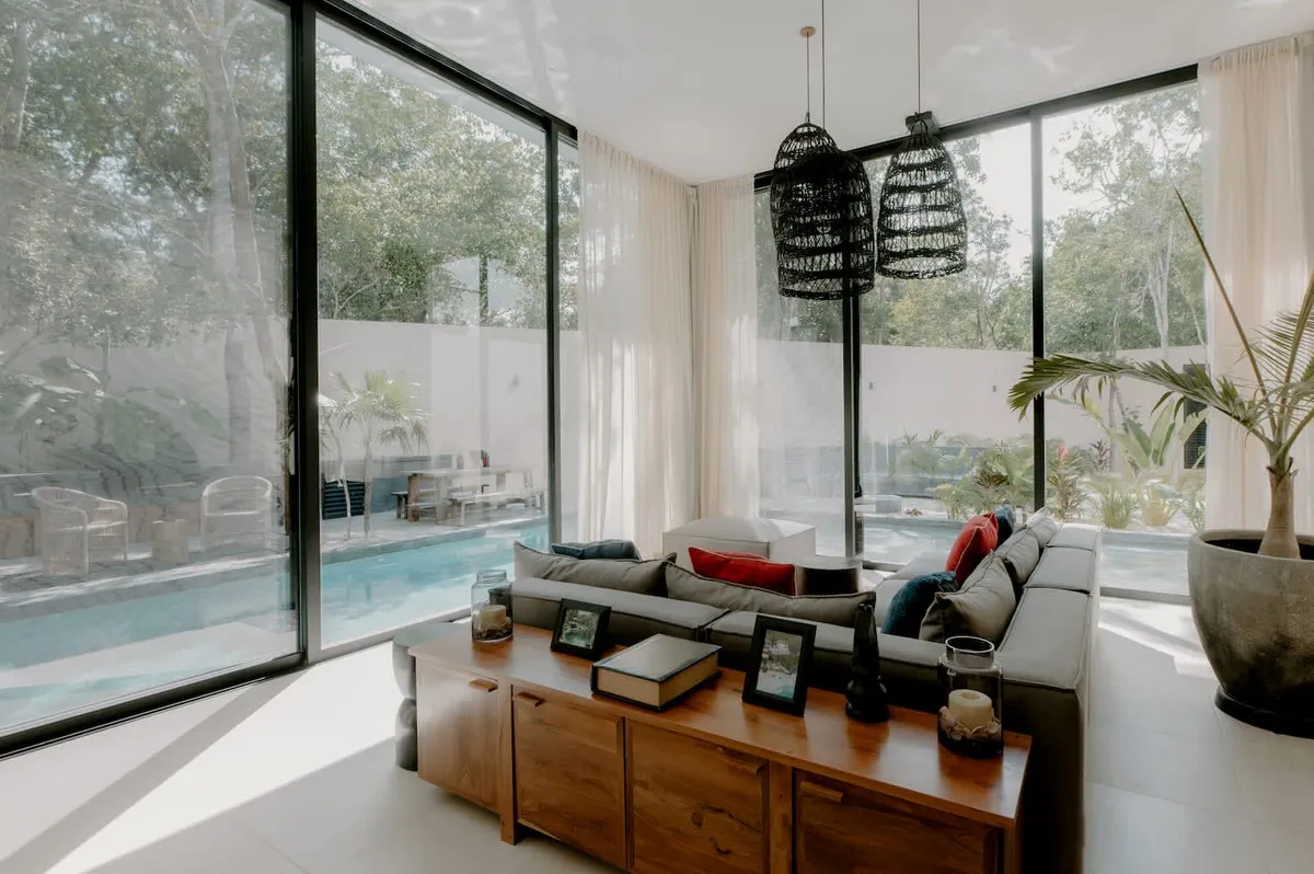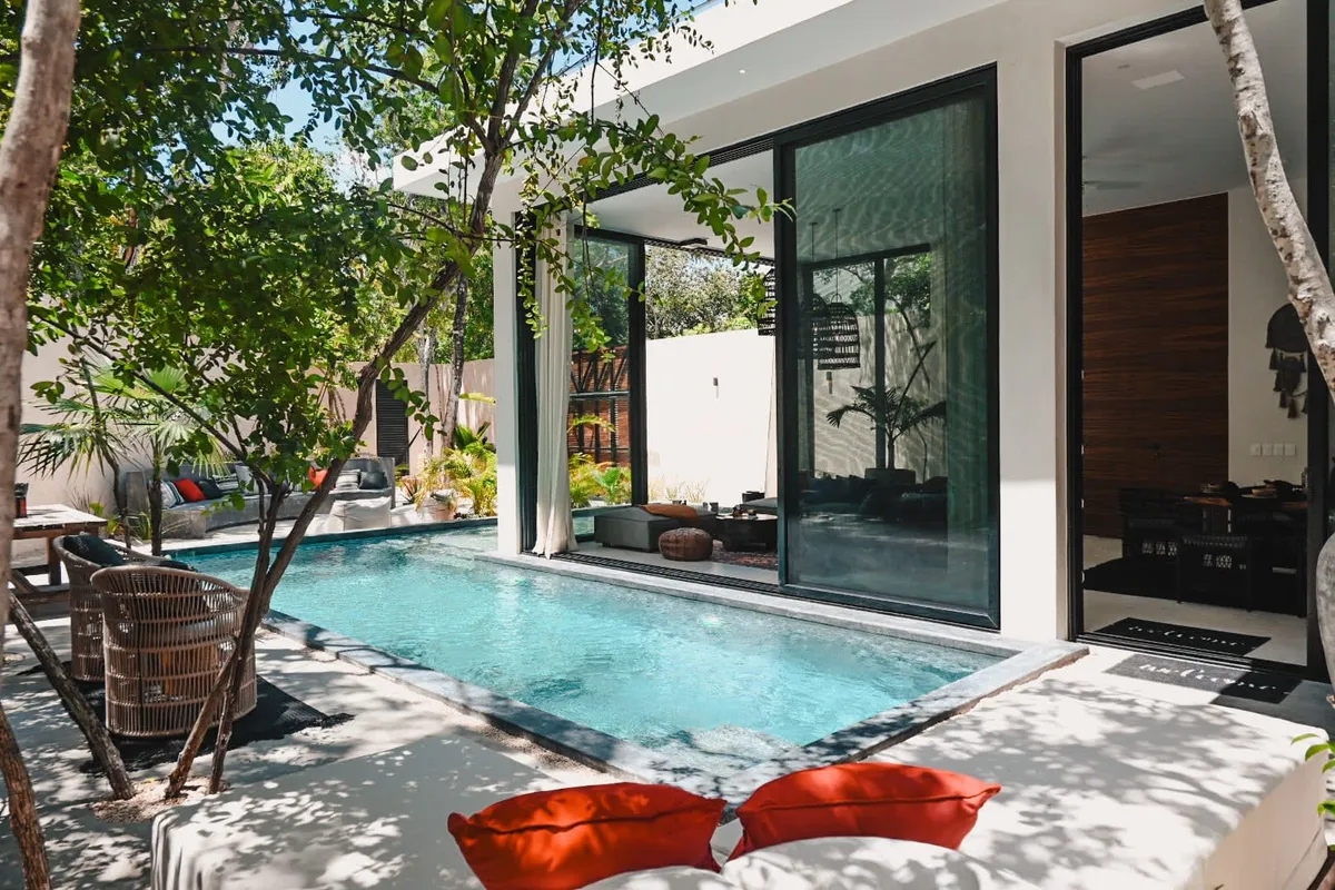 Experience the peacefulness of Tulum's FloraFauna community at this beautiful three-story villa. Panoramic glass doors seamlessly connect indoor and outdoor spaces, revealing a relaxing wrap-around pool.