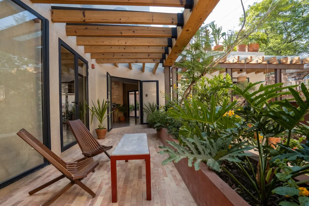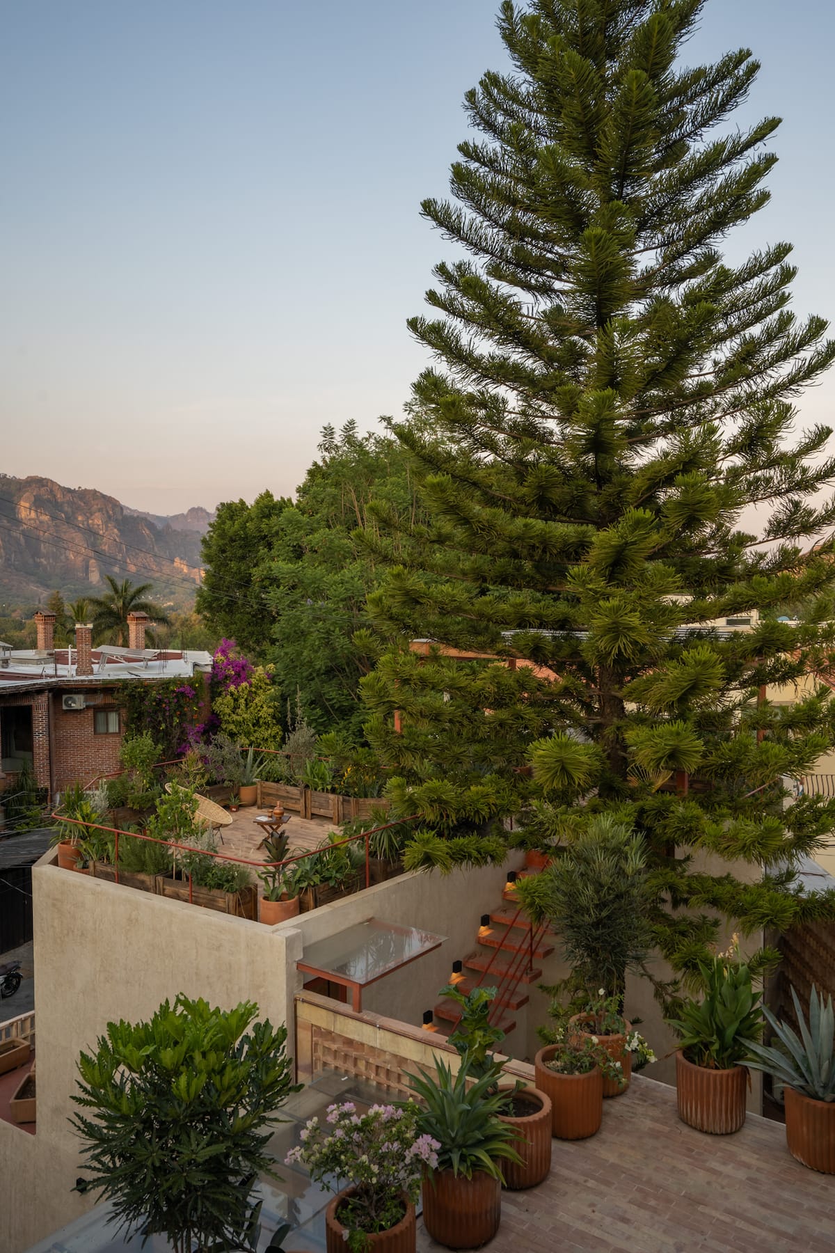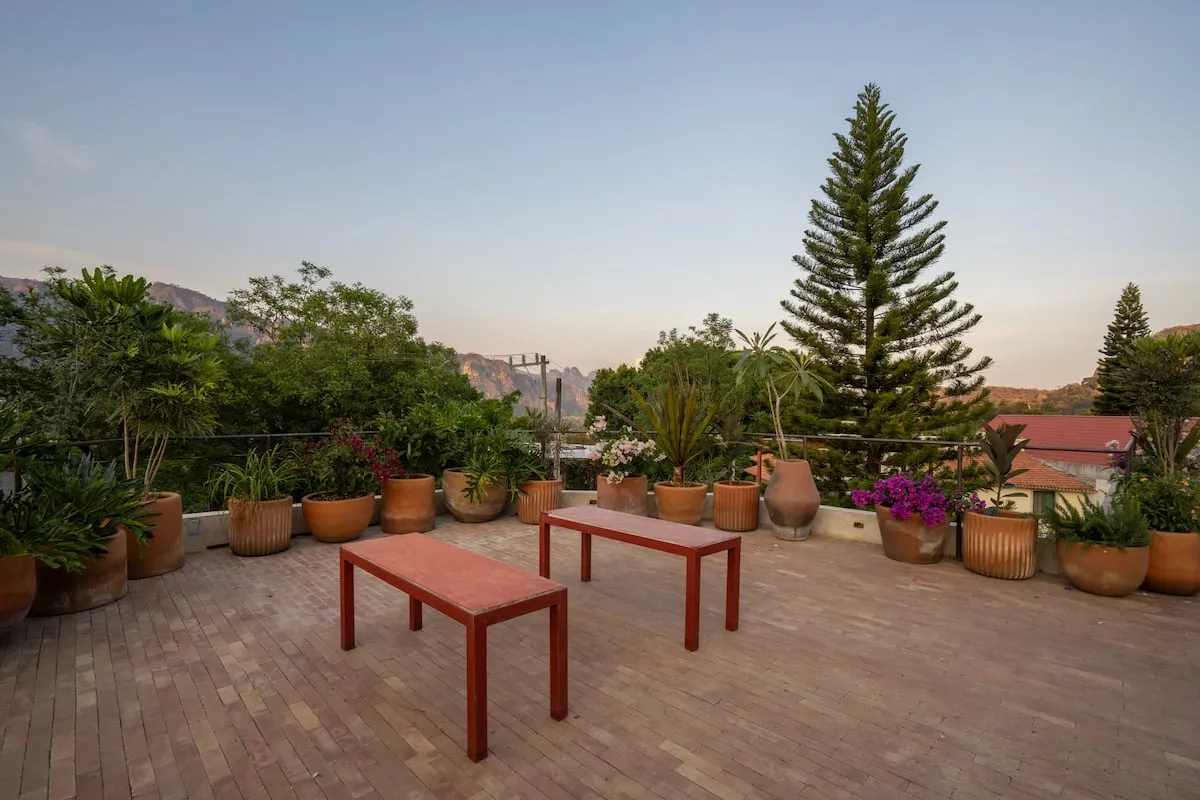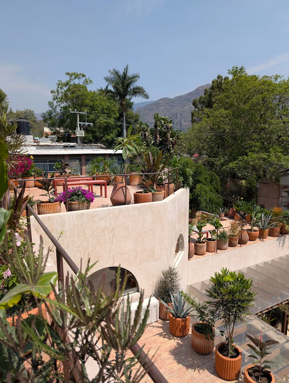 The home features lush terraces designed as vertical gardens, creating fresh and relaxing outdoor areas that embrace Tepoztlán’s unique climate.