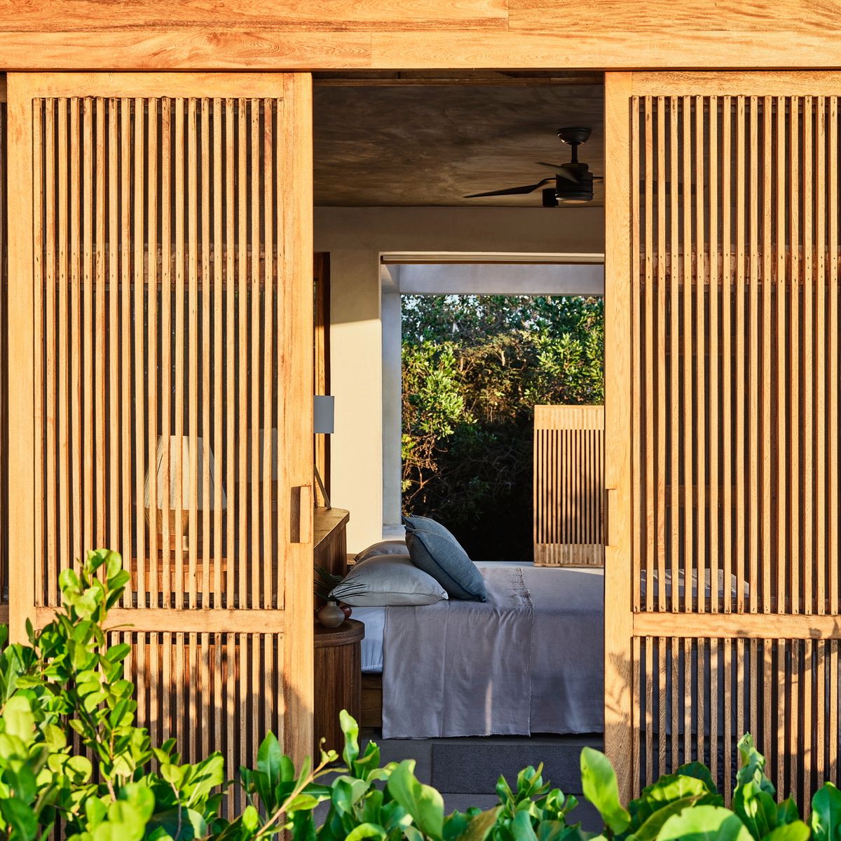 Master Bedroom 1 eoth sliding doors overlooking mangrove, ocean and pool. Private plunge pool. Desk with space to work. Double sink and rain shower.