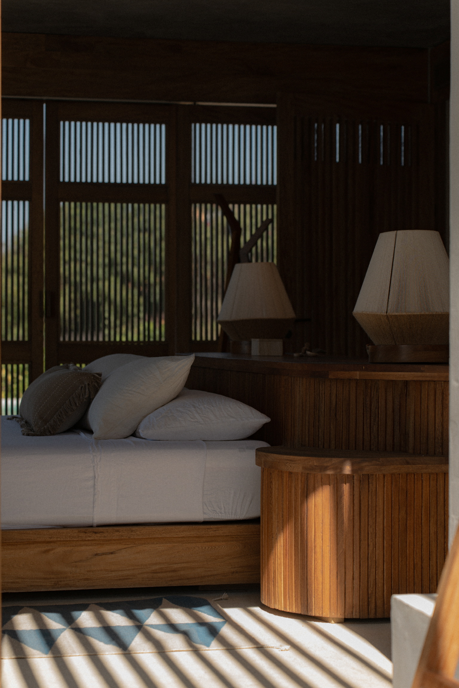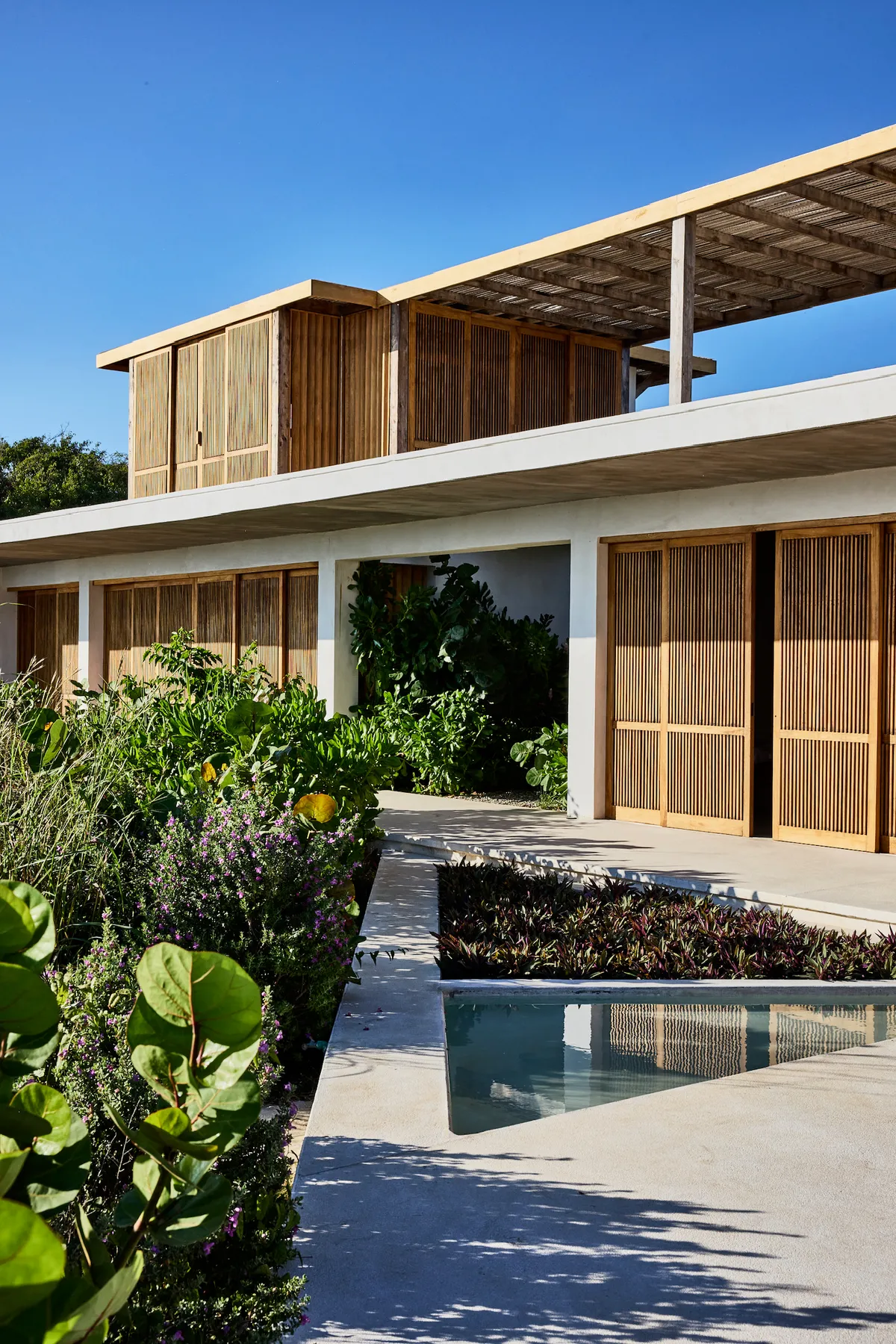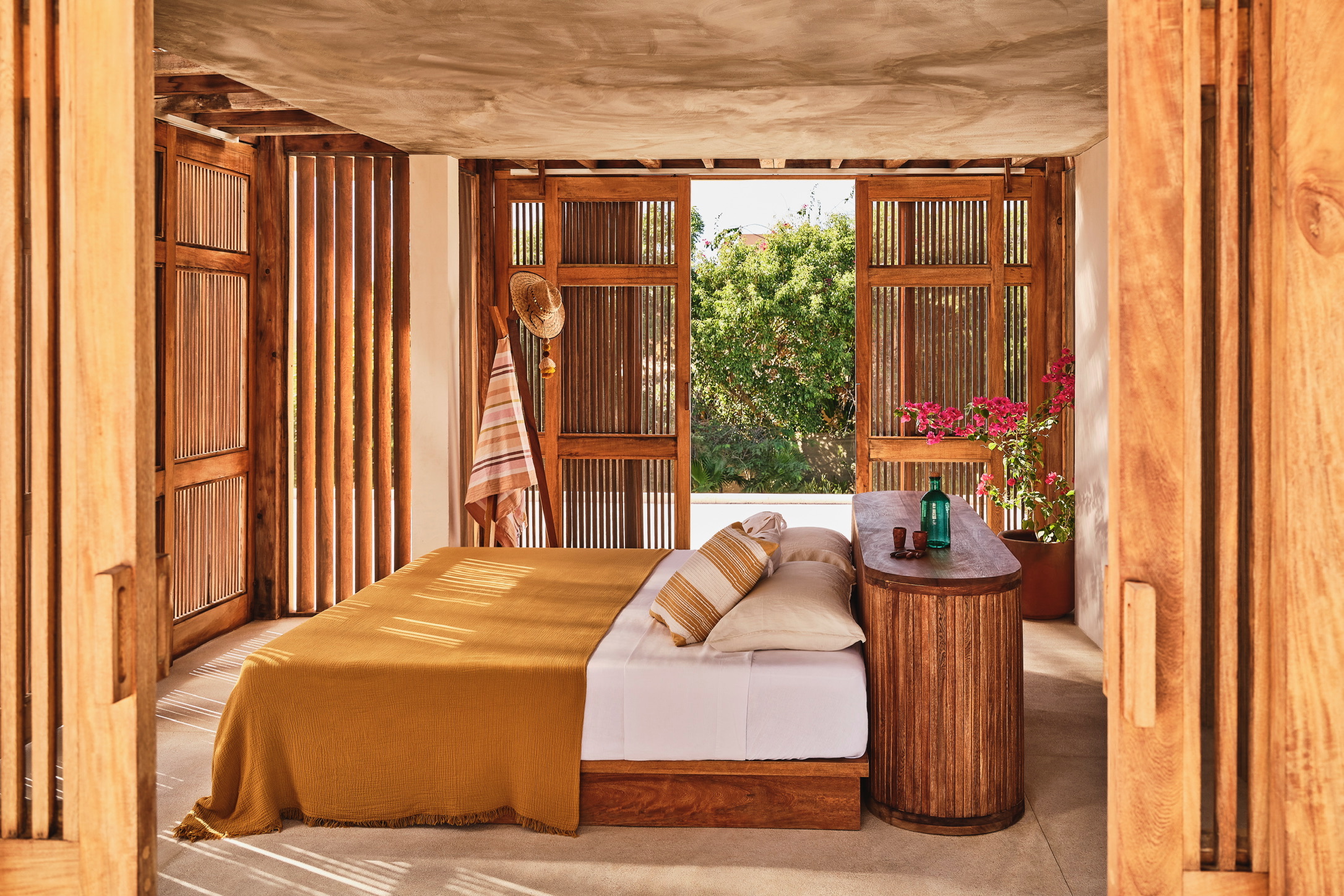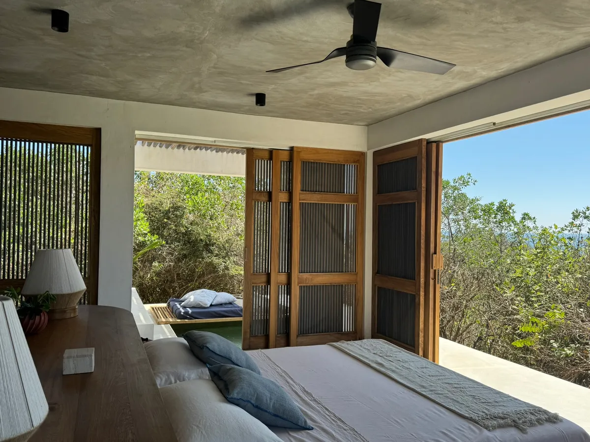 Master Bedroom 1 with sliding doors overlooking the mangrove, ocean, and pool. Private plunge pool. A desk with space to work. en suite bathroom, Double sink, and rain shower.