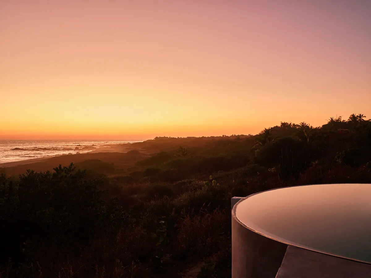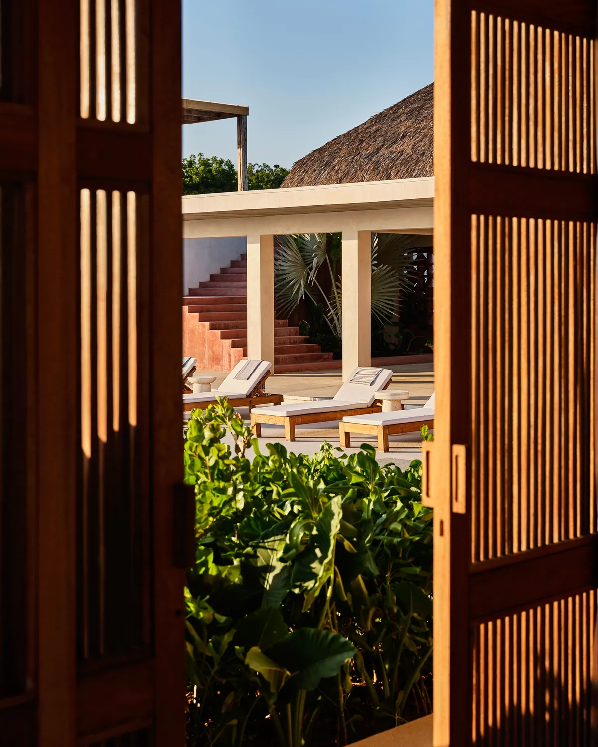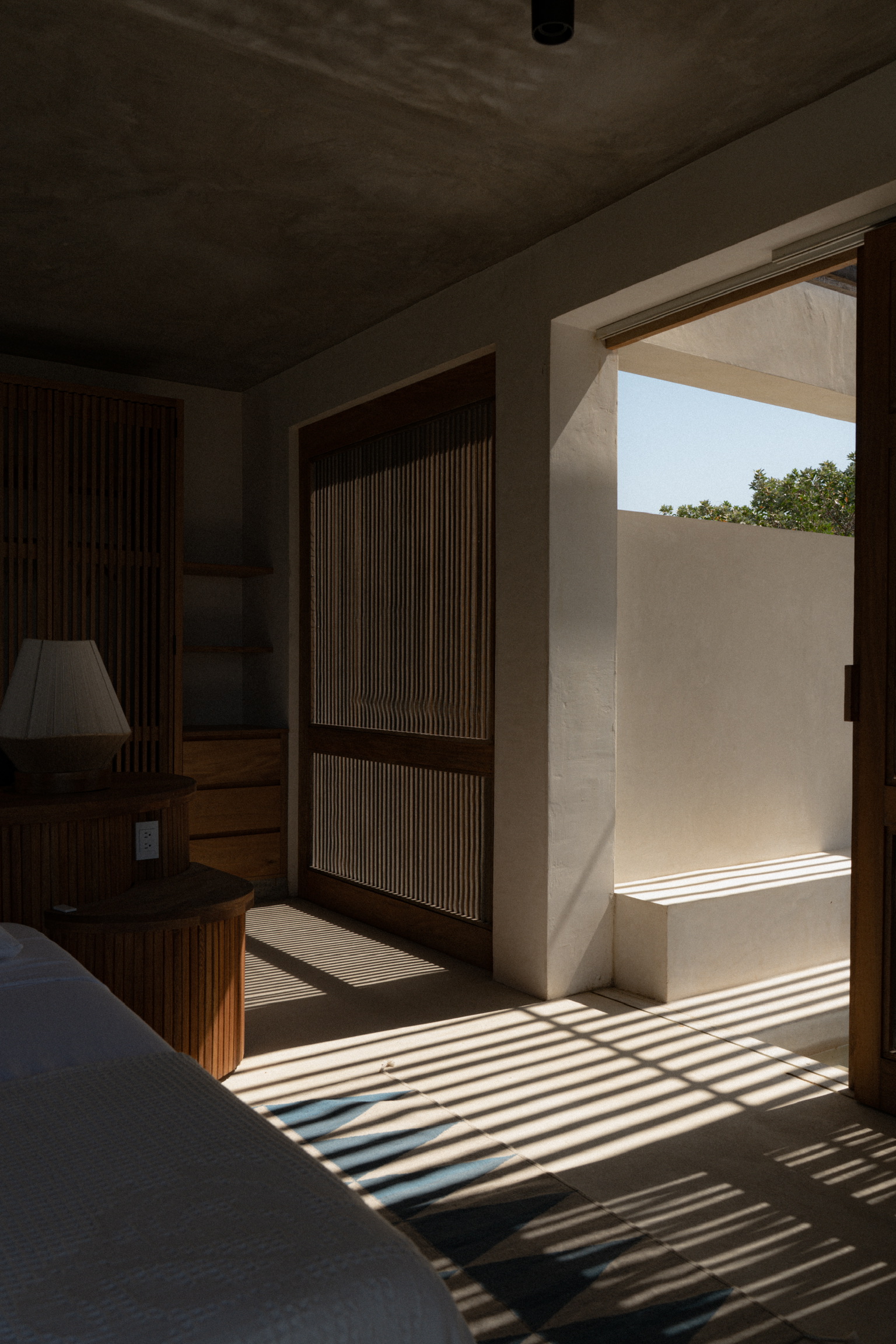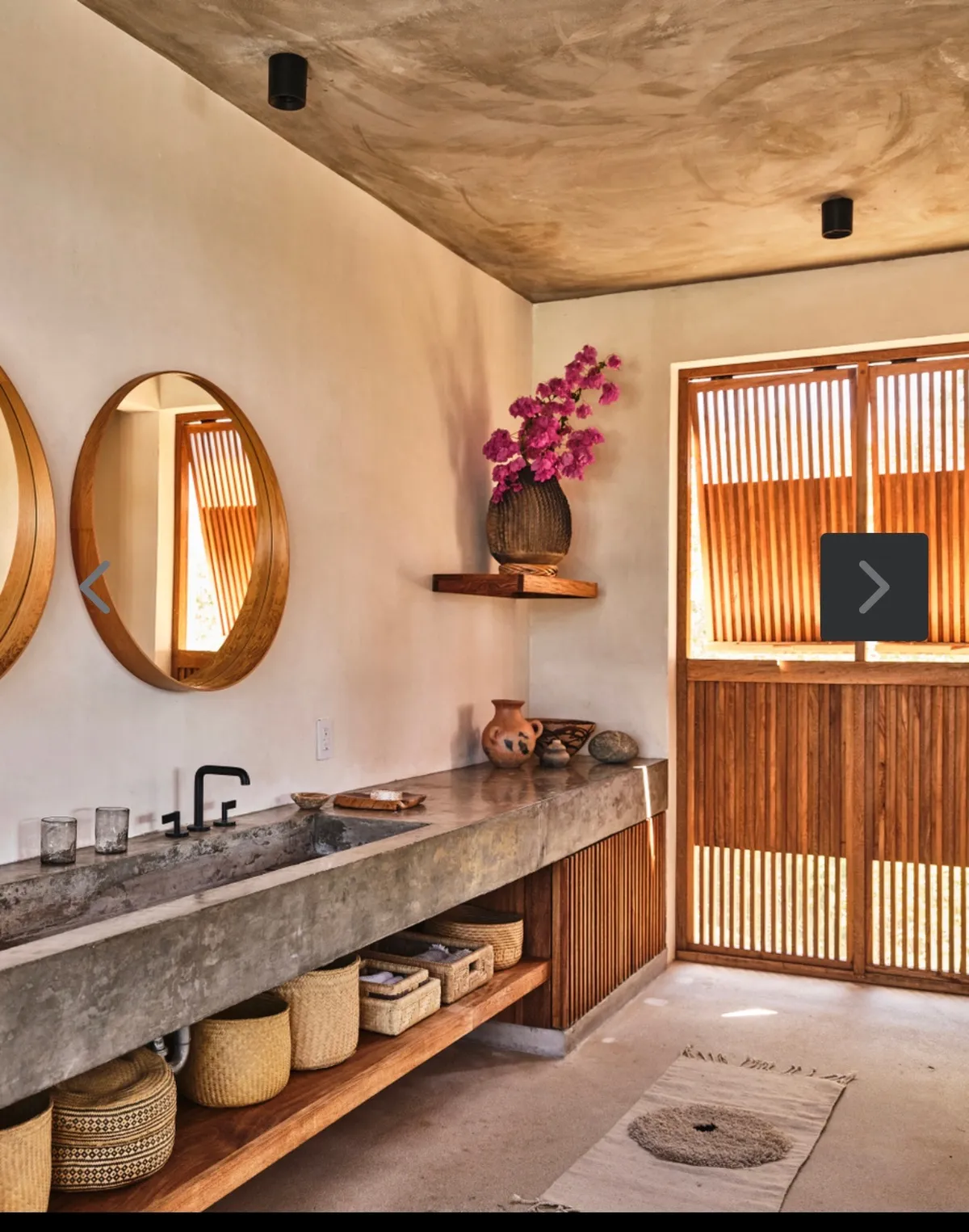 Master Bedroom 1 with sliding doors overlooking the mangrove, ocean, and pool. Private plunge pool. A desk with space to work. en suite bathroom, Double sink, and rain shower.