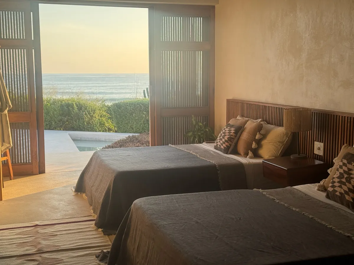 Double queen size beds . Sliding doors with ocean views. En suite bathroom.