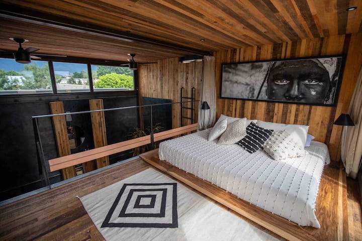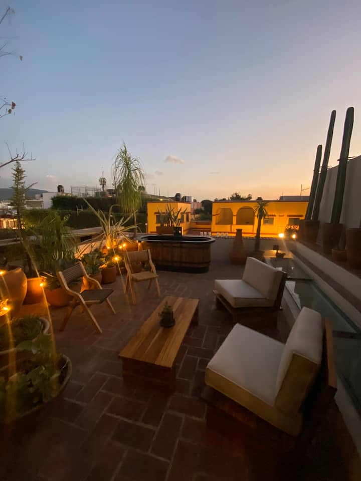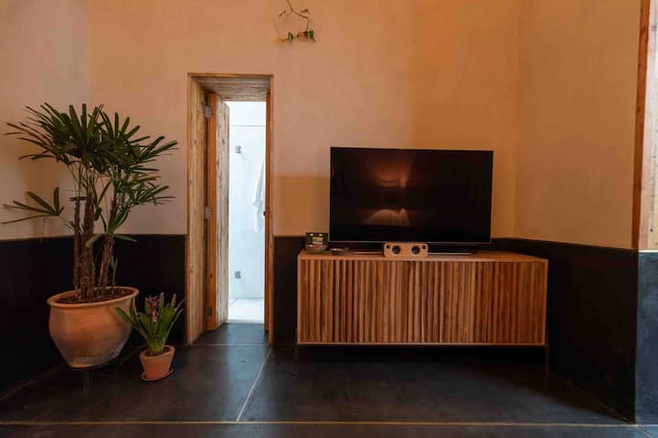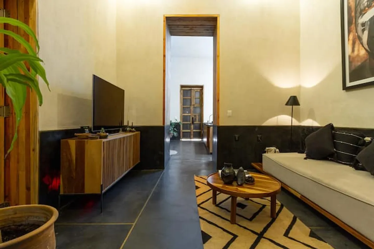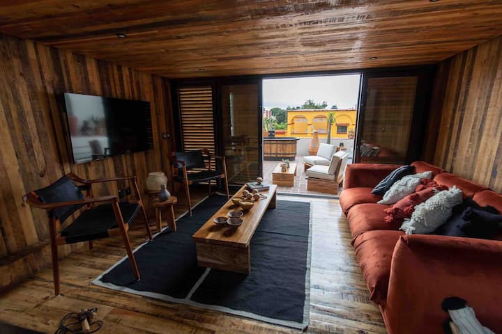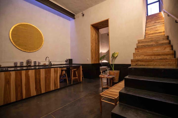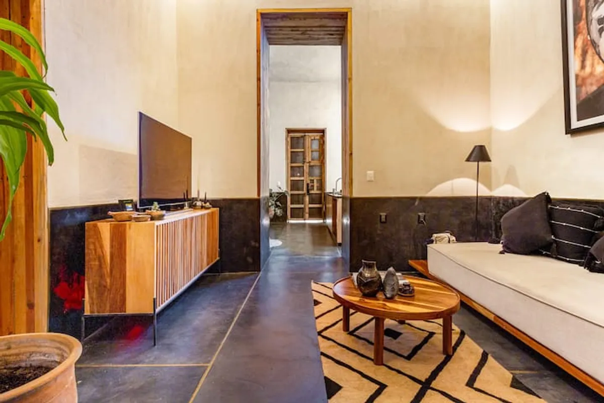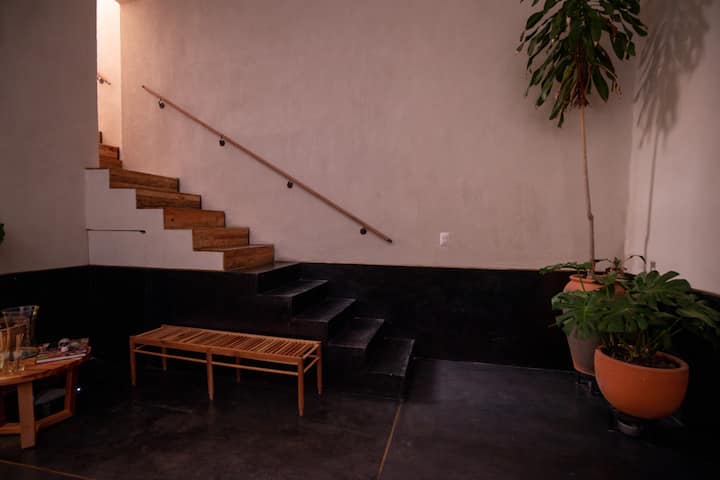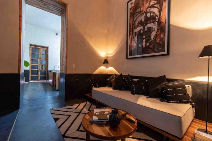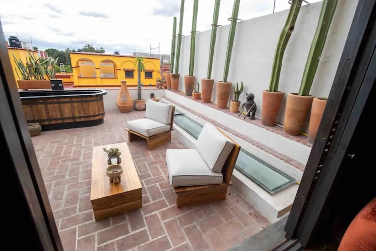 The home is spread across two levels; the ground floor is home to a sleek kitchen featuring a service bar, a cozy TV room with plush sofa, and a tranquil bedroom adorned with a king-size bed and complemented by a full bathroom. Ascend the stairs, and you're transported into a realm that's both strikingly different and deeply captivating. Here, you'll discover another spacious bedroom fitted with a king-size bed, a living room complete with a second TV and full bathroom, as well as a terrace boasting lounge furniture and a romantic bathtub designed for two. This enchanting abode places you just steps from an array of local attractions such as the ethnobotanical garden, museums, the majestic Santo Domingo church, artisan design shops, galleries, mezcalerias, and arguably the best restaurants in Oaxaca.