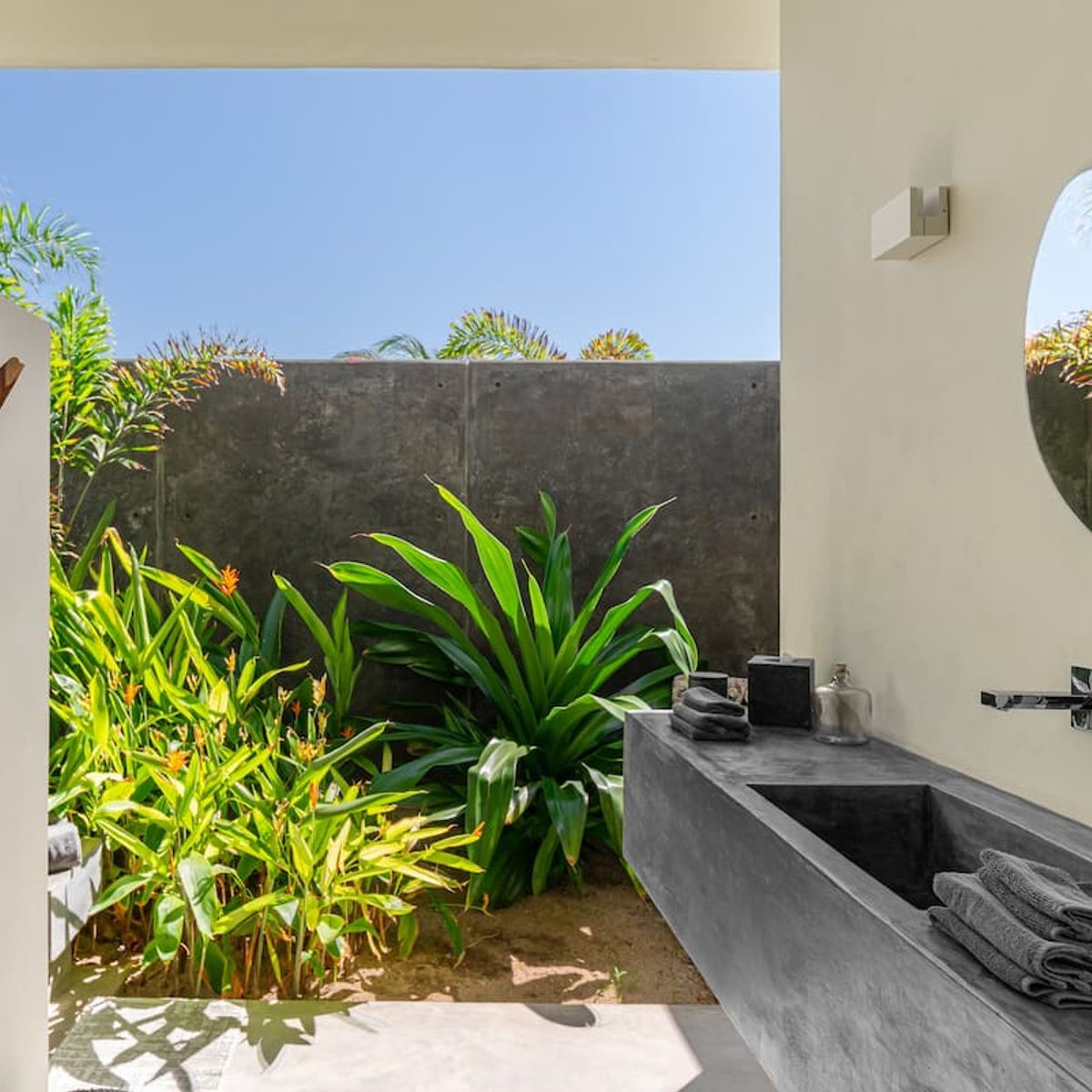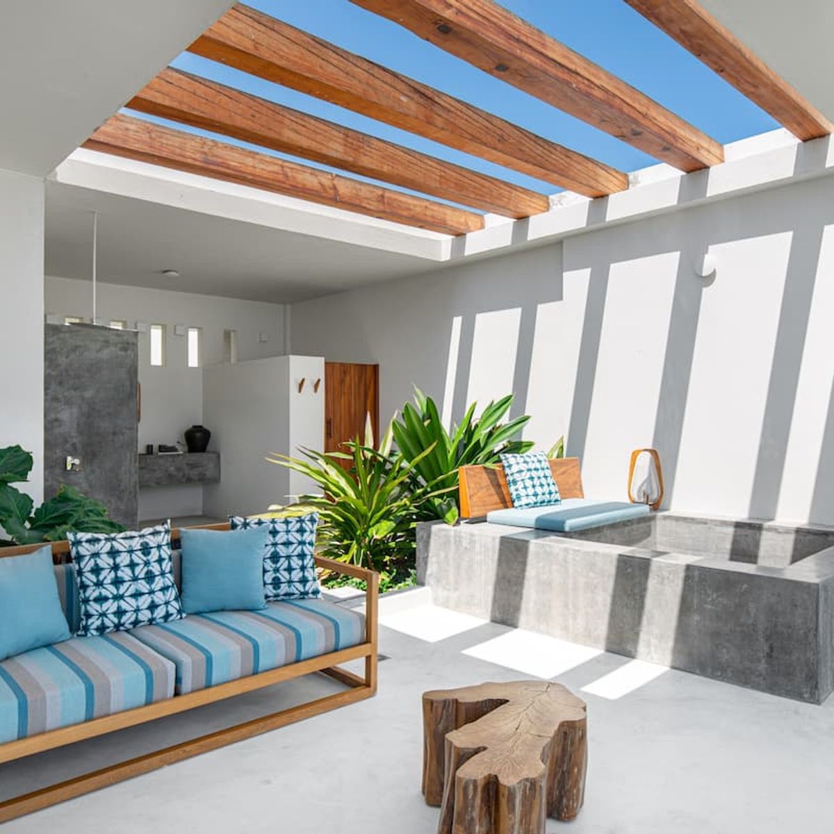 A quintessential beachfront villa with crisp white walls and parota wood accents, we love the way the property’s layout connects the interior to the outside; the upstairs terrace is partially shaded by sturdy wooden beams, while the bathrooms open out into the gardens, with strategically placed walls for total privacy.