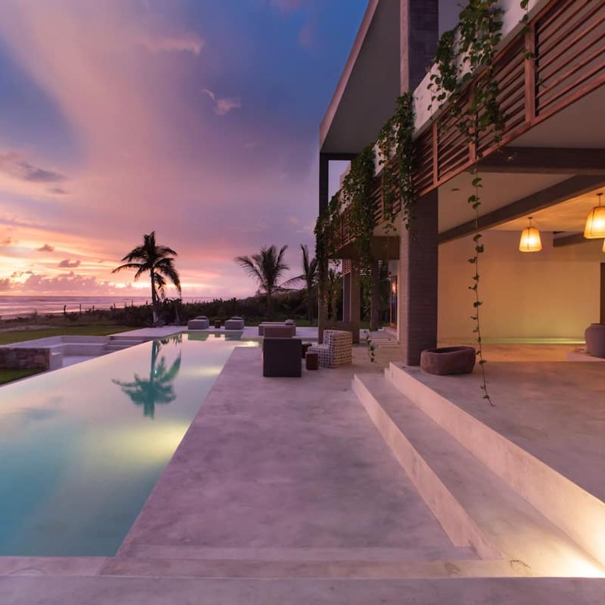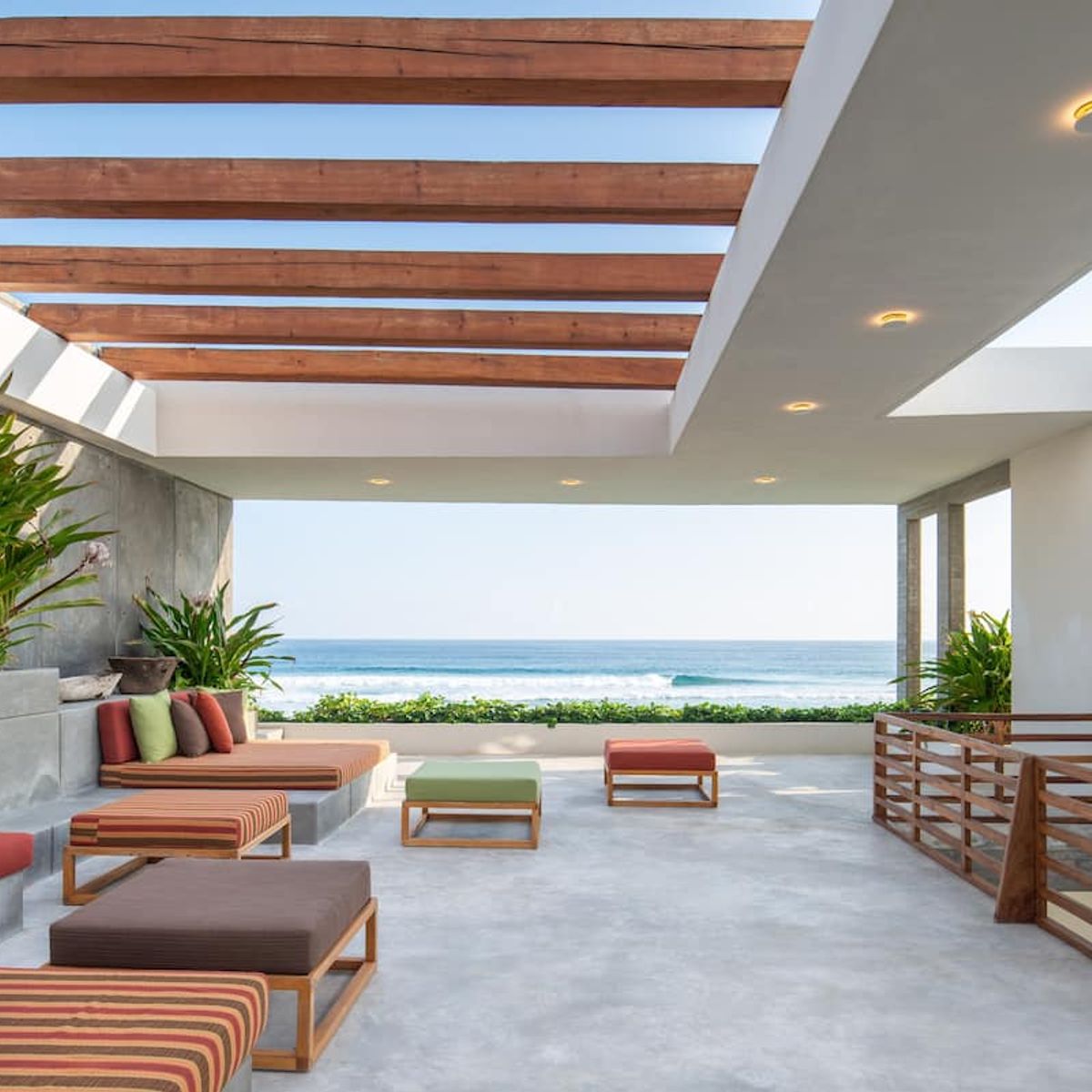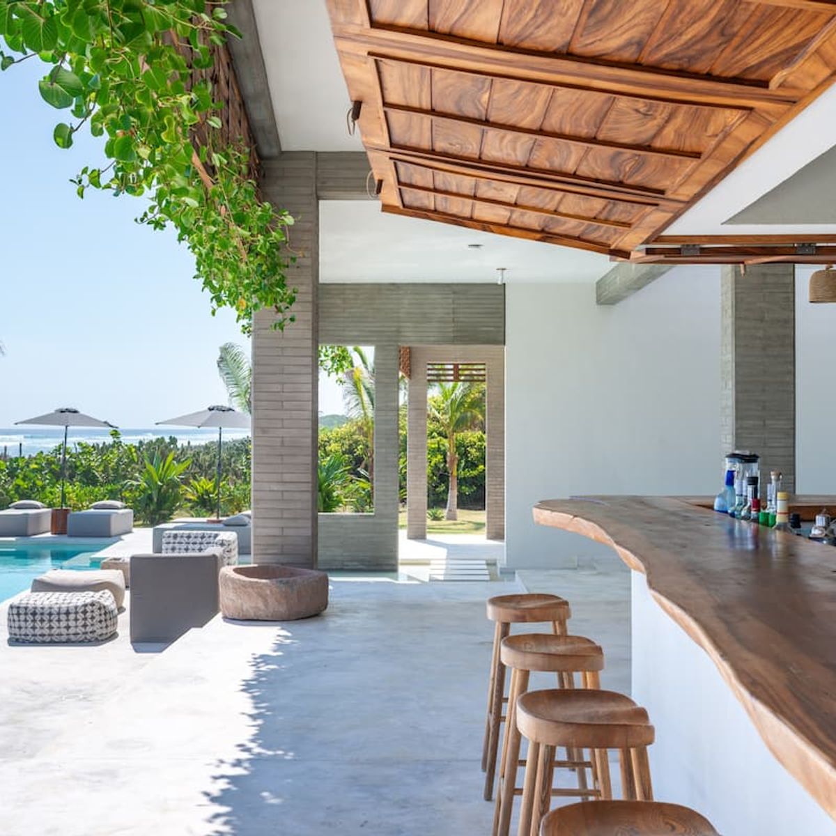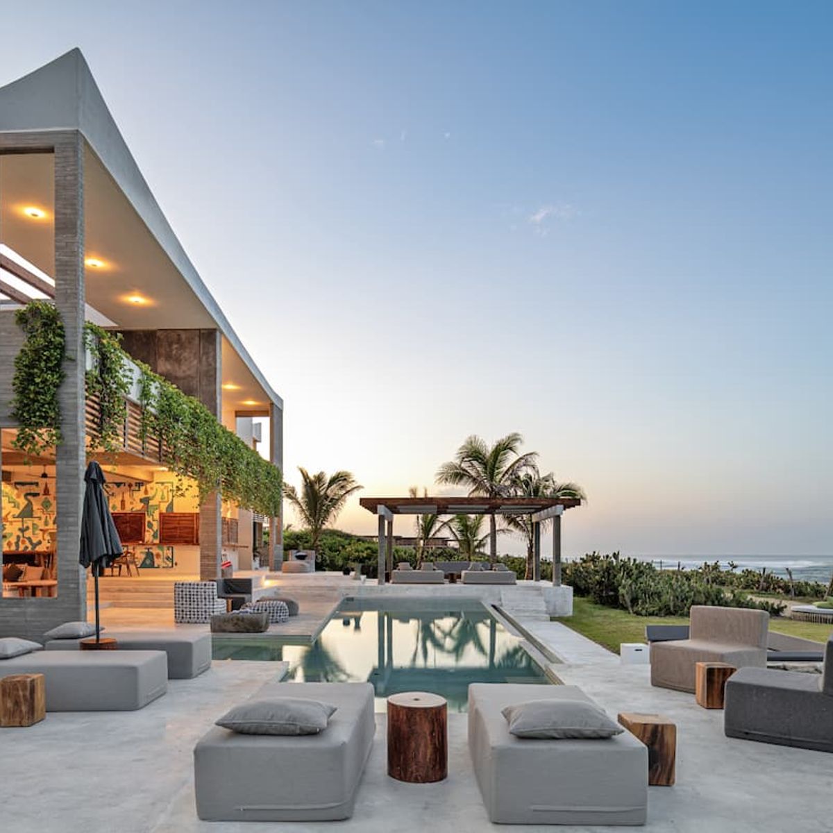 The villa's most impressive feature is its 3 swimming pools. The oceanfront infinity pool seems to almost connect with the Pacific, while the interior pool continues the interplay between indoors and out. Equally, the upstairs hot tub makes the property feel like something between a Oaxacan villa and Japanese sento.