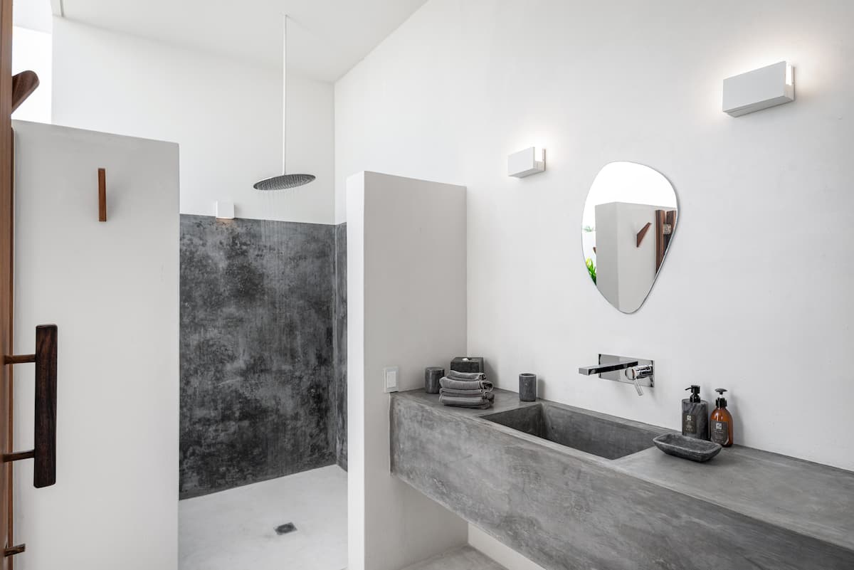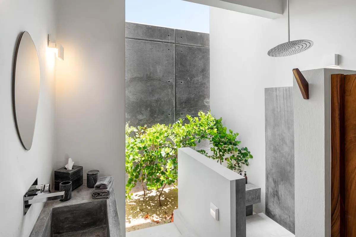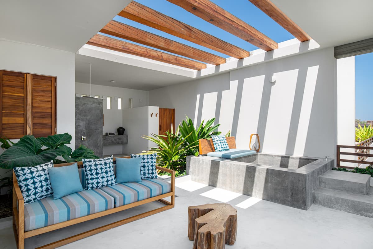 A quintessential beachfront villa with crisp white walls and parota wood accents, we love the way the property’s layout connects the interior to the outside; the upstairs terrace is partially shaded by sturdy wooden beams, while the bathrooms open out into the gardens, with strategically placed walls for total privacy.