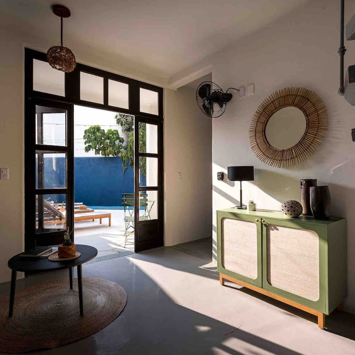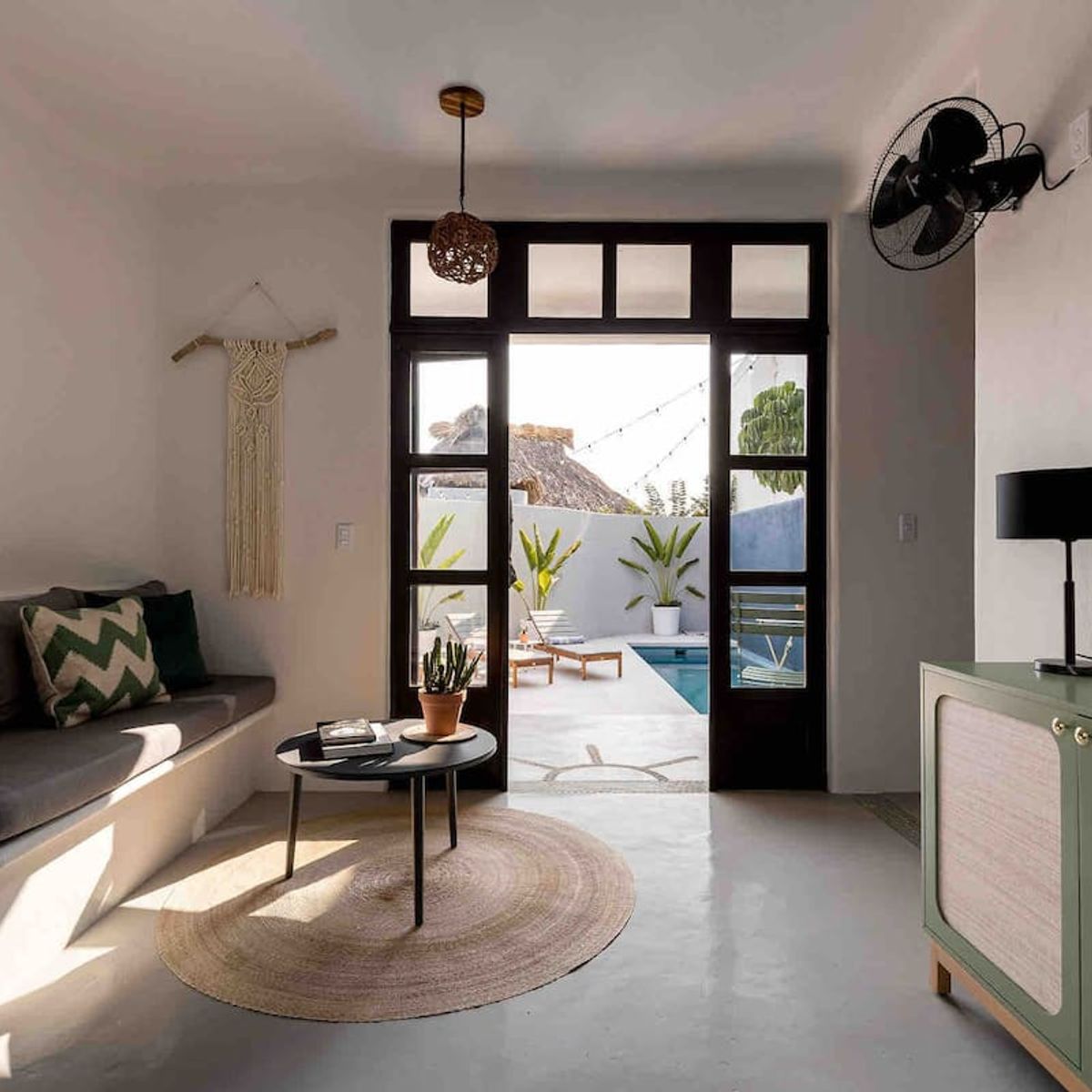 The courtyard is the heart of the home, with a private pool, sun loungers, palm trees, umbrellas, and bistro-style dining. Multiple lounge areas, an outdoor kitchen, and a BBQ invite relaxation and culinary creativity. High-speed Starlink internet is provided.