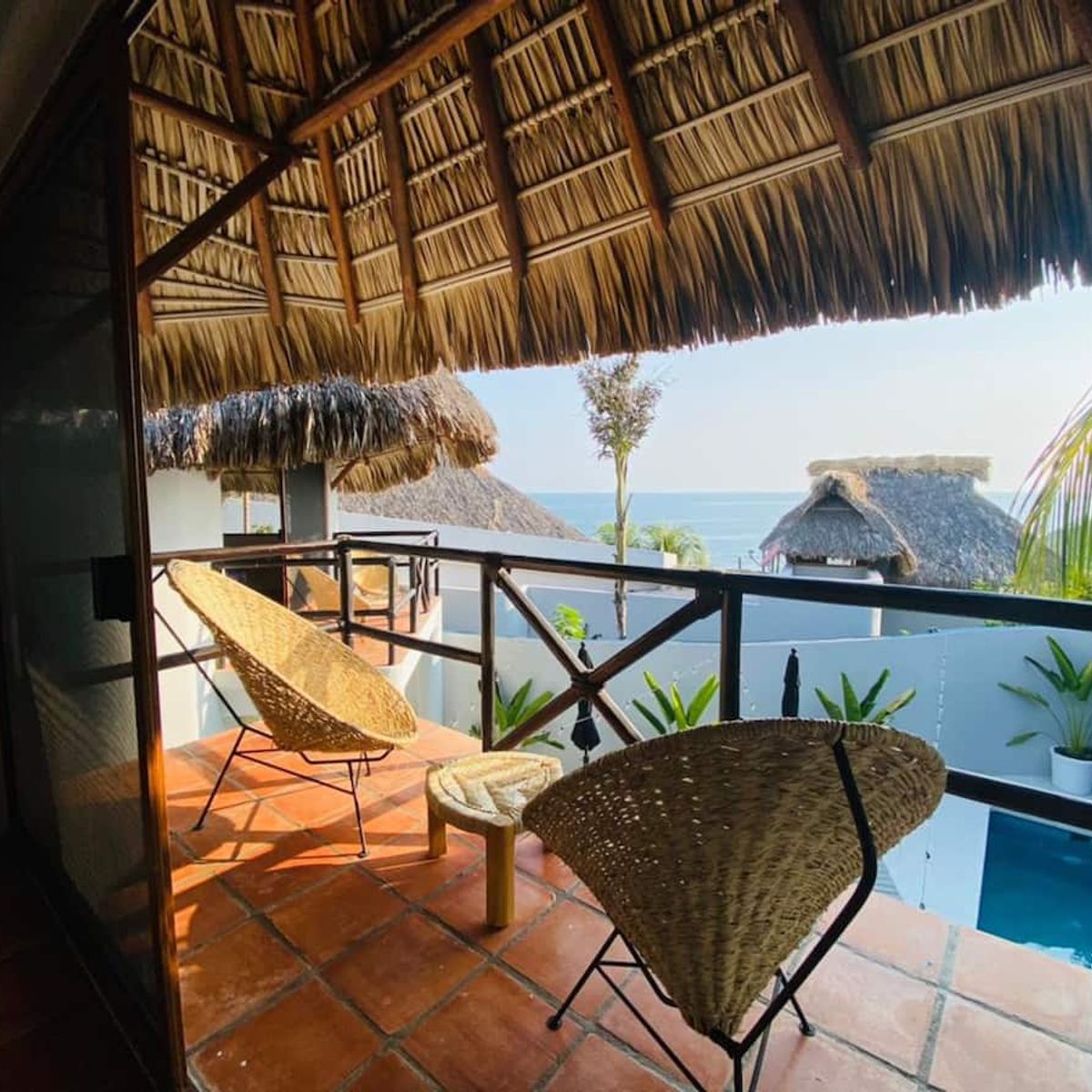 Each two-story casita offers a thoughtfully designed layout, with a kitchenette, cozy lounge, and bathroom on the ground floor. Upstairs, the master suite features a queen bed beneath a charming palapa roof, an expansive terrace, ample closet space, and sweeping Pacific views — all enjoyed from the comfort of an air-conditioned bedroom designed for true relaxation.