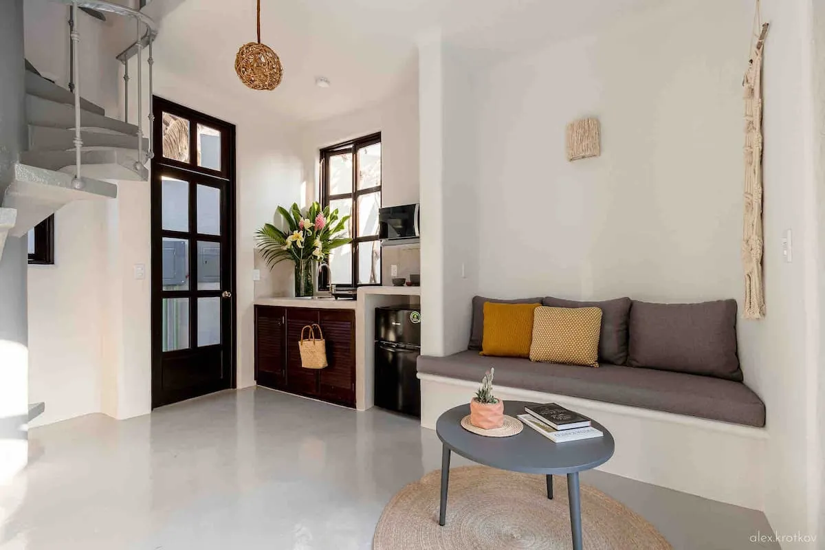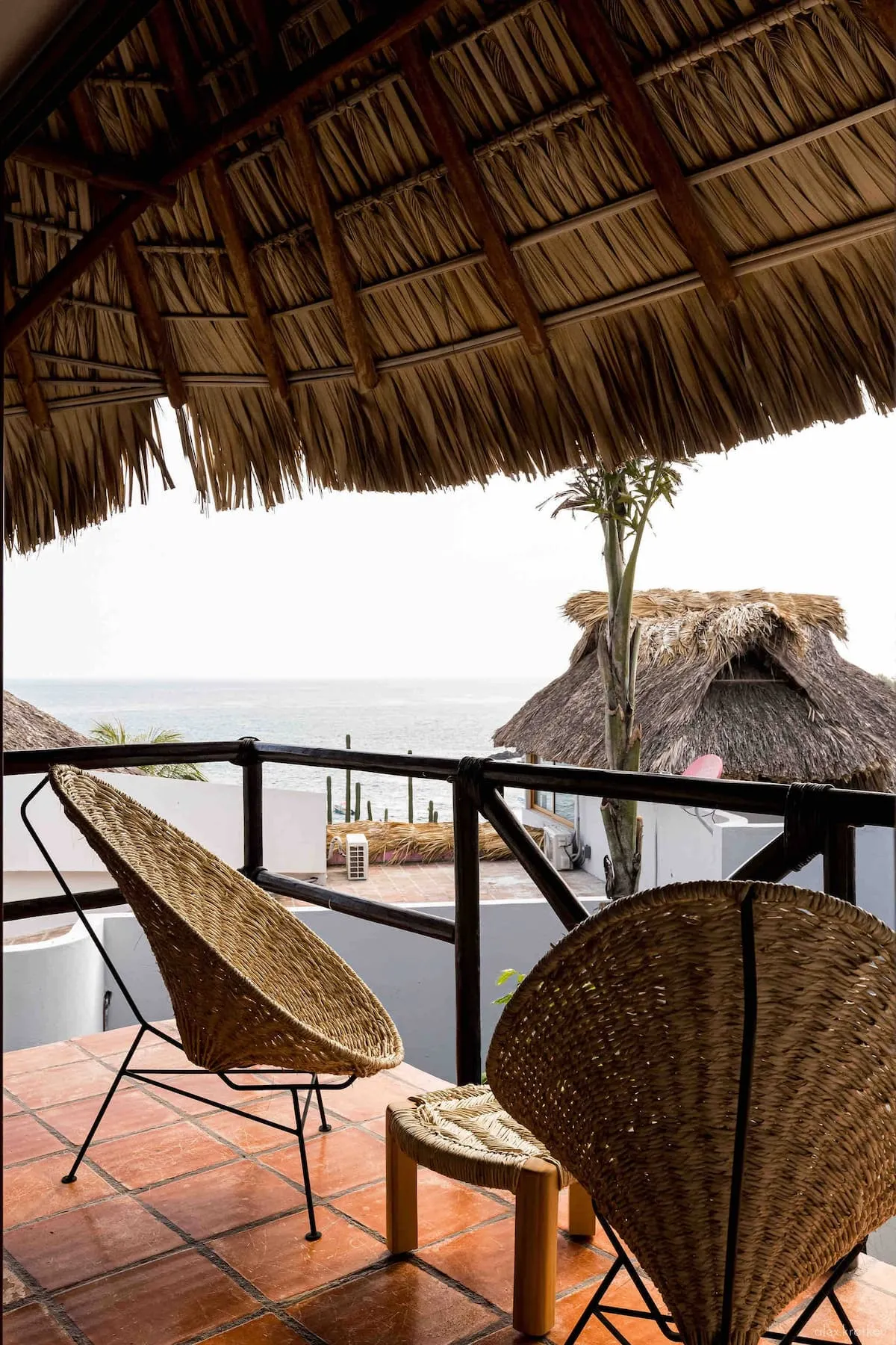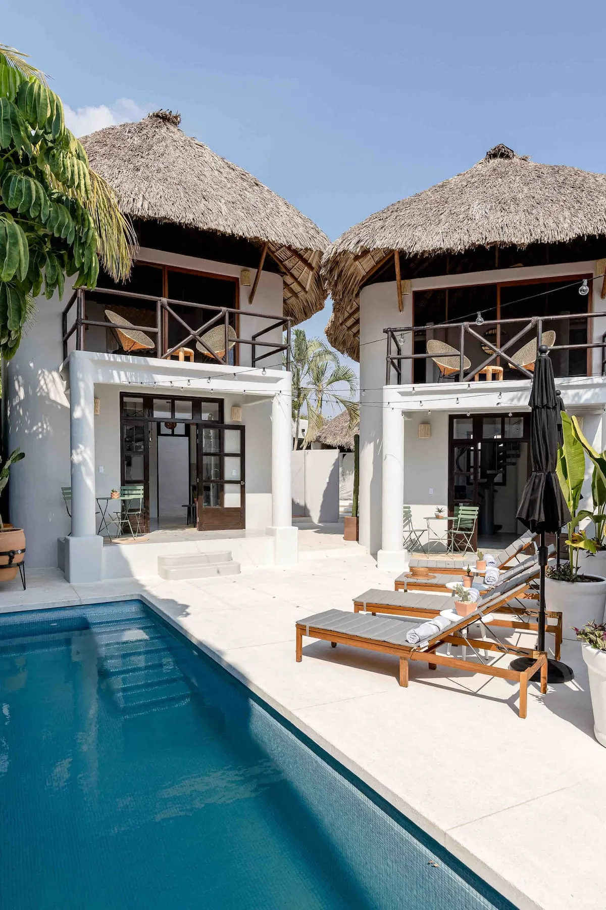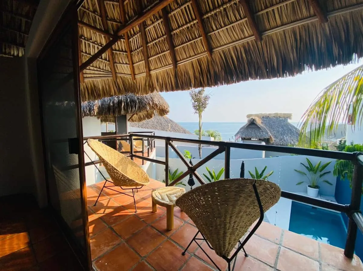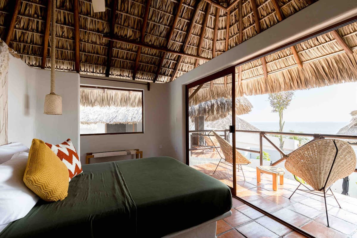 Each two-story casita offers a thoughtfully designed layout, with a kitchenette, cozy lounge, and bathroom on the ground floor. Upstairs, the master suite features a queen bed beneath a charming palapa roof, an expansive terrace, ample closet space, and sweeping Pacific views — all enjoyed from the comfort of an air-conditioned bedroom designed for true relaxation.