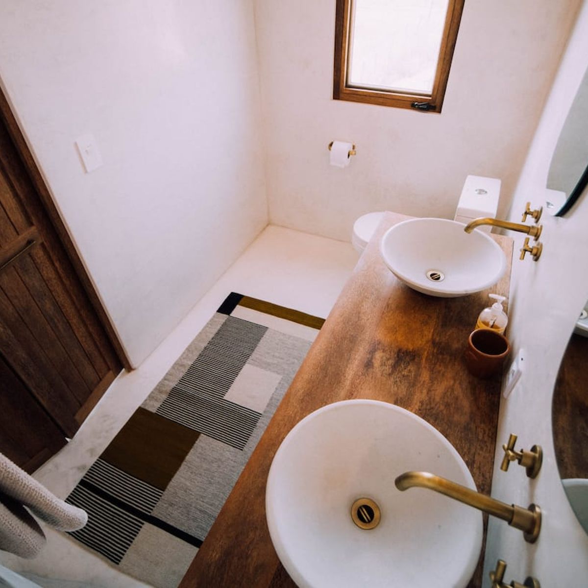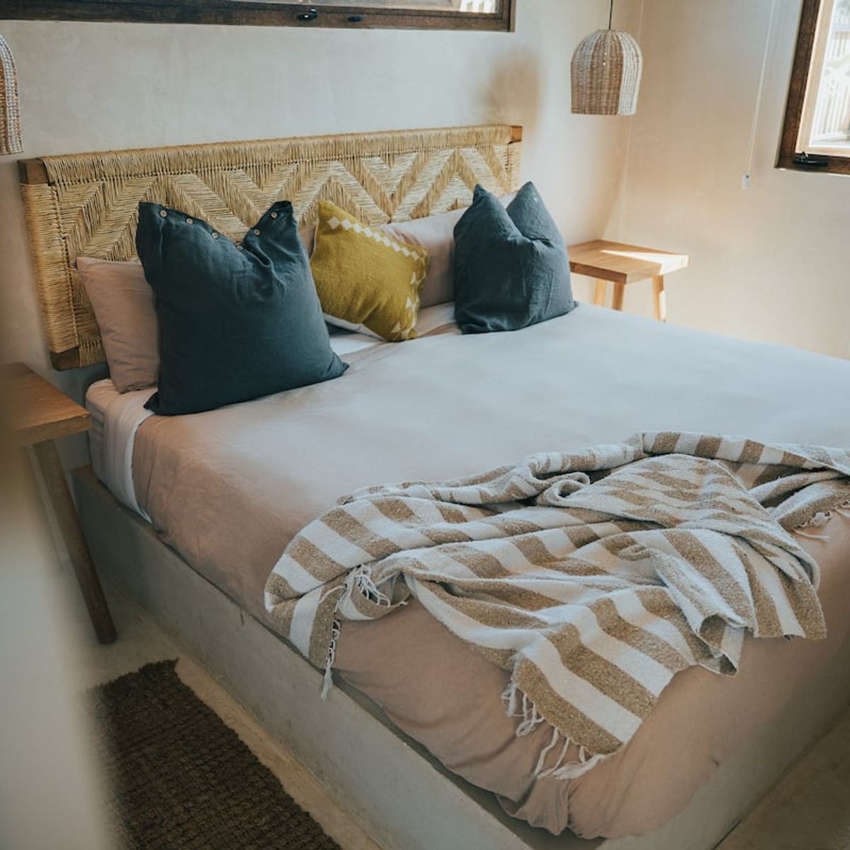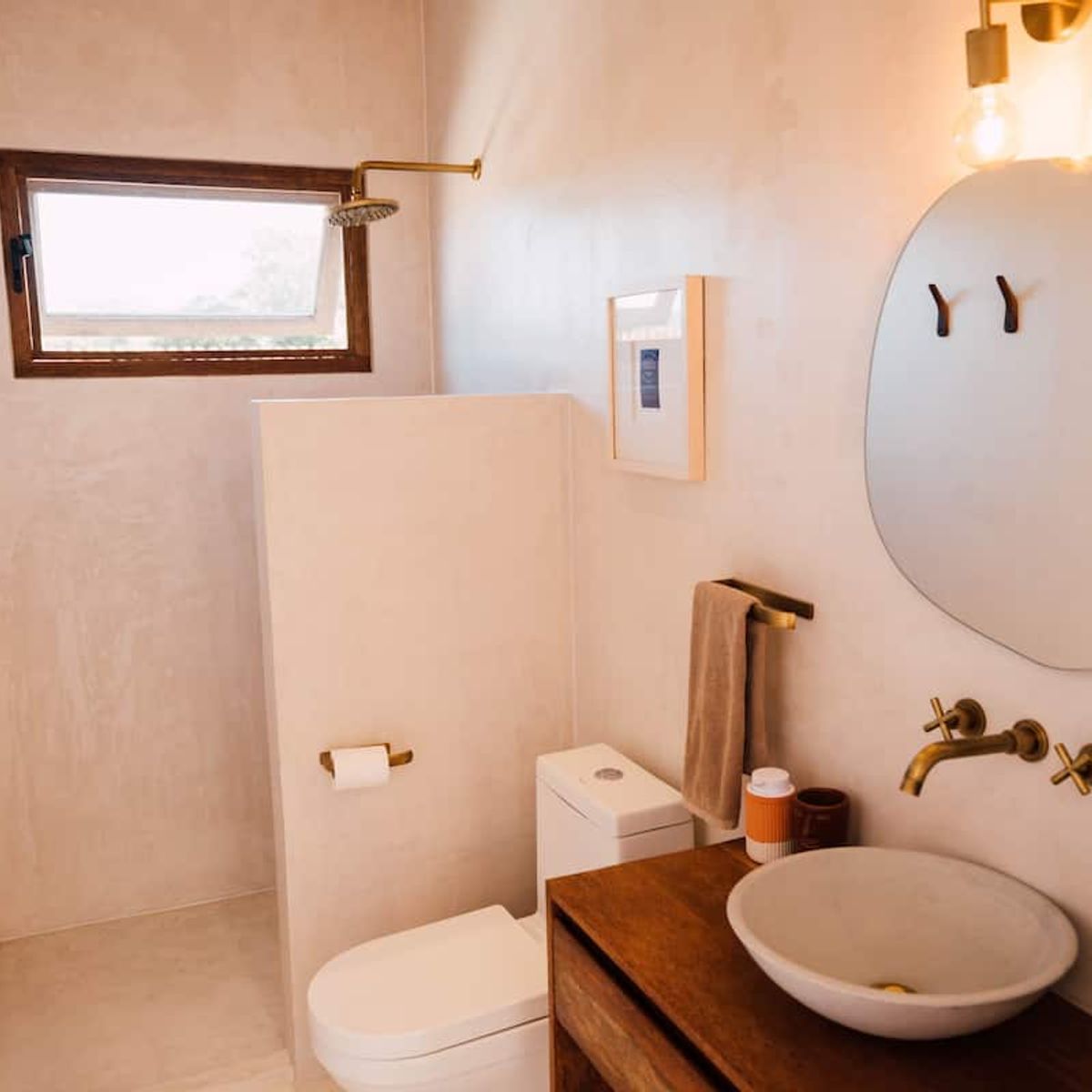 The open spaces are appointed with handcrafted wood furniture and ambient lighting, while natural breezes cool the palapa and bring relief from warm, humid days. Bedrooms are bright and comfortable, with screened windows and fans allowing guests to rest in fresh air. Air conditioning is available but operates on solar power, and therefore cannot run overnight. The villa’s thoughtful design and insulation ensure comfortable sleeping conditions through natural ventilation.