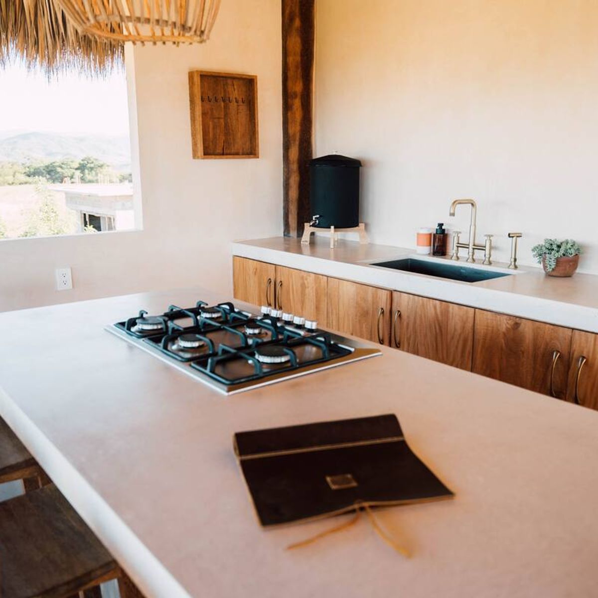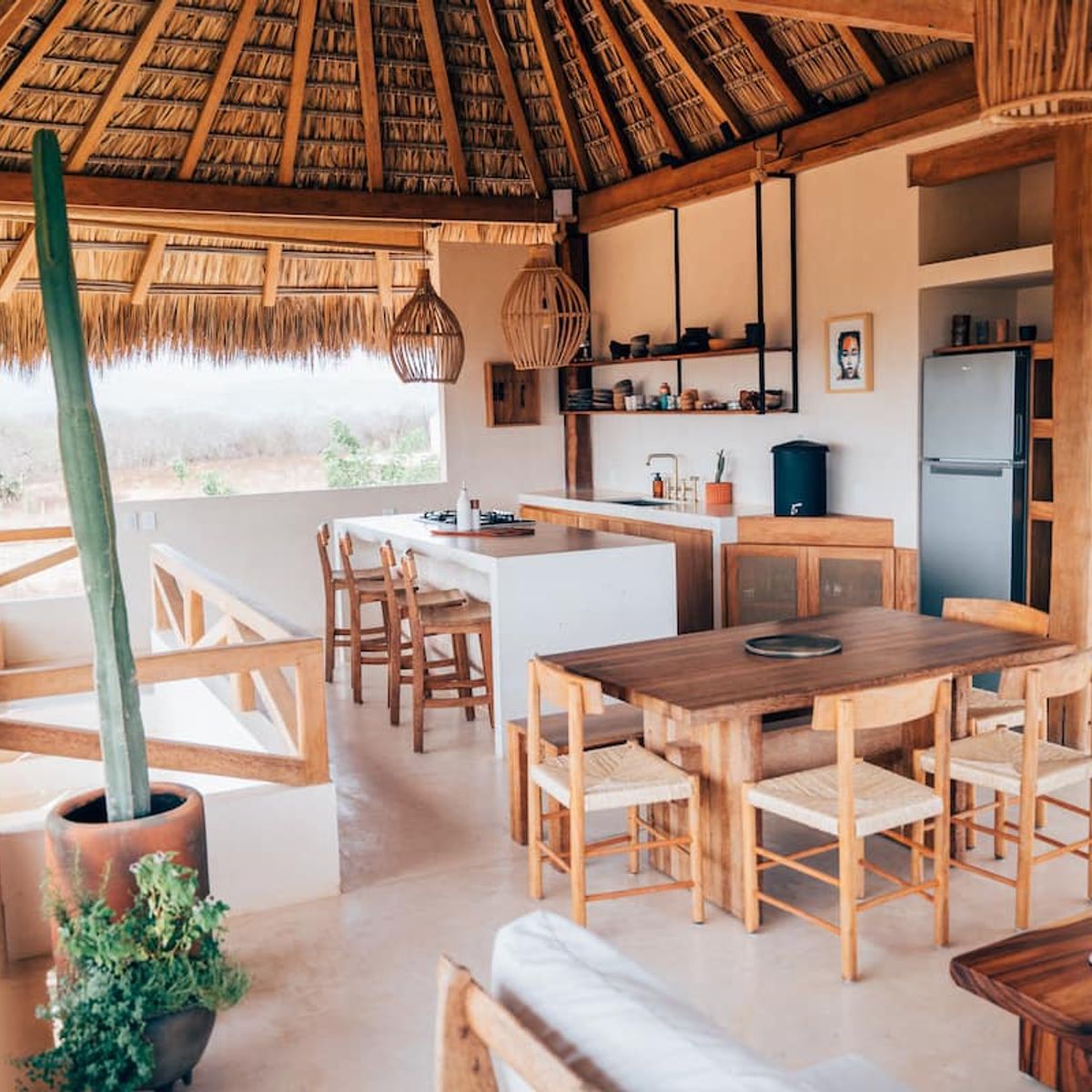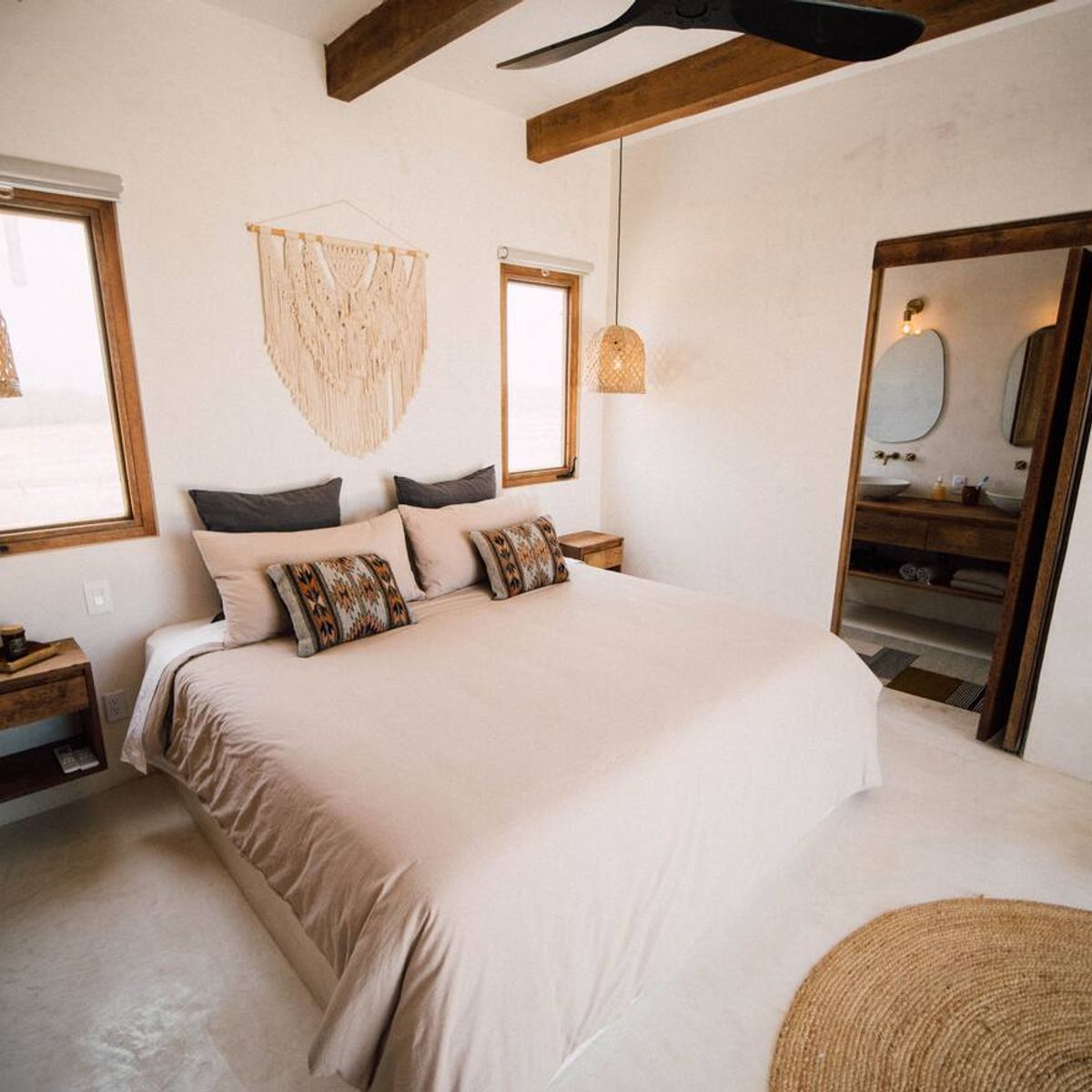 The villa features two fully equipped kitchens—one on the ground floor and one beneath the palapa—as well as two living and dining rooms, a pool, an outdoor shower, and spacious bedrooms with king beds, luxury cotton linens, and feather pillows. Every detail is designed to create a magical and restorative atmosphere.